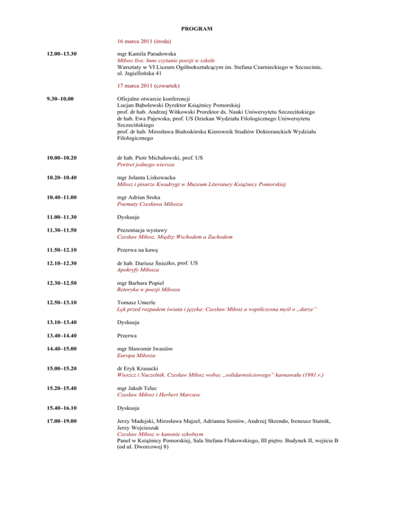 PROGRAM 16 marca 2011 (środa) 12.00–13.30 mgr Kamila