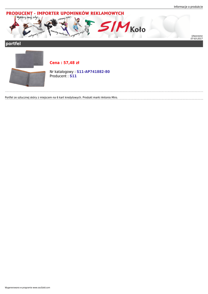 Informacje o produkcie Utworzono 07-03-2017 portfel Cena : 57,48 zł Nr katalogowy : S11-AP741882-80 Producent : S11 Portfel ze sztucznej skóry z miejscem na 6 kart kredytowych. Produkt marki Antonio Miro. Wygenerowano w programie www.oscGold.com