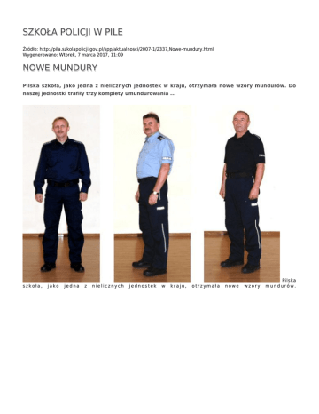 SZKOŁA POLICJI W PILE Źródło: http://pila.szkolapolicji.gov.pl/spp/aktualnosci/2007-1/2337,Nowe-mundury.html Wygenerowano: Wtorek, 7 marca 2017, 11:09 NOWE MUNDURY Pilska szkoła, jako jedna z nielicznych jednostek w kraju, otrzymała nowe wzory mundurów. Do naszej jednostki trafiły trzy komplety umundurowania ... szkoła, jako jedna z nielicznych jednostek w kraju, otrzymała nowe wzory Pilska mundurów. Do naszej jednostki trafiły trzy komplety umundurowania i od piątku (przez okres dwóch miesięcy) testowane są przez policjantów realizujących zadania służbowe w terenie, a zatem mundury te narażone będą na niesprzyjające warunki atmosferyczne. W odróżnieniu od obecnie używanych, nowe mundury różnią się kolorem, krojem i rodzajem użytej tkaniny. Opinie policjantów, którzy je noszą, trafią do Komendy Głównej Policji, gdzie zostanie podjęta decyzja w sprawie tego, czy i kiedy mundury te zastąpią obecnie noszone. (18.09.07) Ocena: 0/5 (0) Tweetnij