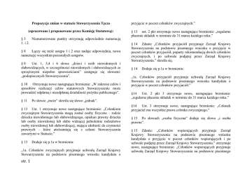 Propozycje zmian w statucie Stowarzyszenia Tęcza (opracowane i proponowane przez Komisję Statutową): §3 Nienumerowane punkty otrzymują odpowiednio numerację 1. i 2. §8 Łączy się treść ustępu 1 i 2 oraz nadaje odpowiednia, nowa numeracje wszystkim pozostałych ustępów. §8 Ust. 1, 3,4 i 6 słowa „dzieci i osób niewidomych i słabowidzących, w szczególności niewidomych i słabowidzących ze sprzężonymi niepełno sprawnościami” zastępuje się słowami: „podopiecznych Stowarzyszenia”. § 10 Otrzymuje nowe następujące brzmienie: „W zakresie celów i sposobów realizacji celów statutowych Stowarzyszenie może prowadzić odpłatną i nieodpłatną działalność pożytku publicznego”. § 11 Po słowie „może” skreśla się słowo „jednak”. § 13 Ust. 1 otrzymuje nowe następujące brzmienie: „Członkiem zwyczajnym Stowarzyszenia mogą zostać osoby fizyczne – rodzic dziecka niewidomego lub słabowidzącego, opiekun prawny dziecka lub osoby niewidomej lub słabo widzącej pełnoletnie rodzeństwo osoby niewidomej lub słabowidzącej, mająca zdolność do czynności prawnych – które utożsamiają się z celami Stowarzyszenia zawartymi w Statucie.” § 13 Dodaje się p.1a w brzmieniu: „1a. Członków zwyczajnych przyjmuje uchwałą Zarząd Krajowy Stowarzyszenia na podstawie pisemnego wniosku kandydata o str. 1 przyjęcie w poczet członków zwyczajnych.” § 13 ust. 2 pkt otrzymuje nowe następujące brzmienie: „regularne płacenie składek w terminie do 31 marca każdego roku.” § 14 Zdanie „Członków przyjaciół przyjmuje Zarząd Krajowy Stowarzyszenia na podstawie pisemnego wniosku o przyjęcie w poczet członków przyjaciół, poparty rekomendacją dwóch członków zwyczajnych, i po uchwale podjętej przez Zarząd Krajowy Stowarzyszenia.” skreśla się. § 14 Dodaje się p.1a w brzmieniu: „1a. Członków przyjaciół przyjmuje uchwałą Zarząd Krajowy Stowarzyszenia na podstawie pisemnego wniosku kandydata o przyjęcie w poczet członków przyjaciół.” §14 Ust. 2 pkt 3 otrzymuje nowe, następujące brzmienie: „regularne płacenie składek w terminie do 31 marca każdego roku.” §14 Ust. 3 otrzymuje nowe, następujące brzmienie: „Członek przyjaciel ma wszystkie prawa członka zwyczajnego.” § 15 Po słowach „osoba fizyczna” dodaje się słowa „i osoba prawna”. § 15 Zdanie: „Członków wspierających przyjmuje Zarząd Krajowy Stowarzyszenia na podstawie pisemnego wniosku kandydata o przyjęcie w poczet członków wspierających i po uchwale podjętej przez Zarząd Krajowy Stowarzyszenia.” otrzymuje nowe, następujące brzmienie: „Członków wspierających przyjmuje uchwałą Zarząd Krajowy Stowarzyszenia na podstawie pisemnego wniosku kandydata o przyjęcie w poczet członków wspierających.”. 1) dobrowolne wystąpienie, 2) wykluczenie z grona członków przez Zarząd Krajowy na wniosek Sądu Koleżeńskiego, 3) skreślenie z listy członków na mocy uchwały Zarządu Krajowego za niepłacenie składek członkowskich, pomimo bezskutecznego upływu 30 dniowego terminu do zapłaty wyznaczonego przez Zarząd Stowarzyszenia. 4) skazania prawomocnym wyrokiem sądu powszechnego pozbawienia praw publicznych. 5) śmierć członka.” § 15 Dodaje się punkt 2. w brzmieniu następującym: „2. Członkiem wspierającym może być małoletni poniżej 16 lat, za zgodą przedstawicieli ustawowych bez prawa udziału w głosowaniach na zebraniach Walnego Zgromadzenia Członków Stowarzyszenia (Oddziału) oraz bez prawa do korzystania z biernego i czynnego prawa wyborczego do władz Stowarzyszenia.” § 15 Dodaje się punkt 3. w brzmieniu następującym: „3. Członkiem wspierającym może być małoletni w wieku od 16 do 18 lat bez prawa do korzystania z biernego i czynnego prawa wyborczego do władz Stowarzyszenia. § 21 otrzymuje nowe, następujące brzmienie: „Zarząd może na indywidualny, umotywowany przez członka lub pracownika socjalnego wniosek, zwolnić go z obowiązku płacenia składek lub zamienić składki na inne równoważne świadczenia.”. § 15 Dotychczasowy punkt 2. otrzymuje numerację 4. § 22 otrzymuje brzmienie następujące: § 15 Dotychczasowy punkt 3. otrzymuje numerację 5. 1. Władzami Stowarzyszenia ogólnokrajowego są: 1) Walne Zgromadzenie Członków, 2) Zarząd Krajowy, 3) Krajowa Komisja Rewizyjna, 4) Sąd Koleżeński. § 15 Ust. 5. pkt 4) skreśla się. § 16 Skreśla się, zaś kolejne paragrafy otrzymują odpowiednia nowa numerację. § 18 ust. 1 i 2 skreśla się, zaś ust. 3. pozostaje bez numeru. § 23 otrzymuje brzmienie (oraz dokonuje się zmian zaznaczonych na czerwono i podkreślonych): §19 Nienumerowane punkty otrzymują numerację 1 i 2. 1. § 20 otrzymuje nowe, następujące brzmienie: 2. „Utrata członkostwa w Stowarzyszeniu następuje poprzez: str. 2 Walne Zgromadzenie Członków jest najwyższą władzą Stowarzyszenia i zbiera się, co najmniej raz do roku, nie później niż do końca czerwca. Walne Zgromadzenie Członków może być zwyczajne lub nadzwyczajne. 3. 4. 5. 6. Nadzwyczajne Walne Zgromadzenie Członków może zostać zwołane z inicjatywy Zarządu Krajowego, Krajowej Komisji Rewizyjnej lub na wniosek co najmniej 1/4 ogólnej liczby członków Stowarzyszenia. Nadzwyczajne Walne Zgromadzenie Członków zwołuje Zarząd Krajowy w terminie do 30 dni od dnia złożenia wniosku i obraduje nad sprawami, dla których zostało zwołane. O terminie, miejscu i proponowanym porządku obrad Walnego Zgromadzenia Członków Zarząd zawiadamia członków co najmniej 21 dni przed terminem w sposób określony w regulaminie obrad. W wypadku przekroczenia przez Stowarzyszenie liczby 300 członków zebranie Walnego Zgromadzenia Członków jest zebraniem delegatów. Delegatami Oddziałów są: Prezes Zarządu Oddziału i delegaci wybrani przez Walne Zgromadzenie Członków Oddziału, w liczbie ustalonej przez Zarząd Krajowy, proporcjonalnie do ilości 