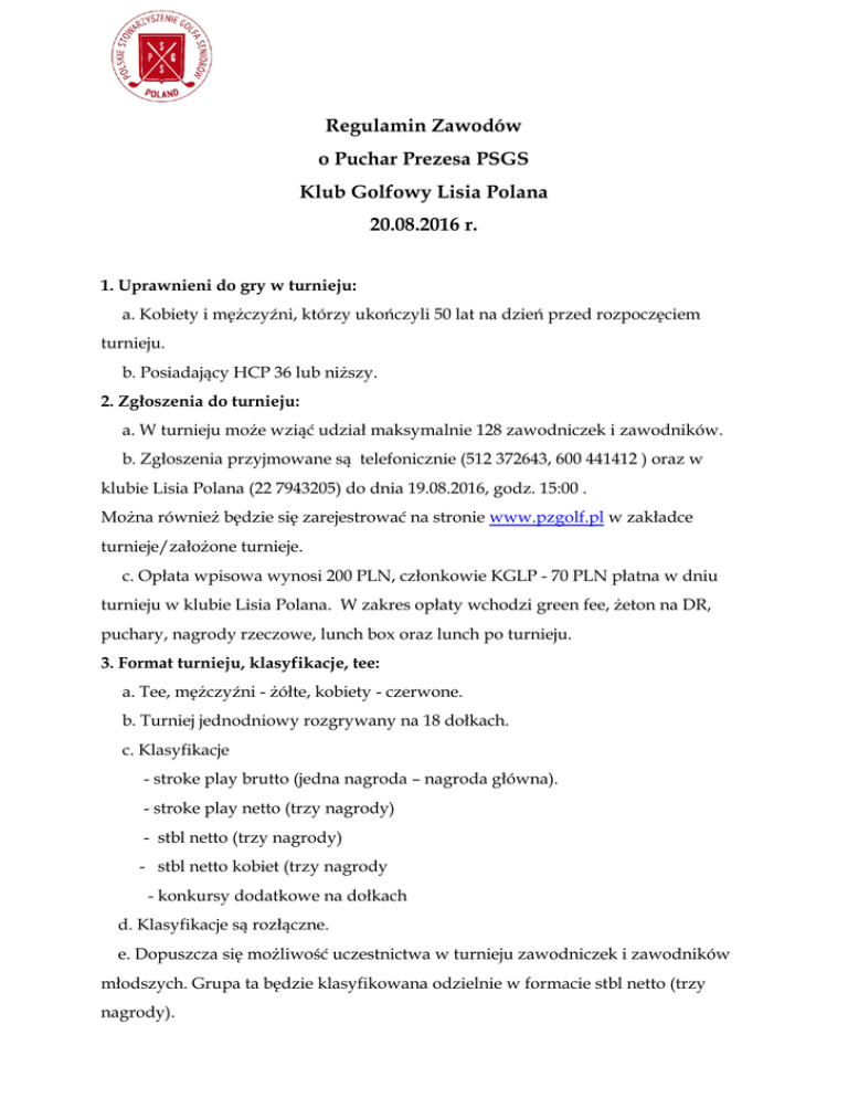 Regulamin Zawodów o Puchar Prezesa PSGS Klub Golfowy Lisia Polana 20.08.2016 r. 1. Uprawnieni do gry w turnieju: a. Kobiety i mężczyźni, którzy ukończyli 50 lat na dzień przed rozpoczęciem turnieju. b. Posiadający HCP 36 lub niższy. 2. Zgłoszenia do turnieju: a. W turnieju może wziąć udział maksymalnie 128 zawodniczek i zawodników. b. Zgłoszenia przyjmowane są telefonicznie (512 372643, 600 441412 ) oraz w klubie Lisia Polana (22 7943205) do dnia 19.08.2016, godz. 15:00 . Można również będzie się zarejestrować na stronie www.pzgolf.pl w zakładce turnieje/założone turnieje. c. Opłata wpisowa wynosi 200 PLN, członkowie KGLP - 70 PLN płatna w dniu turnieju w klubie Lisia Polana. W zakres opłaty wchodzi green fee, żeton na DR, puchary, nagrody rzeczowe, lunch box oraz lunch po turnieju. 3. Format turnieju, klasyfikacje, tee: a. Tee, mężczyźni - żółte, kobiety - czerwone. b. Turniej jednodniowy rozgrywany na 18 dołkach. c. Klasyfikacje - stroke play brutto (jedna nagroda – nagroda główna). - stroke play netto (trzy nagrody) - stbl netto (trzy nagrody) - stbl netto kobiet (trzy nagrody - konkursy dodatkowe na dołkach d. Klasyfikacje są rozłączne. e. Dopuszcza się możliwość uczestnictwa w turnieju zawodniczek i zawodników młodszych. Grupa ta będzie klasyfikowana odzielnie w formacie stbl netto (trzy nagrody). 4. Zwycięzcy turnieju: a. Puchar Prezesa PSGS zdobywa zwycięzca klasyfikacji stroke play brutto. b. Nagrodzona zostanie również najlepsza kobieta w klasyfikacji stroke play brutto. c. Oprócz pucharów nagrodzeni otrzymają również nagrody rzeczowe.