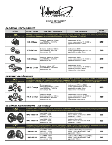 CENNIK DETALICZNY Styczeń 2014 GŁOŚNIKI WSPÓŁOSIOWE SERIA HX seria Excursion by Hollywood model / nazwa moc RMS / impedancja inne parametry CENA detal. brutto (zł) Woofery: membrana Silver Mica-Polypropylen, zawieszenie z gumy butylowej, stalowy kosz, cewka o podwyższonej obciążalności, Tweetery: obrotowa jedwabna kopułka 19-25mm, Zwrotnice: HP-6dB/okt. HX-4 Coax 2-drożne, średnica: 100mm moc RMS/Max: 40/150W impedancja: 4Ω skuteczność: 87dB pasmo przenoszenia: 70-21000Hz głębokość montażu: 52mm 219 HX-5 Coax 2-drożne, średnica: 130mm moc RMS/Max: 50/175W impedancja: 4Ω skuteczność: 88dB pasmo przenoszenia: 60-21000Hz głębokość montażu: 55mm 249 HX-6 Coax 2-drożne, średnica: 165mm moc RMS/Max: 60/200W impedancja: 4Ω skuteczność: 89dB pasmo przenoszenia: 50-21000Hz głębokość montażu: 63mm 279 HX-69 Coax 2-drożne, elipsa: 6x9” moc RMS/Max: 100/300W impedancja: 4Ω skuteczność: 91dB pasmo przenoszenia: 40-21000Hz głębokość montażu: 90mm maskownice w komplecie 349 ZESTAWY GŁOŚNIKOWE HX seria Excursion by Hollywood Woofery: membrana Silver Mica-Polypropylen z korektorem fazy, gumowe zawieszenie, cewka o podwyższonej obciążalności, wydajny ukł. magnetyczny z wentylacją, Tweetery: jedwabna kopułka 25mm z neodymowym magnesem, Zwrotnice: 12/12 dB/okt. z zabezpieczeniem tweeterów, regulacja poziomu sygnału dla tweeterów: 0dB/-3dB HX-5 Comp 2-drożny zestaw średnica wooferów: 130mm moc RMS/Max: 70/225W impedancja: 4Ω skuteczność (1W/1m): 90dB pasmo przenoszenia: 50-22000Hz głębokość montażu: 55mm maskownice w komplecie 419 HX-6 Comp 2-drożny zestaw średnica wooferów: 165mm moc RMS/Max: 90/250W impedancja: 4Ω skuteczność (1W/1m): 91dB pasmo przenoszenia: 40-22000Hz głębokość montażu: 63mm maskownice w komplecie 459 GŁOŚNIKI NISKOTONOWE – subwoofery HX2 seria Excursion-60 by Hollywood HX2 seria Excursion-2 by Hollywood membrana: Mica-Polypropylen, gumowe zawieszenie, cewka 51mm (2”), tłoczony stalowy kosz, pojedynczy wentylowany układ magnetyczny z gumową osłoną, zakręcane terminale przewodów (imbusy) HX2-1060 S4 moc RMS: 250W moc Max.: 750W impedancja: 1x4Ω średnica: 25cm (10”) Xmax: 12mm, skuteczność: 89dB głębokość: 115mm 299 HX2-1260 S4 moc RMS: 250W moc Max.: 750W impedancja: 1x4Ω średnica: 30cm (12”) Xmax: 12mm, skuteczność: 90dB głębokość: 135mm 339 membrana: Silver Mica-Polypropylen, gumowe zawieszenie, cewka 51mm (2”), tłoczony stalowy kosz ze wzmocnieniami, wentylowany układ magnetyczny z gumową osłoną, zakręcane terminale przewodów (imbusy) HX2-10 S4 moc RMS: 400W moc Max.: 1000W impedancja: 1x4Ω średnica: 25cm (10”), magnes 120oz Xmax: 13mm, skuteczność: 91dB głębokość: 115mm 319 HX2-12 S4 moc RMS: 400W moc Max.: 1000W impedancja: 1x4Ω średnica: 30cm (12”), magnes 120oz Xmax: 13mm, skuteczność: 92dB głębokość: 135mm 349 HX2 seria Excursion-80 by Hollywood HX3 seria Excursion-3 by Hollywood HX4 seria Excursion-4 by Hollywood EDGE 14 seria EDGE-14 by Hollywood celulozowa membrana usztywniona lakierowaną tkaniną, piankowe zawieszenie, cewka 64mm (2,5”), stalowy kosz ze wzmocnieniami, podwójny wentylowany układ magnetyczny z gumową osłoną, zakręcane terminale przewodów HX2-1080 D2 moc RMS: 400W moc Max.: 1000W impedancja: 2x2Ω średnica: 25cm (10”) Xmax: 18mm, skuteczność: 90dB głębokość: 150mm 359 HX2-1080 D4 moc RMS: 400W moc Max.: 1000W impedancja: 2x4Ω średnica: 25cm (10”) Xmax: 18mm, skuteczność: 90dB głębokość: 150mm 359 sztywna membrana stożkowa z prasowanego papieru impregnowanego zewnętrznie, gumowe górne zawieszenie zapewniające duże liniowe wychylenia membrany, podwójna wysokotemperaturowa cewka BASV 2”, tłoczony stalowy kosz ze wzmocnieniami, wentylowany podwójny układ magnetyczny z gumową osłoną, solidne terminale przewodów HX3-1082 moc RMS: 600W moc Max.: 1200W impedancja: 2x2Ω średnica: 25cm (10”), magnes 160oz Xmax: 19mm, skuteczność: 90dB głębokość: 125mm 449 HX3-1084 moc RMS: 600W moc Max.: 1200W impedancja: 2x4Ω średnica: 25cm (10”), magnes 160oz Xmax: 19mm, skuteczność: 90dB głębokość: 125mm 449 HX3-1282 moc RMS: 600W moc Max.: 1200W impedancja: 2x2Ω średnica: 30cm (12”), magnes 160oz Xmax: 19mm, skuteczność: 91dB głębokość: 147mm 499 HX3-1284 moc RMS: 600W moc max.: 1200W impedancja: 2x4Ω średnica: 30cm (12”), magnes 160oz Xmax: 19mm, skuteczność: 90dB głębokość: 147mm 499 membrana: wielowarstwowa prasowana pulpa papierowa, gumowe zawieszenie, cewka 64mm (2,5”), tłoczony stalowy kosz ze wzmocnieniami, wentylowany potrójny układ magnetyczny z gumową osłoną, zakręcane terminale przewodów HX4-1022 moc RMS: 800W moc Max.: 2000W impedancja: 2x2Ω średnica: 25cm (10”), magnes 240oz Xmax: 22mm, skuteczność: 90dB głębokość: 160mm 649 HX4-1024 moc RMS: 800W moc Max.: 2000W impedancja: 2x4Ω średnica: 25cm (10”), magnes 240oz Xmax: 22mm, skuteczność: 90dB głębokość: 160mm 649 HX4-1222 moc RMS: 800W moc Max.: 2000W impedancja: 2x2Ω średnica: 30cm (12”), magnes 240oz Xmax: 22mm, skuteczność: 91dB głębokość: 175mm 749 HX4-1224 moc RMS: 800W moc max.: 2000W impedancja: 2x4Ω średnica: 30cm (12”), magnes 240oz Xmax: 22mm, skuteczność: 91dB głębokość: 175mm 749 membrana z włókna szklanego, piankowe zawieszenie, cewka 64mm (2,5”), tłoczony stalowy kosz ze wzmocnieniami, wentylowany pojedynczy układ magnetyczny z gumową osłoną, zakręcane terminale przewodów (EDGE Type) moc RMS: 500W EDGE-1014 D2 moc Max.: 1200W impedancja: 2x2Ω moc RMS: 500W EDGE-1014 D4 moc Max.: 1200W impedancja: 2x4Ω moc RMS: 600W EDGE-1214 D2 moc Max.: 1500W impedancja: 2x2Ω moc RMS: 600W EDGE-1214 D4 moc Max.: 1500W impedancja: 2x4Ω EDGE 24 seria EDGE-24 by Hollywood średnica: 25cm (10”), magnes 120oz Xmax: 16mm głębokość: 135mm 449 średnica: 25cm (10”), magnes 120oz Xmax: 16mm głębokość: 135mm 449 średnica: 30cm (1