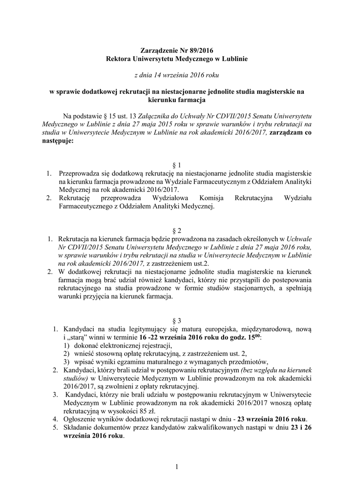 Zarządzenie Nr 89/2016 Rektora Uniwersytetu Medycznego w Lublinie z dnia 14 września 2016 roku w sprawie dodatkowej rekrutacji na niestacjonarne jednolite studia magisterskie na kierunku farmacja Na podstawie § 15 ust. 13 Załącznika do Uchwały Nr CDVII/2015 Senatu Uniwersytetu Medycznego w Lublinie z dnia 27 maja 2015 roku w sprawie warunków i trybu rekrutacji na studia w Uniwersytecie Medycznym w Lublinie na rok akademicki 2016/2017, zarządzam co następuje: 1. 2. §1 Przeprowadza się dodatkową rekrutację na niestacjonarne jednolite studia magisterskie na kierunku farmacja prowadzone na Wydziale Farmaceutycznym z Oddziałem Analityki Medycznej na rok akademicki 2016/2017. Rekrutację przeprowadza Wydziałowa Komisja Rekrutacyjna Wydziału Farmaceutycznego z Oddziałem Analityki Medycznej. §2 1. Rekrutacja na kierunek farmacja będzie prowadzona na zasadach określonych w Uchwale Nr CDVII/2015 Senatu Uniwersytetu Medycznego w Lublinie z dnia 27 maja 2016 roku, w sprawie warunków i trybu rekrutacji na studia w Uniwersytecie Medycznym w Lublinie na rok akademicki 2016/2017, z zastrzeżeniem ust.2. 2. W dodatkowej rekrutacji na niestacjonarne jednolite studia magisterskie na kierunek farmacja mogą brać udział również kandydaci, którzy nie przystąpili do postepowania rekrutacyjnego na studia prowadzone w formie studiów stacjonarnych, a spełniają warunki przyjęcia na kierunek farmacja. §3 1. Kandydaci na studia legitymujący się maturą europejska, międzynarodową, nową i „starą” winni w terminie 16 -22 września 2016 roku do godz. 1500: 1) dokonać elektronicznej rejestracji, 2) wnieść stosowną opłatę rekrutacyjną, z zastrzeżeniem ust. 2, 3) wpisać wyniki egzaminu maturalnego z wymaganych przedmiotów, 2. Kandydaci, którzy brali udział w postępowaniu rekrutacyjnym (bez względu na kierunek studiów) w Uniwersytecie Medycznym w Lublinie prowadzonym na rok akademicki 2016/2017, są zwolnieni z opłaty rekrutacyjnej. 3. Kandydaci, którzy nie brali udziału w postępowaniu rekrutacyjnym w Uniwersytecie Medycznym w Lublinie prowadzonym na rok akademicki 2016/2017 wnoszą opłatę rekrutacyjną w wysokości 85 zł. 4. Ogłoszenie wyników dodatkowej rekrutacji nastąpi w dniu - 23 września 2016 roku. 5. Składanie dokumentów przez kandydatów zakwalifikowanych nastąpi w dniu 23 i 26 września 2016 roku. 1 §4 W ramach dodatkowej rekrutacji na kierunek farmacja zostaną przyjęci kandydaci, którzy: 1) spełnią warunki określone wyżej powołaną Uchwałą Senatu Uniwersytetu Medycznego w Lublinie i niniejszym Zarządzeniem, 2) uzyskają najwyższą punktację mieszczącą się w ramach limitów miejsc, 3) w terminie złożą komplet wymaganych dokumentów. §5 Wykonanie Zarządzenia powierza się Prorektorowi ds. Kształcenia. §6 Zarządzenie wchodzi w życie z dniem podpisania. Rektor Uniwersytetu Medycznego w Lublinie Prof. dr hab. Andrzej Drop 2
