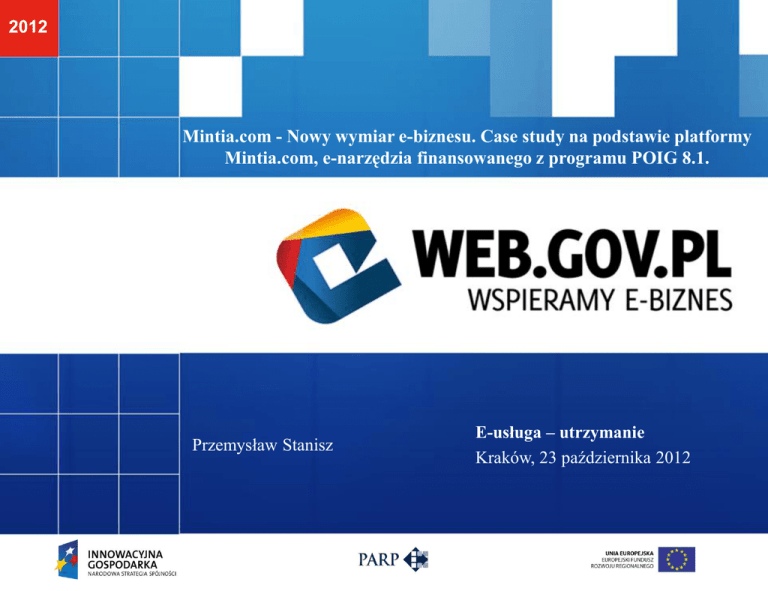 2012 Mintia.com - Nowy wymiar e-biznesu. Case study na podstawie platformy Mintia.com, e-narzędzia finansowanego z programu POIG 8.1. Przemysław Stanisz E-usługa – utrzymanie Kraków, 23 października 2012 E-usługa – utrzymanie, Kraków, 23.10.2012 Plan prezentacji Czym jest Mintia Przykłady e-usług świadczonych przez Mintia Finansowanie Projektu Rozwój projektu i istotne elementy E-usługa – utrzymanie, Kraków, 23.10.2012 Czym jest Mintia Mintia jest międzynarodową społecznością designerów i osób kreatywnych, która wykorzystuje aspekty społecznościowe w projektowaniu co pozwala uzyskać i oferować wysokiej jakości usługi kreatywne. E-usługa – utrzymanie, Kraków, 23.10.2012 Przykłady e-usług świadczonych przez Mintia tradycyjnie z MINTIA E-usługa – utrzymanie, Kraków, 23.10.2012 E-usługa – utrzymanie, Kraków, 23.10.2012 E-usługa – utrzymanie, Kraków, 23.10.2012 • Mintia Marketplace – Lipiec 2012 E-usługa – utrzymanie, Kraków, 23.10.2012 E-usługa – utrzymanie, Kraków, 23.10.2012 • Mintia Headhunting – Listopad-Grududzień 2012 • Mintia Implement – Listopad-Grududzień 2012 E-usługa – utrzymanie, Kraków, 23.10.2012 Finansowanie Projektu • Prezentacja pomysłu przed aniołami biznesu (2010) • Program Bon na innowacje (2010) • Program POIG 8.1 (2011) • WIP Kadry MARR (2012) • San Francisco – Broker Innowacji (2012) • Rozmowy z inwestorami E-usługa – utrzymanie, Kraków, 23.10.2012 Rozwój projektu i istotne elementy • Dbaj o grupę docelową • Reklama – nie zapominaj o niej! • Znajdź dobrych partnerów (KPT, CTT itp.) • Reaguj na zmiany rynkowe • Dziel się swoim pomysłem i słuchaj komentarzy • Dbaj o płynność finansową E-usługa – utrzymanie, Kraków, 23.10.2012 Pytania? Przemysław Stanisz [email protected] 694685905