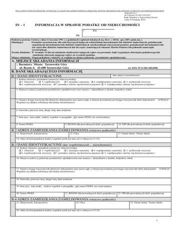 POLA JASNE WYPEŁNIA PODATNIK. WYPEŁNIAĆ NA MASZYNIE, KOMPUTEROWO LUB RĘCZNIE, DUŻYMI, DRUKOWANYMI LITERAMI, CZARNYM LUB NIEBIESKIM KOLOREM Załącznik Nr 1 do Uchwały Nr XIV/195/2015 Rady Miejskiej w Tarnowskich Górach z dnia 19 listopada 2015r. IN – 1 INFORMACJA W SPRAWIE PODATKU OD NIERUCHOMOŚCI 1. na Rok ........................................ Podstawa prawna: Ustawa z dnia 12 stycznia 1991 r. o podatkach i opłatach lokalnych (t.j. Dz.U. z 2014r. poz. 849 z późn.zm..). Składający: Formularz przeznaczony dla osób fizycznych będących właścicielami nieruchomości lub obiektów budowlanych, posiadaczami samoistnymi nieruchomości lub obiektów budowlanych, użytkownikami wieczystymi gruntów, posiadaczami nieruchomości lub ich części albo obiektów budowlanych lub ich części, stanowiących własność Skarbu Państwa lub jednostki samorządu terytorialnego. Termin składania: W terminie 14 dni od zaistnienia okoliczności mających wpływ na powstanie, bądź wygaśnięcie obowiązku podatkowego lub zaistnienia zdarzenia mającego wpływ na wysokość podatku. Miejsce składania: Organ podatkowy właściwy ze względu na miejsce położenia przedmiotów opodatkowania. A. MIEJSCE SKŁADANIA INFORMACJI 2. Burmistrz Miasta Tarnowskie Góry ul. Rynek 4; 42-600 Tarnowskie Góry tel. (032) 39-33-803 (804,808) B. DANE SKŁADAJĄCEGO INFORMACJĘ B.1 DANE IDENTYFIKACYJNE data nabycia nieruchomości: 3. Rodzaj własności, posiadania (zaznaczyć właściwą kratkę) 1. właściciel 2. współwłaściciel 3. posiadacz samoistny 4. współposiadacz samoistny 5. użytkownik wieczysty 6. współużytkownik wieczysty 7. posiadacz zależny /np.dzierżawca,najemca/ 8. współposiadacz zależny /np.dzierżawca,najemca / 4. Miejsce/a (adres/y) położenia przedmiotów opodatkowania oraz numery i identyfikator/y działek, budynków, lokali 5. Numer/y księgi wieczystej lub zbioru/ów dokumentów oraz nazwa sądu, w którym prowadzona jest księga wieczysta lub zbiór dokumentów Wypełnia się odrębne informacje dla każdej nieruchomości) (UWAGA! 6. Nazwisko, pierwsze imię, drugie imię, data urodzenia 7. Imię ojca, imię matki, (należy wypełnić w przypadku , gdy numer PESEL nie został nadany) 8. Numer PESEL 9. REGON (dla prowadzących dział. gospodarczą) 10. NIP (dla prowadzących dział. gospodarczą) B.2 ADRES ZAMIESZKANIA/ZAMELDOWANIA (właściwe podkreślić) 11. Miejscowość, kod pocztowy 12. Ulica 13. Numer domu / Numer lokalu 14. Adres do korespondencji (należy wypełnić jeżeli jest inny niż w rubryce nr 11-13) B.3 DANE IDENTYFIKACYJNE (dot. współwłaścicieli ... nieruchomości) 15. Rodzaj własności, posiadania (zaznaczyć właściwą kratkę) 1. właściciel 2. współwłaściciel 3. posiadacz samoistny 4. współposiadacz samoistny 5. użytkownik wieczysty 6. współużytkownik wieczysty 7. posiadacz zależny /np.dzierżawca,najemca/ 8. współposiadacz zależny /np.dzierżawca,najemca / 16. Miejsce/a (adres/y) położenia przedmiotów opodatkowania oraz numery i identyfikator/y działek, budynków, lokali 17. Numer/y księgi wieczystej lub zbioru/ów dokumentów oraz nazwa sądu, w którym prowadzona jest księga wieczysta lub zbiór dokumentów Wypełnia się odrębne informacje dla każdej nieruchomości) (UWAGA! 18. Nazwisko, pierwsze imię, drugie imię, data urodzenia 19. Imię ojca, imię matki, (należy wypełnić w przypadku , gdy numer PESEL nie został nadany) 20. Numer PESEL 21. REGON (dla prowadzących dział. gospodarczą) 22. NIP (dla prowadzących dział. gospodarczą) B.4 ADRES ZAMIESZKANIA/ZAMELDOWANIA (właściwe podkreślić) 23. Miejscowość, kod pocztowy 24. Ulica 25. Numer domu / Numer lokalu 26. Adres do korespondencji (należy wypełnić jeżeli jest inny niż w rubryce nr 23-25) 1 POLA JASNE WYPEŁNIA PODATNIK. WYPEŁNIAĆ NA MASZYNIE, KOMPUTEROWO LUB RĘCZNIE, DUŻYMI, DRUKOWANYMI LITERAMI, CZARNYM LUB NIEBIESKIM KOLOREM C. OKOLICZNOŚCI POWODUJĄCE KONIECZNOŚĆ ZŁOŻENIA INFORMACJI 27. Okoliczności powodujące obowiązek złożenia informacji ( zaznaczyć właściwy kwadrat). W przypadku korekty informacji – dołączyć pisemne uzasadnienie przyczyn korekty 1. informacja składana po raz pierwszy 2. korekta uprzednio złożonej informacji D. DANE DOTYCZĄCE PRZEDMIOTÓW OPODATKOWANIA (z wyjątkiem zwolnionych) D.1 POWIERZCHNIA GRUNTÓW 1. związanych z prowadzeniem działalności gospodarczej, bez względu na sposób zakwalifikowania w ewidencji gruntów i budynków 28. ............................................................................ m2 29. ............................................................................ ha 2. pod wodami powierzchniowymi stojącymi lub wodami powierzchniowymi płynącymi jezior i zbiorników sztucznych 3. pozostałych, w tym zajęte na prowadzenie odpłatnej statutowej działalności pożytku publicznego przez organizacje pożytku publicznego - zakwalifikowanych w ewidencji gruntów i budynków jako drogi oznaczone symbolem „dr” 4. niezabudowanych objętych obszarem rewitalizacji, o którym mowa w ustawie z dnia 9 października 2015 r. o rewitalizacji (Dz. U. z 2015r., poz. 1777) i położonych na terenach, dla których miejscowy plan zagospodarowania przestrzennego przewiduje przeznaczenie pod zabudowę mieszkaniową, usługową albo zabudowę o przeznaczeniu mieszanym obejmującym wyłącznie te rodzaje zabudowy, jeżeli od dnia wejścia w życie tego planu w odniesieniu do tych gruntów upłynął okres 4 lat, a w tym czasie nie zakończono budowy zgodnie z przepisami prawa budowlanego 30. ............................................................................ m2 31. ............................................................................ m2 32. ............................................................................ m2 D.2 POWIERZCHNIA UŻYTKOWA BUDYNKÓW LUB ICH CZĘŚCI 33. 1. mieszkalnych w tym: - kondygnacji o wys. powyżej 2,20 m (zaliczyć 100% pow. uż