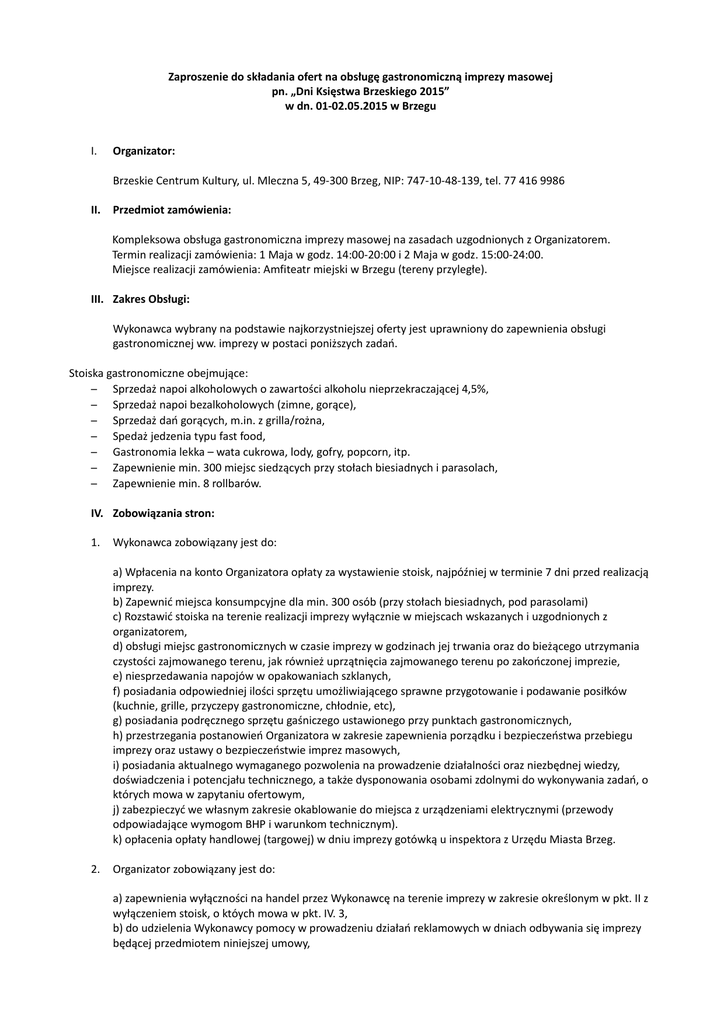Zaproszenie do składania ofert na obsługę gastronomiczną imprezy masowej pn. „Dni Księstwa Brzeskiego 2015” w dn. 01-02.05.2015 w Brzegu I. Organizator: Brzeskie Centrum Kultury, ul. Mleczna 5, 49-300 Brzeg, NIP: 747-10-48-139, tel. 77 416 9986 II. Przedmiot zamówienia: Kompleksowa obsługa gastronomiczna imprezy masowej na zasadach uzgodnionych z Organizatorem. Termin realizacji zamówienia: 1 Maja w godz. 14:00-20:00 i 2 Maja w godz. 15:00-24:00. Miejsce realizacji zamówienia: Amfiteatr miejski w Brzegu (tereny przyległe). III. Zakres Obsługi: Wykonawca wybrany na podstawie najkorzystniejszej oferty jest uprawniony do zapewnienia obsługi gastronomicznej ww. imprezy w postaci poniższych zadań. Stoiska gastronomiczne obejmujące: – Sprzedaż napoi alkoholowych o zawartości alkoholu nieprzekraczającej 4,5%, – Sprzedaż napoi bezalkoholowych (zimne, gorące), – Sprzedaż dań gorących, m.in. z grilla/rożna, – Spedaż jedzenia typu fast food, – Gastronomia lekka – wata cukrowa, lody, gofry, popcorn, itp. – Zapewnienie min. 300 miejsc siedzących przy stołach biesiadnych i parasolach, – Zapewnienie min. 8 rollbarów. IV. Zobowiązania stron: 1. Wykonawca zobowiązany jest do: a) Wpłacenia na konto Organizatora opłaty za wystawienie stoisk, najpóźniej w terminie 7 dni przed realizacją imprezy. b) Zapewnić miejsca konsumpcyjne dla min. 300 osób (przy stołach biesiadnych, pod parasolami) c) Rozstawić stoiska na terenie realizacji imprezy wyłącznie w miejscach wskazanych i uzgodnionych z organizatorem, d) obsługi miejsc gastronomicznych w czasie imprezy w godzinach jej trwania oraz do bieżącego utrzymania czystości zajmowanego terenu, jak również uprzątnięcia zajmowanego terenu po zakończonej imprezie, e) niesprzedawania napojów w opakowaniach szklanych, f) posiadania odpowiedniej ilości sprzętu umożliwiającego sprawne przygotowanie i podawanie posiłków (kuchnie, grille, przyczepy gastronomiczne, chłodnie, etc), g) posiadania podręcznego sprzętu gaśniczego ustawionego przy punktach gastronomicznych, h) przestrzegania postanowień Organizatora w zakresie zapewnienia porządku i bezpieczeństwa przebiegu imprezy oraz ustawy o bezpieczeństwie imprez masowych, i) posiadania aktualnego wymaganego pozwolenia na prowadzenie działalności oraz niezbędnej wiedzy, doświadczenia i potencjału technicznego, a także dysponowania osobami zdolnymi do wykonywania zadań, o których mowa w zapytaniu ofertowym, j) zabezpieczyć we własnym zakresie okablowanie do miejsca z urządzeniami elektrycznymi (przewody odpowiadające wymogom BHP i warunkom technicznym). k) opłacenia opłaty handlowej (targowej) w dniu imprezy gotówką u inspektora z Urzędu Miasta Brzeg. 2. Organizator zobowiązany jest do: a) zapewnienia wyłączności na handel przez Wykonawcę na terenie imprezy w zakresie określonym w pkt. II z wyłączeniem stoisk, o któych mowa w pkt. IV. 3, b) do udzielenia Wykonawcy pomocy w prowadzeniu działań reklamowych w dniach odbywania się imprezy będącej przedmiotem niniejszej umowy, c) do zapewnienia dostawy prądu o uzgodnionej mocy (Organizator zaświadcza jednak, że posiada do dyspozycji wykonawcy oraz do dyspozycji karuzeli 80kW. W przypadku zapotrzebowania większego – czy ze strony Wykonawcy czy ze strony Karuzeli, ewentualny niedobór Wykonawca zabezpieczy we własnym zakresie- agregat prądotwóczy) w miejscu realizacji imprezy oraz obsługi elektryka podczas podłączenia i odłączenia stoisk jak i w trakcie trwania imprezy. 3. Organizator jest uprawniony do umieszczenia w miejscu realizacji imprezy następujących stoisk: a) stoiska promocyjne Miasta Brzeg oraz innych miejskich instytucji i organizacji, b) stoisk promocyjnych sponsorów imprezy, c) innych stoisk handlowych, których nie dotyczy zakres ofertowy Wykonawcy d) stoisk kasowych do sprzedaży biletów wstępu do amfiteatru. V. Procedura wyboru: 1. Nie dopuszcza się składania ofert częściowych. W wyniku zapytania ofertowego wybrany zostanie tylko 1 Wykonawca. Kryteria oceny ofert: a.) cena za wystawienie stoisk, b.) menu i szczegółowy asortyment – jego atrakcyjność i różnorodność, c.) udokumentowane doświadczenie w organizacji cateringu na imprezach masowych, d.) referencje, e.) ogólny wizerunek stoisk (foto). Termin składania ofert: 16.03.2015 Miejsce składania ofert: osobiście lub pocztą na adres: Brzeskie Centrum Kultury ul. Mleczna 5, 49-300 Brzeg lub drogą elektroniczną na adres: [email protected] lub [email protected]. W razie pytań można skontaktować się drogą telefoniczną z dyrektorem BCK – Jackiem Ochmańskim – nr tel. 509 846848. W przypadku wątpliwości co do złożonych ofert Organizator zastrzega sobie prawo do rozmów/negocjacji. Organizator zastrzega sobie prawo do odstąpienia od wyboru oferetna bez podania przyczyny. Organizator dokona wyboru oferty do dnia 20.03.2015. O wyborze najkorzystniejszej oferty oferenci zostaną powiadomieni telefonicznie. Decyzja dotycząca wyboru oferty jest niepodważalna. 2. 3. 4. 5. 6. 7.