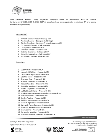 Lista członków Komisji Oceny Projektów biorących udział w posiedzeniu KOP w ramach konkursu nr RPDS.08.04.03-IP.02-02-019/15, powołanych do oceny zgodności ze strategią ZIT oraz oceny formalno-merytorycznej: Obsługa KOP: 1. 2. 3. 4. 5. 6. 7. 8. 9. Wysocki Łukasz– Przewodniczący KOP Płóciennik Aneta – Zastępca ds. Strategii Otręba Arkadiusz – Zastępca Przewodniczącego KOP Chrzanowski Tomasz – Sekretarz KOP Chudy Marta – Sekretarz KOP Dmowski Miłosz – Sekretarz KOP Kicińska Katarzyna – Sekretarz KOP Kołodziej Magdalena – Sekretarz KOP Korusiewicz Karina – Sekretarz KOP Oceniający: 1. Guz Michał – Pracownik IOK 2. Lubieniecki Wiktor – Pracownik IOK 3. Łukaszuk Grzegorz – Pracownik IOK 4. Czerkies Anna – Pracownik IOK 5. Dmytrasz Ewa – Pracownik IOK 6. Jeziorek Ewelina – Pracownik IOK 7. Kapuścińska Ewa – Pracownik IOK 8. Kotońska Monika – Pracownik IOK 9. Kubala Krzysztof – Pracownik IOK 10. Ląd-Sobieszek Sława – Pracownik IOK 11. Markuszewska-Krasowska Monika – Pracownik IOK 12. Nitkiewicz Marta – Pracownik IOK 13. Serafin Paulina – Pracownik IOK 14. Solińska Katarzyna – Pracownik IOK 15. Stanoch Agnieszka – Pracownik IOK 16. Surowiak-Paroń Zuzanna – Pracownik IOK 17. Szewczak Aleskandra – Pracownik IOK 18. Sznel Joanna – Pracownik IOK 19. Torzewska Mariola – Pracownik IOK 20. Trzcińska-Niemiec Ewelina – Pracownik IOK Dolnośląski Wojewódzki Urząd Pracy Wydział Oceny Wniosków Konkursowych al. Armii Krajowej 54, 50-541 Wrocław tel.: +48 71 39 74 200 | fax: +48 71 39 74 202 e-mail: [email protected] 21. Wojciechowska Małgorzata – Pracownik IOK 22. Wojdag Renata – Pracownik IOK 23. Zieliński Tadeusz – Pracownik IOK 24. Dembińska Małgorzata – Ekspert zewnętrzny 25. Polanowska Katarzyna – Ekspert zewnętrzny 26. Tyc Andrzej – Ekspert zewnętrzny 27. Urbańska Katarzyna – Ekspert zewnętrzny 28. Wojtaszewska Kamila – Ekspert zewnętrzny 2
