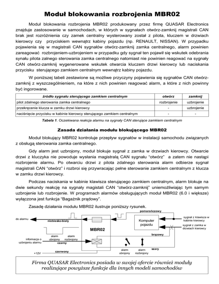 Moduł blokowania rozbrojenia MBR02 Moduł blokowania rozbrojenia MBR02 produkowany przez firmę QUASAR Electronics znajduje zastosowanie w samochodach, w których w sygnałach otwórz-zamknij magistrali CAN brak jest rozróżnienia czy zamek centralny wysterowany został z pilota, kluczem w drzwiach kierowcy czy przyciskiem wewnątrz kabiny pojazdu (np. RENAULT, NISSAN). W przypadku pojawienia się w magistrali CAN sygnałów otwórz-zamknij zamka centralnego, alarm powinien zareagować rozbrojeniem-uzbrojeniem w przypadku gdy sygnał ten pojawił się wskutek odebrania synału pilota zalnego sterowania zamka centralnego natomiast nie powinien reagować na sygnały CAN otwórz-zamknij wygenerowane wskutek otwarcia kluczem drzwi kierowcy lub naciskania przycisku sterującego zamkiem centralnym wewnątrz kabiny pojazdu. W poniższej tabeli zestawione są możliwe przyczyny pojawienia się sygnałów CAN otwórzzamknij z wyszczególnieniem, na które z nich powinien reagować alarm, a które z nich powinny być ingorowane. źródło sygnału sterującego zamkiem centralnym otwórz zamknij pilot zdalnego sterowania zamka centralnego rozbrojenie uzbrojenie przekręcenie klucza w zamku drzwi kierowcy - uzbrojenie naciśnięcie przycisku w kabinie kierowcy sterującego zamkiem centralnym - - Tabela 1. Oczekiwana reakcja alarmu na sygnały CAN sterujące zamkiem centralnym Zasada działania modułu blokującego MBR02 Moduł blokujący MBR02 kontroluje przepływ sygnałów w instalacji samochodu związanych z obsługą sterowania zamka centralnego. Gdy alarm jest uzbrojony, moduł blokuje sygnał z zamka w drzwiach kierowcy. Otwarcie drzwi z kluczyka nie powoduje wysłania magistralą CAN sygnału “otwórz” a zatem nie nastąpi rozbrojenie alarmu. Po otwarciu drzwi z pilota zdalnego sterowania alarm odbierze sygnał magistrali CAN “otwórz” i rozbroi się przywracając pełne sterowanie zamkiem centralnym z klucza w zamku drzwi kierowcy. Podczas naciskania w kabinie klawisza sterującego zamkiem centralnym, alarm blokuje na dwie sekundy reakcję na sygnały magistali CAN “otwórz-zamknij” uniemożliwiając tym samym uzbrojenie lub rozbrojenie. W programach alarmów obsługujących moduł MBR02 (6.0 i większe) wyłączona jest funkcja “Bagażnik prądowy”. Zasadę działania modułu MBR02 ilustruje poniższy rysunek. pomarańczowy do alarmu Komputer pojazdu niebiesko-biały MBR02 informacja o uzbrojeniu alarmu +12V sygnał z zamka w drzwiach kierowcy brązowy alarm alarm rozbrojony ubrojony czarny czerwony sygnał z klawisza w kabinie kierowcy alarm ubrojony alarm rozbrojony szary Firma QUASAR Electronics posiada w swojej ofercie również moduły realizujące powyższe funkcje dla innych modeli samochodów