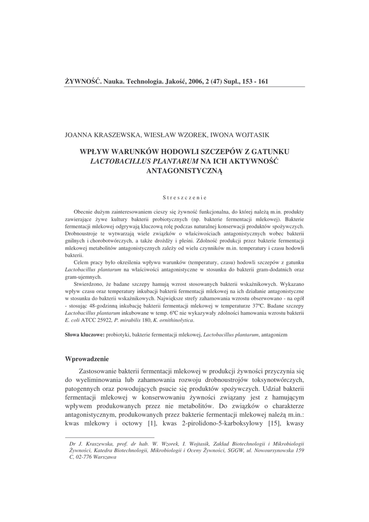 YWNO . Nauka. Technologia. Jako , 2006, 2 (47) Supl., 153 - 161 JOANNA KRASZEWSKA, WIESŁAW WZOREK, IWONA WOJTASIK WPŁYW WARUNKÓW HODOWLI SZCZEPÓW Z GATUNKU LACTOBACILLUS PLANTARUM NA ICH AKTYWNO ANTAGONISTYCZN Streszczenie Obecnie du ym zainteresowaniem cieszy si ywno funkcjonalna, do której nale m.in. produkty zawieraj ce ywe kultury bakterii probiotycznych (np. bakterie fermentacji mlekowej). Bakterie fermentacji mlekowej odgrywaj kluczow rol podczas naturalnej konserwacji produktów spo ywczych. Drobnoustroje te wytwarzaj wiele zwi zków o wła ciwo ciach antagonistycznych wobec bakterii gnilnych i chorobotwórczych, a tak e dro d y i ple ni. Zdolno produkcji przez bakterie fermentacji mlekowej metabolitów antagonistycznych zale y od wielu czynników m.in. temperatury i czasu hodowli bakterii. Celem pracy było okre lenia wpływu warunków (temperatury, czasu) hodowli szczepów z gatunku Lactobacillus plantarum na wła ciwo ci antagonistyczne w stosunku do bakterii gram-dodatnich oraz gram-ujemnych. Stwierdzono, e badane szczepy hamuj wzrost stosowanych bakterii wska nikowych. Wykazano wpływ czasu oraz temperatury inkubacji bakterii fermentacji mlekowej na ich działanie antagonistyczne w stosunku do bakterii wska nikowych. Najwi ksze strefy zahamowania wzrostu obserwowano - na ogół - stosuj c 48-godzinn inkubacj bakterii fermentacji mlekowej w temperaturze 37ºC. Badane szczepy Lactobacillus plantarum inkubowane w temp. 6ºC nie wykazywały zdolno ci hamowania wzrostu bakterii E. coli ATCC 25922, P. mirabilis 180, K. ornithinolytica. Słowa kluczowe: probiotyki, bakterie fermentacji mlekowej, Lactobacillus plantarum, antagonizm Wprowadzenie Zastosowanie bakterii fermentacji mlekowej w produkcji ywno ci przyczynia si do wyeliminowania lub zahamowania rozwoju drobnoustrojów toksynotwórczych, patogennych oraz powoduj cych psucie si produktów spo ywczych. Udział bakterii fermentacji mlekowej w konserwowaniu ywno ci zwi zany jest z hamuj cym wpływem produkowanych przez nie metabolitów. Do zwi zków o charakterze antagonistycznym, produkowanych przez bakterie fermentacji mlekowej nale m.in.: kwas mlekowy i octowy [1], kwas 2-pirolidono-5-karboksylowy [15], kwasy Dr J. Kraszewska, prof. dr hab. W. Wzorek, I. Wojtasik, Zakład Biotechnologii i Mikrobiologii ywno ci, Katedra Biotechnologii, Mikrobiologii i Oceny ywno ci, SGGW, ul. Nowoursynowska 159 C, 02-776 Warszawa 154 Joanna Kraszewska, Wiesław Wzorek, Iwona Wojtasik tłuszczowe [5], kwas fenylomlekowy i 4-hydroksyfenylomlekowy [14], nadtlenek wodoru [3], bakteriocyny [2], diacetyl [6], aldehyd octowy, etanol [13], kwas benzoesowy, 5-metylohydantoina, lakton kwasu mewalonowego [12]. Według danych literaturowych [7, 8] zdolno bakterii fermentacji mlekowej do syntezy zwi zków o wła ciwo ciach antagonistycznych zale y nie tylko od szczepu bakterii, ale równie od warunków rodowiska, fizycznych i chemicznych, takich jak: wiek hodowli (faza wzrostu drobnoustrojów), skład podło a, pH rodowiska, temperatura czy czas inkubacji. Celem pracy było okre lenie antagonistycznej aktywno ci szczepów z gatunku Lactobacillus plantarum w zale no ci od temperatury i czasu hodowli bakterii fermentacji mlekowej. Materiał i metody bada W badaniach stosowano szczepy nale ce do gatunku Lactobacillus plantarum: L. plantarum 44, L. plantarum 299v, L. plantarum ATCC 4080, L. plantarum NCAIM B.01834, L. plantarum NCAIM B. 01149. Jako drobnoustroje wska nikowe zastosowano bakterie gram-dodatnie: Staphylococcus epidermidis ATCC 12228, Bacillus subtilis ATCC 6633, Bacillus cereus ATCC 11778, Bacillus pumilus ATCC 8241, Bacillus megaterium, Enterococcus faecalis ATCC 29212 oraz gram-ujemne pałeczki z gatunków: Escherichia coli ATCC 25922, Citrobacter freundii 488, Pseudomonas fluorescens 16/94, Proteus mirabilis 180, Klebsiella ornithinolytica. Wła ciwo ci antagonistyczne bakterii fermentacji mlekowej badano metod słupkow [9]. Celem okre lenia wpływu czasu inkubacji bakterii fermentacji mlekowej na syntez substancji antagonistycznych 24-godzinn hodowl posiewano na podło e MRS i inkubowano w temp. 28ºC przez 24, 48 oraz 72 godz. Do okre lenia wpływu temperatury inkubacji hodowl szczepów z gatunku L. plantarum prowadzono przez 48 godz. w temp. 6, 22 oraz 37ºC. Nast pnie z podło a z wyrosł hodowl bakterii fermentacji mlekowej wycinano słupki i przenoszono na płytki z zestalonym bulionem wzbogaconym (BTL Sp.z o.o. Zakład Enzymów i Peptonów) zawieraj cym 24godzinn hodowl szczepu wska nikowego. W ten sposób przygotowane hodowle inkubowano w temp. 37ºC przez 24 godz. w anaerostatach. Po tym czasie mierzono rednic strefy zahamowania wzrostu szczepu wska nikowego (testowego). Wynik podawano w mm po odj ciu rednicy słupka. Wykonano sze serii do wiadcze , ka d w dwóch powtórzeniach. Wyliczono warto ci rednie oraz odchylenia standardowe. Wyniki i dyskusja Wpływ czasu inkubacji wybranych szczepów z gatunku Lactobacillus plantarum na ich wła ciwo ci antagonistyczne przedstawiono w tab. 1. Ka dy z badanych Tabela 1 Wielko stref zahamowania wzrostu szczepów testowych determinowana czasem inkubacji bakterii fermentacji mlekowej [mm]. Zones inhibition growth of test bacteria was determined by incubation time of lactic acid bacteria [mm]. Szczepy badane / Studied strains Szczepy testowe L. plantarum 44 L. plantarum 299v Test strains L. plantarum L. plantarum L. plantarum ATCC 4080 NCAIM B.01834 NCAIM B.01149 Czas inkubacji [godz.] / Incubation time [h] 24 48 72 24 48 72 24 48 72 24 48 72 24 48 72 Bakterie gram-dodatnie / Gram-positive bacteria S. epidermidis 27,8 22,8 10,3 25,0 24,7 11,8 24,3 25,7 13,5 24,2 23,7 14,8 25,2 21,3 12,3 ATCC 12228 ±0,4 ±1,2 ±0,5 ±0,9 ±0,8 ±1,3 ±0,5 ±0,8 ±1,3 ±1,3 ±0,5 ±1,5 ±1,5 ±0,8 ±0,5 B. subtilis 5,8 9,2 10,3 6,5 10,2 9,2 5,8 8,8 10,5 5,3 10,0 9,8 6,5 7,5 10,5 ATCC 6633 ±0,8 ±0,4 ±1,0 ±1,4 ±1,5 ±0,4 ±0,1 ±1,2 ±0,6 ±0,5 ±1,3 ±0,8 ±1,1 ±1,1 ±0,6 B. cereus 10,2 12,3 8,5 11,2 12,8 