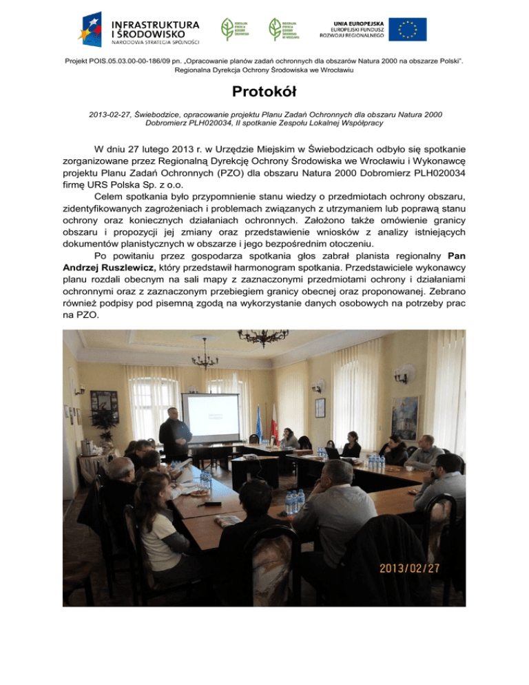 Projekt POIS.05.03.00-00-186/09 pn. „Opracowanie planów zadań ochronnych dla obszarów Natura 2000 na obszarze Polski”. Regionalna Dyrekcja Ochrony Środowiska we Wrocławiu Protokół 2013-02-27, Świebodzice, opracowanie projektu Planu Zadań Ochronnych dla obszaru Natura 2000 Dobromierz PLH020034, II spotkanie Zespołu Lokalnej Współpracy W dniu 27 lutego 2013 r. w Urzędzie Miejskim w Świebodzicach odbyło się spotkanie zorganizowane przez Regionalną Dyrekcję Ochrony Środowiska we Wrocławiu i Wykonawcę projektu Planu Zadań Ochronnych (PZO) dla obszaru Natura 2000 Dobromierz PLH020034 firmę URS Polska Sp. z o.o. Celem spotkania było przypomnienie stanu wiedzy o przedmiotach ochrony obszaru, zidentyfikowanych zagrożeniach i problemach związanych z utrzymaniem lub poprawą stanu ochrony oraz koniecznych działaniach ochronnych. Założono także omówienie granicy obszaru i propozycji jej zmiany oraz przedstawienie wniosków z analizy istniejących dokumentów planistycznych w obszarze i jego bezpośrednim otoczeniu. Po powitaniu przez gospodarza spotkania głos zabrał planista regionalny Pan Andrzej Ruszlewicz, który przedstawił harmonogram spotkania. Przedstawiciele wykonawcy planu rozdali obecnym na sali mapy z zaznaczonymi przedmiotami ochrony i działaniami ochronnymi oraz z zaznaczonym przebiegiem granicy obecnej oraz proponowanej. Zebrano również podpisy pod pisemną zgodą na wykorzystanie danych osobowych na potrzeby prac na PZO. Przedstawiono również procedurę zapoznawania się z projektem planu zadań ochronnych za pomocą platformy informacyjno-komunikacyjnej. Przedstawiciel wykonawcy planu, botanik Pani Małgorzata Rudy przypomniała charakterystykę obszaru i przedmiotów ochrony – siedlisk i owadów. Planista Regionalny wyjaśnił również obecny stan prawny obszaru. Następnie omówione zostały również zagrożenia i działania ochronne. Ponieważ na sali był przedstawiciel użytkowników łąk, szczególny nacisk położono na działania na siedliskach antropogenicznych. Pani Małgorzata Rudy wyjaśniła, że działania zostaną podzielone na obligatoryjne, do których należy zachowanie powierzchni łąkowej i ekstensywne jej użytkowanie oraz fakultatywne. Te drugie są już dokładnie określone pod kątem użytkowania i jeżeli rolnik będzie chciał dostawać dopłaty za utrzymanie siedliska, musi się do tych wymogów zastosować. Ponieważ duże powierzchnie antropogeniczne należą do muraw, które wymagają wypasu, jednym z działań obligatoryjnych jest wypas. Dopuszczony jest też wypas przez cały rok, pod warunkiem utrzymania niewielkiej obsady. Pan Krzysztof Rok stwierdził, że taki sposób użytkowania byłby wygodny dla rolnika, natomiast może nie być możliwy do pogodzenia z wymogami Agencji Restrukturyzacji i Modernizacji Rolnictwa. Kolejnymi siedliskami omówionymi podczas prezentacji były siedliska leśne, w których nie ma potrzeby zmiany zasad gospodarowania. Pokazane zostały przykłady najcenniejszych siedlisk leśnych czyli jaworzyn i lasów klonowo – lipowych na stokach oraz światłolubnych dąbrów. Obecnie w tych siedliskach nie są prowadzone prace utrzymaniowe, lub dopuszczona jest rębnia IV d. Ponieważ są to siedliska wrażliwe, z licznymi gatunkami chronionymi w runie takie użytkowane jest też zalecane na przyszłość. Kolejnym aspektem ochrony siedlisk, który omówiono była obecność muflonów w dolinie Czyżynki, która zagraża wielu siedliskom tam występującym. Ponieważ są to siedliska zarówno leśne, jak i naskalne, ochrona w postaci grodzenia nie jest sposobem na rozwiązanie problemu zgryzania i wydeptywania roślin przez te zwierzęta. Obecnie Nadleśnictwo Jawor ogrodziło jedną z muraw. Monitoring tej powierzchni pokaże, w jakim kierunku odtwarza się roślinność. Pani Grażyna Góral z Regionalnej Dyrekcji Ochrony Środowiska przypomniała, że jest to inicjatywa Nadleśnictwa w odpowiedzi na interwencję dr Ewy Szczęśniak, jednak nie jest to element oficjalnego projektu, a na wyniki monitoringu trzeba poczekać kilka lat. Natomiast kontrola populacji nie jest prostą kwestią, ponieważ zwierzęta przychodzą również z Czech. Pan Wojciech Lewandowski stwierdził, że najlepiej na kwestie związane z muflonem odpowiedziałby przedstawiciel Związku Łowieckiego, nie pojawił się jednak na spotkaniu, mimo zaproszenia. Pan Andrzej Ruszlewicz stwierdził, że muflon wpisał się w krajobraz jako naturalny składnik, którym jednak nie jest. Trzeba brać pod uwagę tę tradycję i unikać radykalnych metod, ale przedmiotem ochrony nie jest muflon, ale siedliska. Zaproponował, aby zorganizować spotkanie we Wrocławiu z przedstawicielami wszystkich stron zainteresowanych obecnością muflona na obszarach chronionych, ponieważ problem nie dotyczy jedynie obszaru Natura 2000 Dobromierz. Następnym prelegentem był Pan Wojciech Lewandowski, który przedstawił wyniki prac nad wydrą i bobrem – kolejnymi przedmiotami ochrony. Omówił duże znaczenie obszaru dla populacji tego gatunki. Dobre warunki stwarzają naturalne cieki z licznymi miejscami mogącymi służyć za kryjówki, bogata baza pokarmowa oraz zbiornik Dobromierz, wolny od obecności sprzętu motorowodnego. Przedstawiciele świdnickiego oddziału Dolnośląskiego Zarządu Melioracji i Urządzeń Wodnych Pani Kazimiera Foszcz-Pączek i Pan Zbigniew Adamus wyrazili wątpliwość czy obecność bobra można uznać za korzystną, Oni odbierają sygnały o negatywnym wpływie tych zwierząt na cieki w okolicy Dobromierza. Następuje tu więc sprzeczność interesów. Pan Wojciech Lewandowski uściślił, że pokazywana na jego prezentacji tama znajduje się po drugiej stronie zbiornika, na Czyżynce, gdzie nie zagraża w żaden sposób mieszkańcom. Pani Marta Łysiak z Regionalnej Dyrekcji Ochrony Środowiska przypomniała, że bóbr podlega ochronie prawnej i każde działanie w stosunku do gatunku chronionego