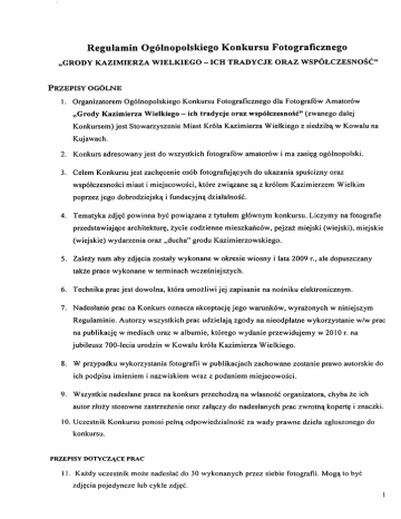 Regulamin Ogolnopolskiego Konkursu Fotograficznego ,,GRODY KAZIMIERZA WIELKIEGO - ICH TRADYCJE ORAZ WSP6LCZESNOSC" Przepisy og6lne 1. Organizatorem Ogolnopolskiego Konkursu Fotograficznego dla Fotografow Amatorow ,,Grody Kazimierza Wielkiego - ich tradycje oraz wspolczesnosc" (zwanego dalej Konkursem) jest Stowarzyszenie Miast Kr61a Kazimierza Wielkiego z siedziba^ w Kowalu na Kujawach. 2. Konkurs adresowany jest do wszystkich fotografow amatorow i ma zasi?g ogolnopolski. 3. Celem Konkursu jest zach?cenie osob fotografujq.cych do ukazania spuscizny oraz wspolczesnos'ci miast i miejscowosci, ktore zwiajzane sa_z krolem Kazimierzem Wielkim poprzez jego dobrodziejska^ i fundacyjna^dziafalnosc. 4. Tematyka zdj^c powinna bye powiazana z tytulem glownym konkursu. Liczymy na fotografie przedstawiajajce architektur?, zycie codzienne mieszkahcow, pejzaz miejski (wiejski), miejskie (wiejskie) wydarzenia oraz ,,ducha" grodu Kazimierzowskiego. 5. Zalezy nam aby zdj^cia zostaty wykonane w okresie wiosny i lata 2009 r., ale dopuszczany takze prace wykonane w terminach wczesniejszych. 6. Technika prac jest dowolna, ktora umozliwi jej zapisanie na nosniku elektronicznym. 7. NadesJanie prac na Konkurs oznacza akceptacj? jego warunkow, wyrazonych w niniejszym Regulaminie. Autorzy wszystkich prac udzielaj% zgody na nieodplatne wykorzystanie w/w prac na publikacj? w mediach oraz w albumie, ktorego wydanie przewidujemy w 2010 r. na jubileusz 700-lecia urodzin w Kowalu krola Kazimierza Wielkiego. 8. W przypadku wykorzystania fotografii w publikacjach zachowane zostanie prawo autorskie do ich podpisu imieniem i nazwiskiem wraz z podaniem miejscowosci. 9. Wszystkie nadesJane prace na konkurs przechodz^ na wlasnosc organizatora, chyba ze ich autorzlozy stosowne zastrzezenie oraz zat^czy do nadeslanych prac zwrotna^ kopert? i znaczki. 10. Uczestnik Konkursu ponosi peln^ odpowiedzialnosc za wady prawne dziela zgloszonego do konkursu. PRZEPISY DOTYCZ/\CE PRAC 11. Kazdy uczestnik moze nadeslac do 30 wykonanych przez siebie fotografii. Moga^ to bye zdj?cia pojedyncze lub cykle zdjec. 12. Akceptowane be.dajedynie prace przeslane na plycie DVD w formacie JPG o nie mniejszej rozdzielczosci niz 1200x1600 pikseli. 13. Fotografie, na ktorych b^da^si? znajdowac jakiekolwiek znaki, cyfry (np. daty) b^da^ dyskwalifikowane. 14. Material nadesfany na konkurs powinien bye dobrze zabezpieczony przed zniszczeniem. 15. Warunki techniczne nadsylanych prac: • Kazdemu ze zdj?c winien bye nadany numer, • W osobnym pliku na ptycie DVD winna bye informacja, o czy zdj^cia sa^ pojedyncze czy stanowia^ cykl lub jego cz?sc, o jednozdaniowy opis - co fotografia przedstawia, o na wierzehniej stronie ptyty DVD winno bye umieszczone GODLO autora prac. • W zala^czonej do pracy korespondencji w osobnej kopercie z GODLEM nalezy podac imi? nazwisko, adres zamieszkania, telefon kontaktowy, adres e-mail oraz wiek autora. 16. Prace nalezy wystac na adres: Stowarzyszenie Miast Krola Kazimierza Wielkiego 87-820 Kowal, ill. Zamkowa 4, z dopiskiem: KONKURS FOTOGRAFICZNY. 17. Wzi^cie udziahj w Konkursie jest rownoznaczne z wyrazeniem zgody na wykorzystanie danych osobowych uczestnika zgodnie z obowia^zuja^cymi przepisami prawa. NAGRODY I WYROZNIENIA 18. Organizator przewiduje nagrody rzeczowe o la^cznej puli 5 000 z\ oraz dla wszystkich uczestnikow Konkursu dyplomy. 19. Organizator Konkursu zastrzega sobie prawo zmiany zasad, przyznania nagrod lub przedhizenia konkursu w razie wystajDienia przyczyn niezaleznych od organizatora. Terminarz 20. Termin nadsylania prac mija dnia 30 wrzesnia 2009 r. (decyduje data stempla pocztowego). 21. Ocena prac przez Kapitul? Konkursu nastaj>i do dnia 31 pazdziernika 2009 r. 22. Decyzja Kapituty Konkursu jest ostateczna i nie podlega weryfikacji. 23. Wyniki konkursu zostana^ podane na stronie www.kazimierzwielki.pl 24. Uroczyste rozdanie nagrod wraz z wystawa. wyroznionych prac (wernisaz Konkursu) odb?dzie si? w Kowalu. O terminie przyznania nagrod uczestnicy zostana^powiadomieni pisemnie lub telefonicznie. Organizator zy