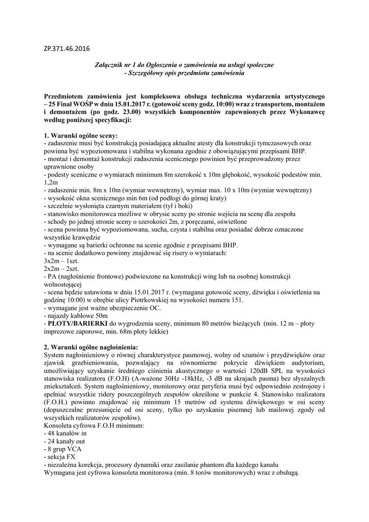 ZP.371.46.2016 Załącznik nr 1 do Ogłoszenia o zamówienia na usługi społeczne - Szczegółowy opis przedmiotu zamówienia Przedmiotem zamówienia jest kompleksowa obsługa techniczna wydarzenia artystycznego – 25 Finał WOŚP w dniu 15.01.2017 r. (gotowość sceny godz. 10:00) wraz z transportem, montażem i demontażem (po godz. 23.00) wszystkich komponentów zapewnionych przez Wykonawcę według poniższej specyfikacji: 1. Warunki ogólne sceny: - zadaszenie musi być konstrukcją posiadającą aktualne atesty dla konstrukcji tymczasowych oraz powinna być wypoziomowana i stabilna wykonana zgodnie z obowiązującymi przepisami BHP. - montaż i demontaż konstrukcji zadaszenia scenicznego powinien być przeprowadzony przez uprawnione osoby - podesty sceniczne o wymiarach minimum 8m szerokość x 10m głębokość, wysokość podestów min. 1,2m - zadaszenie min. 8m x 10m (wymiar wewnętrzny), wymiar max. 10 x 10m (wymiar wewnętrzny) - wysokość okna scenicznego min 6m (od podłogi do górnej kraty) - szczelnie wysłonięta czarnym materiałem (tył i boki) - stanowisko monitorowca możliwe w obrysie sceny po stronie wejścia na scenę dla zespołu - schody po jednej stronie sceny o szerokości 2m, z poręczami, oświetlone - scena powinna być wypoziomowana, sucha, czysta i stabilna oraz posiadać dobrze oznaczone wszystkie krawędzie - wymagane są barierki ochronne na scenie zgodnie z przepisami BHP. - na scenie dodatkowo powinny znajdować się risery o wymiarach: 3x2m – 1szt. 2x2m – 2szt. - PA (nagłośnienie frontowe) podwieszone na konstrukcji wing lub na osobnej konstrukcji wolnostojącej - scena będzie ustawiona w dniu 15.01.2017 r. (wymagana gotowość sceny, dźwięku i oświetlenia na godzinę 10:00) w obrębie ulicy Piotrkowskiej na wysokości numeru 151. - wymagane jest ważne ubezpieczenie OC. - najazdy kablowe 50m - PŁOTY/BARIERKI do wygrodzenia sceny, minimum 80 metrów bieżących (min. 12 m – płoty imprezowe zaporowe, min. 68m płoty lekkie) 2. Warunki ogólne nagłośnienia: System nagłośnieniowy o równej charakterystyce pasmowej, wolny od szumów i przydźwięków oraz zjawisk grzebieniowania, pozwalający na równomierne pokrycie dźwiękiem audytorium, umożliwiający uzyskanie średniego ciśnienia akustycznego o wartości 120dB SPL na wysokości stanowiska realizatora (F.O.H) (A-ważone 30Hz -18kHz, -3 dB na skrajach pasma) bez słyszalnych zniekształceń. System nagłośnieniowy, monitorowy oraz peryferia musi być odpowiednio zestrojony i spełniać wszystkie ridery poszczególnych zespołów określone w punkcie 4. Stanowisko realizatora (F.O.H.) powinno znajdować się minimum 15 metrów od systemu dźwiękowego w osi sceny (dopuszczalne przesunięcie od osi sceny, tylko po uzyskaniu pisemnej lub mailowej zgody od wszystkich realizatorów zespołów). Konsoleta cyfrowa F.O.H minimum: - 48 kanałów in - 24 kanały out - 8 grup VCA - sekcja FX - niezależna korekcja, procesory dynamiki oraz zasilanie phantom dla każdego kanału Wymagana jest cyfrowa konsoleta monitorowa (min. 8 torów monitorowych) wraz z obsługą. Wymagane jest zapewnienie: - obsługi FOH/AUX i pracowników technicznych – min. 4 osoby - nagrzewnic z rękawem elastycznym min. 3m, szt. 4 o mocy min. 30kW każda - transportu, montażu i demontażu zadaszenia sceny oraz montażu podestów Wymagane jest dostarczenie i rozdzielenie energii elektrycznej w ilości umożliwiającej realizację koncertów wraz z oświetleniem, z przyłącza do 80kW z zabezpieczeniem 63A, które zapewnia Zamawiający, przyłącze znajduje się w odległości 30 m od sceny. 3. Zapewnienie oświetlenia koncertów. Minimalne wymagania: 8 szt. PAR 64 • 4 szt. ruchoma głowa oświetleniowa • 4 szt. blinder frontowy • 2 szt. hazer + wentylator • konsoleta oświetleniowa • odpowiednie okablowanie do obsługi i zasilenia oświetlenia realizacja miksowania przez wykwalifikowaną obsługę, możliwość wykorzystania urządzeń, które posiada Zamawiający tj. - 16 szt. Flat Par tri7 - 10 szt. LED bar - 2 szt. Inno Color Beam 12 4. Zapewnianie sprzętu i obsługi zgodnie z riderami technicznymi zespołów zamieszczonymi poniżej: 4.1. Zespół 1 1. UKŁAD SCENY Rozmieszczenie oraz ilość odsłuchów, zostanie dostosowana do możliwości sceny. 2. NAGŁOŚNIENIE 3x mikrofony wokalowe 3x Di-box stereo(1x interfejs(ścieżki) i klawiatura sterująca [Syntezator #1] + 1x MikroKorg[syntezator #2] + 1x wzmacniacz basowy lub preamp basowy) 2 mikrofony do wzmacniacza gitarowego (combo 1x12 + kolumna 1x12). Zestaw mikrofonów do perkusji. 4.2. Zespół 2 RIDER TECHNICZNY Niniejszy dokument zawiera opis wymagań technicznych umożliwiających przeprowadzenie koncertu na odpowiednim poziomie artystycznym i technicznym, stanowi integralną część umowy. System PA: Preferowane systemy nagłośnieniowe wyprodukowane przez profesjonalne i uznane firmy (np. L-ACOUSTICS/Meyer/JBL/D&B itp.). Zamawiający nie dopuszcza aparatury wyprodukowanej „na wzór”, „prawie jak”, „w zasadzie takie samo jak”, itd. Konfiguracja oraz moc systemu powinna być dopasowa do audytorium oraz zapewniać równomierne pokrycie dźwiękiem nagłaśnianego obszaru. W przypadku braku pokrycia dźwiękiem obszaru przed sceną konieczne jest zastosowanie frontfilla/outfila, etc. System powinien być przygotowany nie późnej niż na godzinę przed planowaną próbą. KONSOLETA FOH: Preferowana konsoleta cyfrowa. Jeżeli jest analogowa to powinna być wyposażona w filtry górno i dolno przepustowe, cztery punkty korekcji w tym dwa parametryczne, trzy wysyłki aux do procesorów efektowych. W przypadku braku konsolety monitorowej konsoleta musi posiadać dodatkowo cztery wysyłki aux/pre torów monitora plus EQ zainsertowany w torze. PROCESORY DŹWIĘKU: - EQ 31 w sumie LR - Compresor x 6 - Gate x 5 - FX: 2 x Rev/Plate/Hall - 1 x Delay Monitory: Zespół potrzebuje 6 niezależnych torów monitora + wedge na stanowisku monitoro