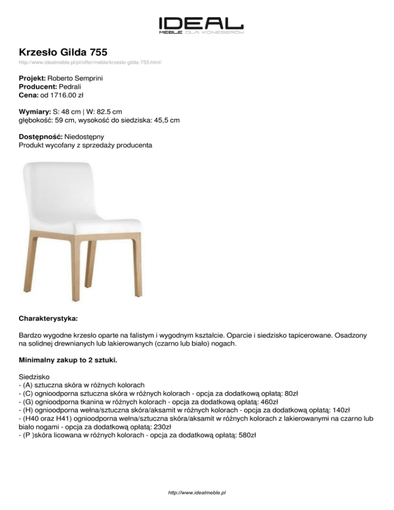 Krzesło Gilda 755 http://www.idealmeble.pl/pl/offer/meble/krzeslo-gilda-755.html/ Projekt: Roberto Semprini Producent: Pedrali Cena: od 1716.00 zł Wymiary: S: 48 cm | W: 82.5 cm głębokość: 59 cm, wysokość do siedziska: 45,5 cm Dostępność: Niedostępny Produkt wycofany z sprzedaży producenta Charakterystyka: Bardzo wygodne krzesło oparte na falistym i wygodnym kształcie. Oparcie i siedzisko tapicerowane. Osadzony na solidnej drewnianych lub lakierowanych (czarno lub biało) nogach. Minimalny zakup to 2 sztuki. Siedzisko - (A) sztuczna skóra w różnych kolorach - (C) ognioodporna sztuczna skóra w różnych kolorach - opcja za dodatkową opłatą: 80zł - (G) ognioodporna tkanina w różnych kolorach - opcja za dodatkową opłatą: 460zł - (H) ognioodporna wełna/sztuczna skóra/aksamit w różnych kolorach - opcja za dodatkową opłatą: 140zł - (H40 oraz H41) ognioodporna wełna/sztuczna skóra/aksamit w różnych kolorach z lakierowanymi na czarno lub biało nogami - opcja za dodatkową opłatą: 230zł - (P )skóra licowana w różnych kolorach - opcja za dodatkową opłatą: 580zł http://www.idealmeble.pl Dostępne wersje produktu: nazwa produktu Krzesło Gilda 755 warianty stolarka kolor dąb bielony ( RS) cena 1716.00zł dostępne Niedostępny Krzesło Gilda 755 stolarka kolor wenge 1716.00zł (W) Niedostępny http://www.idealmeble.pl Zdjęcia produktu: http://www.idealmeble.pl Powered by TCPDF (www.tcpdf.org)