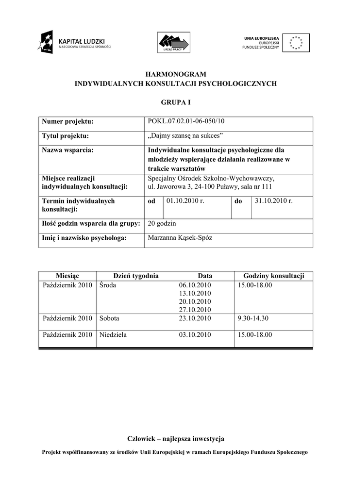 HARMONOGRAM INDYWIDUALNYCH KONSULTACJI PSYCHOLOGICZNYCH GRUPA I Numer projektu: POKL.07.02.01-06-050/10 Tytuł projektu: „Dajmy szansę na sukces” Nazwa wsparcia: Indywidualne konsultacje psychologiczne dla młodzieży wspierające działania realizowane w trakcie warsztatów Specjalny Ośrodek Szkolno-Wychowawczy, ul. Jaworowa 3, 24-100 Puławy, sala nr 111 Miejsce realizacji indywidualnych konsultacji: 01.10.2010 r. Termin indywidualnych konsultacji: od Ilość godzin wsparcia dla grupy: 20 godzin Imię i nazwisko psychologa: Marzanna Kąsek-Spóz Miesiąc Październik 2010 Dzień tygodnia Środa Październik 2010 Październik 2010 do 31.10.2010 r. Godziny konsultacji 15.00-18.00 Sobota Data 06.10.2010 13.10.2010 20.10.2010 27.10.2010 23.10.2010 Niedziela 03.10.2010 15.00-18.00 9.30-14.30 Człowiek – najlepsza inwestycja Projekt współfinansowany ze środków Unii Europejskiej w ramach Europejskiego Funduszu Społecznego