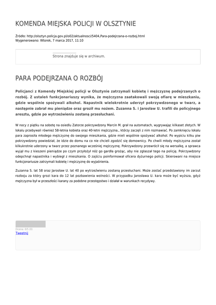 KOMENDA MIEJSKA POLICJI W OLSZTYNIE Źródło: http://olsztyn.policja.gov.pl/o02/aktualnosci/5404,Para-podejrzana-o-rozboj.html Wygenerowano: Wtorek, 7 marca 2017, 11:10 Strona znajduje się w archiwum. PARA PODEJRZANA O ROZBÓJ Policjanci z Komendy Miejskiej policji w Olsztynie zatrzymali kobietę i mężczyznę podejrzanych o rozbój. Z ustaleń funkcjonariuszy wynika, że mężczyzna zaatakowali swoją ofiarę w mieszkaniu, gdzie wspólnie spożywali alkohol. Napastnik wielokrotnie uderzył pokrzywdzonego w twarz, a następnie zabrał mu pieniądze oraz groził mu nożem. Zuzanna S. i Jarosław U. trafili do policyjnego aresztu, gdzie po wytrzeźwieniu zostaną przesłuchani. W nocy z piątku na sobotę na osiedlu Zatorze pokrzywdzony Marcin M. grał na automatach, wygrywając kilkaset złotych. W lokalu przebywali również 58-letnia kobieta oraz 40-letni mężczyzna., którzy zaczęli z nim rozmawiać. Po zamknięciu lokalu para zaprosiła młodego mężczyznę do swojego mieszkania, gdzie mieli wspólnie spożywać alkohol. Po wypiciu kilku piw pokrzywdzony powiedział, że idzie do domu na co nie chcieli zgodzić się domownicy. Po chwili młody mężczyzna został kilkukrotnie uderzony w twarz przez poznanego wcześniej mężczyznę. Pokrzywdzony przewrócił się na wersalkę, a sprawca wyjął mu z kieszeni pieniądze po czym przyłożył nóż go gardła grożąc, aby nie zgłaszał tego na policję. Pokrzywdzony odepchnął napastnika i wybiegł z mieszkania. O zajściu poinformował oficera dyżurnego policji. Skierowani na miejsce funkcjonariusze zatrzymali kobietę i mężczyznę do wyjaśnienia. Zuzanna S. lat 58 oraz Jarosław U. lat 40 po wytrzeźwieniu zostaną przesłuchani. Może zostać przedstawiony im zarzut rozboju za który grozi kara do 12 lat pozbawienia wolności. W przypadku Jarosława U. kara może być wyższa, gdyż mężczyzna był w przeszłości karany za podobne przestępstwo i działał w warunkach recydywy. Ocena: 0/5 (0) Tweetnij