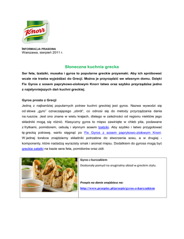 INFORMACJA PRASOWA Warszawa, sierpień 2011 r. Słoneczna kuchnia grecka Ser feta, tzatziki, musaka i gyros to popularne greckie przysmaki. Aby ich spróbować wcale nie trzeba wyjeżdżać do Grecji. Można je przyrządzić we własnym domu. Dzięki Fix Gyros z sosem paprykowo-ziołowym Knorr łatwo oraz szybko przyrządzisz jedno z najsłynniejszych dań kuchni greckiej. Gyros prosto z Grecji Jedną z najbardziej popularnych potraw kuchni greckiej jest gyros. Nazwa wywodzi się od słowa „gyro” oznaczającego „obrót”, co odnosi się do metody przyrządzania dania na ruszcie. Jest ono znane w wielu krajach, dlatego w zależności od regionu niektóre jego składniki mogą się różnić. Klasyczny gyros to mięso zawinięte w chleb pita, podawane z frytkami, pomidorem, cebulą i słynnym sosem tzatziki. Aby szybko i łatwo przygotować tę grecką potrawę, warto sięgnąć po Fix Gyros z sosem paprykowo-ziołowym Knorr. W jednej torebce znajdziemy składniki potrzebne do stworzenia sosu, a w drugiej komponenty, które nadadzą wyrazisty smak i aromat mięsu. Dodatkiem do gyrosa mogą być greckie sałatki na bazie sera feta, pomidorów oraz ziół. Gyros z kurczakiem Doskonały pomysł na oryginalny obiad w greckim stylu. Przepis na danie znajdziesz na: http://www.przepisy.pl/przepis/gyros-z-kurczakiem Mnóstwo sposobów na pyszne i niebanalne dania oraz porady i forum kulinarne znajdziesz na www.przepisy.pl Kulinarne inspiracje znajdziesz również na naszym profilu na Facebook’u http://www.facebook.com/CoDzisNaObiad Wolisz przepisy w wersji video? Szukaj ich na profilu „Co dziś na obiad” na You Tube http://www.youtube.com/user/codzisnaobiad Informacje dla mediów: Anna Bielecka Knorr PR email: [email protected] tel: +48 22 5706521 Unilever Polska Sp. z o.o., ul. Domaniewska 49 02-672 Warszawa Joanna Niemiec public relations department email: [email protected] mobile: +48 668 341 541 Marta Nobis public relations department email: [email protected] mobile: +48 602 461 945 Multi Communications Sp. z o.o., ul. Wrotkowa 14, 02-553 Warszawa tel.: +48 22 845 04 36, fax: +48 22 845 65 92