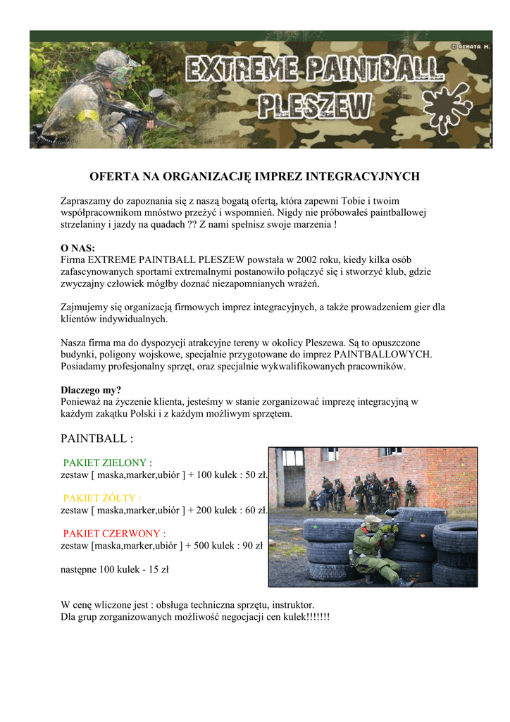 OFERTA NA ORGANIZACJĘ IMPREZ INTEGRACYJNYCH Zapraszamy do zapoznania się z naszą bogatą ofertą, która zapewni Tobie i twoim współpracownikom mnóstwo przeŜyć i wspomnień. Nigdy nie próbowałeś paintballowej strzelaniny i jazdy na quadach ?? Z nami spełnisz swoje marzenia ! O NAS: Firma EXTREME PAINTBALL PLESZEW powstała w 2002 roku, kiedy kilka osób zafascynowanych sportami extremalnymi postanowiło połączyć się i stworzyć klub, gdzie zwyczajny człowiek mógłby doznać niezapomnianych wraŜeń. Zajmujemy się organizacją firmowych imprez integracyjnych, a takŜe prowadzeniem gier dla klientów indywidualnych. Nasza firma ma do dyspozycji atrakcyjne tereny w okolicy Pleszewa. Są to opuszczone budynki, poligony wojskowe, specjalnie przygotowane do imprez PAINTBALLOWYCH. Posiadamy profesjonalny sprzęt, oraz specjalnie wykwalifikowanych pracowników. Dlaczego my? PoniewaŜ na Ŝyczenie klienta, jesteśmy w stanie zorganizować imprezę integracyjną w kaŜdym zakątku Polski i z kaŜdym moŜliwym sprzętem. PAINTBALL : PAKIET ZIELONY : zestaw [ maska,marker,ubiór ] + 100 kulek : 50 zł. PAKIET śÓŁTY : zestaw [ maska,marker,ubiór ] + 200 kulek : 60 zł. PAKIET CZERWONY : zestaw [maska,marker,ubiór ] + 500 kulek : 90 zł następne 100 kulek - 15 zł W cenę wliczone jest : obsługa techniczna sprzętu, instruktor. Dla grup zorganizowanych moŜliwość negocjacji cen kulek!!!!!!! Pozostałe atrakcje Gladiator - koszt: 990 zł za cały czas imprezy Black Jack - koszt: 1200 zł za 5 h zabawy Boisko do piłki noŜnej: - koszt: 2500 zł za cały czas imprezy Mechaniczny byk: - koszt: 1700 zł za cały czas imprezy Casino – Ruletka - koszt: 1500 zł za 5 h zabawy. (Zestaw: Stół do Ruletki i Black Jacka: 2500 zł) Gry i zabawy: - koszt: 800 zł - Realizacja 6 konkurencji: (Narty małysza, kołek kręciołek, przeciąganie liny, wbijanie ćwieka, zbijanie balonów, dŜdŜownica) konkurencje rozgrywane są co 30 minut podczas imprezy Karaoke - prowadzenie i oprogramowanie z rzutnikiem i ekranem: 900 zł "KING SIZE" - Realizacja imprezy opartej na fabule filmu - 4000 zł Łucznictwo: - koszt 80 zł za 1 stanowisko na 1 h Malowanie buziek: Off-road Quady - koszt 100 zł za 1 stanowisko na 1 h - przejazdy autami terenowymi z przeszkodami - 850 zł za 1 auto - dla dzieci: 100 zł za 1 szt. na 1 h - dla dorosłych: 220 zł za 1 szt. na 1 h Trampolina do skakania: - koszt 350 zł za 1 szt. na 1 h Strzelectwo: - wiatrówki/pistolety: 90 zł za 1 stanowisko na 1 h ZjeŜdŜalnia dla dzieci: - koszt: 1100 zł za cały czas trwania imprezy