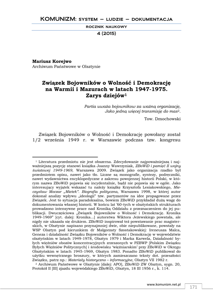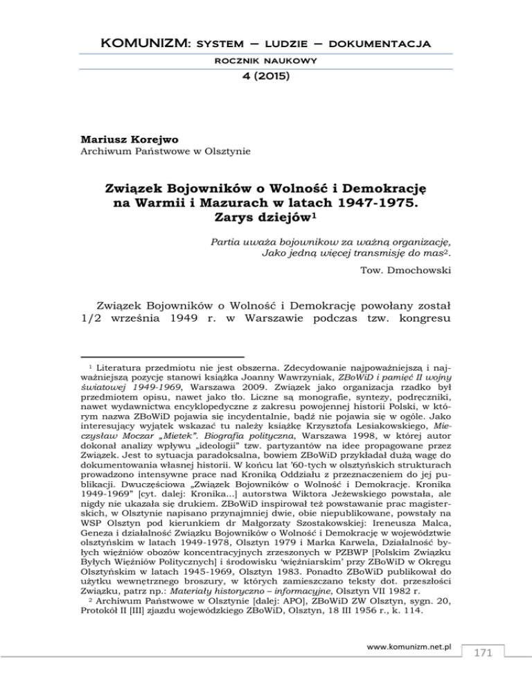 KOMUNIZM: system – ludzie – dokumentacja rocznik naukowy 4 (2015) Mariusz Korejwo Archiwum Państwowe w Olsztynie Związek Bojowników o Wolność i Demokrację na Warmii i Mazurach w latach 1947-1975. Zarys dziejów1 Partia uważa bojownikow za ważną organizację, Jako jedną więcej transmisję do mas 2. Tow. Dmochowski Związek Bojowników o Wolność i Demokrację powołany został 1/2 września 1949 r. w Warszawie podczas tzw. kongresu 1 Literatura przedmiotu nie jest obszerna. Zdecydowanie najpoważniejszą i najważniejszą pozycję stanowi książka Joanny Wawrzyniak, ZBoWiD i pamięć II wojny światowej 1949-1969, Warszawa 2009. Związek jako organizacja rzadko był przedmiotem opisu, nawet jako tło. Liczne są monografie, syntezy, podręczniki, nawet wydawnictwa encyklopedyczne z zakresu powojennej historii Polski, w którym nazwa ZBoWiD pojawia się incydentalnie, bądź nie pojawia się w ogóle. Jako interesujący wyjątek wskazać tu należy książkę Krzysztofa Lesiakowskiego, Mieczysław Moczar „Mietek”. Biografia polityczna, Warszawa 1998, w której autor dokonał analizy wpływu „ideologii” tzw. partyzantów na idee propagowane przez Związek. Jest to sytuacja paradoksalna, bowiem ZBoWiD przykładał dużą wagę do dokumentowania własnej historii. W końcu lat ’60-tych w olsztyńskich strukturach prowadzono intensywne prace nad Kroniką Oddziału z przeznaczeniem do jej publikacji. Dwuczęściowa „Związek Bojowników o Wolność i Demokrację. Kronika 1949-1969” [cyt. dalej: Kronika...] autorstwa Wiktora Jeżewskiego powstała, ale nigdy nie ukazała się drukiem. ZBoWiD inspirował też powstawanie prac magisterskich, w Olsztynie napisano przynajmniej dwie, obie niepublikowane, powstały na WSP Olsztyn pod kierunkiem dr Małgorzaty Szostakowskiej: Ireneusza Malca, Geneza i działalność Związku Bojowników o Wolność i Demokrację w województwie olsztyńskim w latach 1949-1978, Olsztyn 1979 i Marka Karwela, Działalność byłych więźniów obozów koncentracyjnych zrzeszonych w PZBWP [Polskim Związku Byłych Więźniów Politycznych] i środowisku ‘więźniarskim’ przy ZBoWiD w Okręgu Olsztyńskim w latach 1945-1969, Olsztyn 1983. Ponadto ZBoWiD publikował do użytku wewnętrznego broszury, w których zamieszczano teksty dot. przeszłości Związku, patrz np.: Materiały historyczno – informacyjne, Olsztyn VII 1982 r. 2 Archiwum Państwowe w Olsztynie [dalej: APO], ZBoWiD ZW Olsztyn, sygn. 20, Protokół II [III] zjazdu wojewódzkiego ZBoWiD, Olsztyn, 18 III 1956 r., k. 114. www.komunizm.net.pl 171 Mariusz Korejwo zjednoczeniowego. Wchłonął on struktury, majątek oraz członków jedenastu zlikwidowanych wówczas organizacji kombatanckich 3. Olsztyńskie struktury ZBoWiD zawiązały się 12 września 1949 r., kiedy to obrano pierwszy, prowizoryczny (tymczasowy) Zarząd Okręgowy z prezesem Feliksem Zimnochem na czele 4. W województwie olsztyńskim ZBoWiD wchłonął dwa stowarzyszenia kombatanckie: istniejący od 1945 r. Polski Związek byłych Więźniów Politycznych Hitlerowskich Więzień i Obozów Koncentracyjnych oraz funkcjonujący od jesieni 1948 r. Związek Bojowników z Faszyzmem i Najeźdźcą Hitlerowskim o Niepodległość i Demokrację5. Zarząd Okręgowy ZBoWiD w latach 1949-1955 Najwyższą władzą Związku na każdym szczeblu zarządzania były powszechne zebrania członkowskie („walne”), które na poziomie okręgów przybierały postać zjazdów delegatów, a na szczeblu krajowym kongresów ZBoWiD. I wojewódzki zjazd ZBoWiD w Olsztynie odbył się 11 grudnia 1949 r. Obrano wówczas „regularne” już władze Okręgu 6: prezesem został Aleksander Bartnikowski7, a jego zastępcami Władysław Balicki i Bolesław Troicki. Kolejny zjazd wojewódzki miał miejsce 9 grudnia Mała Encyklopedia Wojskowa, t. III, Warszawa 1971, s. 623. APO, ZBoWiD ZW Olsztyn, sygn. 103, Kronika Związku Bojowników o Wolność i Demokrację na Warmii i Mazurach 1946-1969 r., s. 26. Feliks Zimnoch, ur. w 1889 r., zm. W 1972 r., prezes ZO ZBoWiD Olsztyn (12 IX – 11 XII 1949 r.). Przed II wojną światową kolejarz, członek Socjaldemokracji Królestwa Polskiego i Litwy, Komunistycznej Partii Polski oraz Komunistycznej Partii Zachodniej Ukrainy; podczas wojny więzień KL Stutthoff; po wojnie zastępca naczelnika Wydziału Zaopatrzenia DOKP Olsztyn, następnie przewodniczący MRN Olsztyn (27 V 1946 r. – 28 IV 1947 r.), radny MRN Olsztyn; członek ZW TPPR Olsztyn prezes Zarządu Wojewódzkiego Polskiego Związku byłych Więźniów Politycznych Hitlerowskich Więzień i Obozów Koncentracyjnych w Olsztynie (03 X 1948 r. - IX 1949 r.) 5 Patrz: M. Korejwo, Związki kombatanckie na Warmii i Mazurach 1945-1949, „Debata”, nr 4 (91) 2015 r. 6 APO, ZBoWiD ZW Olsztyn, sygn. 20, Protokół I wojewódzkiego zjazdu ZBoWiD, Olsztyn 11 XII 1949 r. 7 Aleksander Bartnikowski, ur. 12 XII 1901 r.; prezes ZO ZBoWiD Olsztyn (11 XII 1949 r. – 28 III 1955 r.). Od 11 XII 1949 r. przewodniczący Okręgowej Rady Związków Zawodowych w Olsztynie, następnie Wojewódzkiej Rady Związków Zawodowych w Olsztynie; w 1950 r. przewodniczący Wojewódzkiego Komitetu Obrońców Pokoju w Olsztynie; od 1952 r. członek władz WK Frontu Narodowego w Olsztynie (m.in.: członek prezydium i sekretarz); od IV 1947 r. radny MRN Olsztyn; od 05 VI 1950 r. zastępca przewodniczącego PMRN Olsztyn; członek PPR (kierownik Wydziału Zawodowego KW PPR Olsztyn); członek PZPR (członek egzekutywy KW PZPR Olsztyn od 13 VI 1949 r. do 19 IV 1953 r., członek plenum KW PZPR Olsztyn od 23 XII 1948 r. do 2/3 X 1954 r.). W początkach 1955 r. wyjechał z Olsztyna do miejscowości Szczawno – Zdrój. 3 4 172 www.komunizm.net.pl Zwiazek Bojowników o WolnoŚĆ i Demokracje 1951 r.8, na czele Zarządu Okręgowego pozostał Bartnikowski9, wiceprezesami obrano wówczas Władysława Spychałę i Wiktora Barwickiego. Władzą zarządzającą Związku na szczeblu wojewódzkim by