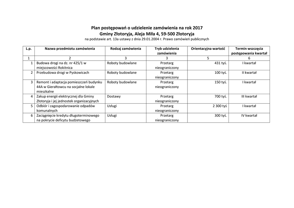 Plan postępowań o udzielenie zamówienia na rok 2017 Gminy Złotoryja, Aleja Miła 4, 59-500 Złotoryja na podstawie art. 13a ustawy z dnia 29.01.2004 r. Prawo zamówień publicznych L.p. 1 Nazwa przedmiotu zamówienia Rodzaj zamówienia 2 1 Budowa drogi na dz. nr 425/1 w miejscowości Rokitnica 2 Przebudowa drogi w Pyskowicach 3 Roboty budowlane 3 Remont i adaptacja pomieszczeń budynku 44A w Gierałtowcu na socjalne lokale mieszkalne 4 Zakup energii elektrycznej dla Gminy Złotoryja i jej jednostek organizacyjnych 5 Odbiór i zagospodarowanie odpadów komunalnych 6 Zaciągnięcie kredytu długoterminowego na pokrycie deficytu budżetowego Roboty budowlane Roboty budowlane Dostawy Usługi Usługi Tryb udzielenia zamówienia 3 Przetarg nieograniczony Przetarg nieograniczony Przetarg nieograniczony Przetarg nieograniczony Przetarg nieograniczony Przetarg nieograniczony Orientacyjna wartość 431 tyś. Termin wszczęcia postępowania kwartał 6 I kwartał 100 tyś. II kwartał 150 tyś. I kwartał 700 tyś. III kwartał 2 300 tyś I kwartał 300 tyś. IV kwartał 5