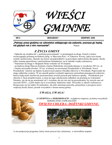 WIEŚCI GMINNE xxxxxxxxxxxxxxxxxxxxxxxxxxxxxxxxxxxxxxxxxxxxxxxxxxxxxxxxxxxxxxxxxxxxxxxxxxxxxxxxxxxxxxxxxxxxxxxxxx NR 5 MOKOBODY SIERPIEŃ 2009 xxxxxxxxxxxxxxxxxxxxxxxxxxxxxxxxxxxxxxxxxxxxxxxxxxxxxxxxxxxxxxxxxxxxxxxxxxxxxxxxxxxxxxxxxxxxxxxxxx „Patrząc przez godzinę na człowieka oddającego się zabawie, poznasz go lepiej, niż gdybyś rok z nim rozmawiał”. Platon Z ŻYCIA GMINY - Opłaciła się cierpliwość i „polityka przeczekania” w przetargach na drogi. Został w końcu rozstrzygnięty przetarg na budowę dróg: w Męczynie Kol. i w Żukowie. Kwoty, jakie tym razem zostały zaoferowane, okazały się niższe od poprzednich i są powodem zadowolenia dla gminy. Kiedy tylko zostaną sprawdzone i potwierdzone formalności, na te odcinki wejdą wykonawcy. - Natomiast na drogę w Skupiach firma wchodzi od 10 sierpnia. - na budowę drogi Męczyn Kolonia, Gmina Mokobody otrzymała dotację w wysokości 293 tys. zł, - Gmina otrzymała również 95 tys. zł dotacji na utworzenie Przedszkola w Niwiskach. Nowe Przedszkole mieścić się będzie na pierwszym piętrze Ośrodka Zdrowia w Niwiskach. Poprowadzi do niego oddzielne wejście. W ten sposób gmina wychodzi naprzeciw potrzebom pracujących rodziców, którzy będą mieli możliwość pozostawiania swoich pociech pod fachowa opieką. Przedszkole jest obecnie w fazie projektowania, a zaraz po jego zakończeniu odbędzie się przetarg na wykonanie. Niestety, nie da się go uruchomić od 1 września, ale nic nie stoi na przeszkodzie, by ruszyło ono od stycznia 2010 r., a jeśli stanie się to wzcześniej- będziemy radzi. Wszystko w rękach wykonawcy. Rozpocznie się też nabór 26 maluchów, ale jeśli zaistnieje potrzeba, pomyślimy o przyjęciu nieco większej liczby dzieci, przede wszystkim z terenu naszej gminy. UWAGA, UWAGA! zapraszamy: 23 SIERPNIA w MOKOBODACH - wyjątkowa impreza, na którą wszystkich SERDECZNIE ZAPRASZAMY ŚWIĘTO CHLEBA- DOŻYNKI GMINNE. A oto propozycja programu, który może jeszcze być zmieniony w niewielkim stopniu: 1 PROGRAM ŚWIĘTA CHLEBA- MOKOBODY, 23 SIERPNIA- niedziela -11.00- Zbiórka delegacji poszczególnych miejscowości z wieńcami, -11.15- Przemarsz korowodu dożynkowego do kościoła - 11. 30- Msza św. w Kościele Parafialnym p./w. Św. Jadwigi w Mokobodach - 12.40- przejście korowodu dożynkowego pod scenę, - 12.45- Oficjalne otwarcie Święta Chleba/Dożynek Gminnych - 12.50- obrzędy dożynkowe - 12.55- ogłoszenie konkursów: - na najpiękniejszy wieniec dożynkowy, wykonany przez poszczególne sołectwa - na najlepszy chleb w dwóch kategoriach: piekarnie oraz wypiek gospodarski (NAGRODA PUBLICZNOŚCI/KONSUMENTÓW) - na hasło propagujące chleb, - 13.00- Przedszkolne powitanie -13.15 - prelekcja dra Henryka Piesiewicza - POLSKI CHLEB- CHLEBEM NA NATURALNYM ZAKWASIE W międzyczasie: wesołe miasteczko dla dzieci, degustacja pieczywa, głosowania, oferty pracy, ogródek piwny, grill itp. - 14.10 - Mokobody dla Lwów- występ gimnazjalistów - 14.30- występ SZT RETRO Mokobody - 15.20 - konkursy na wesoło: karmienie się wzajemne bułkami lub chlebem (zasłonięte oczy) oraz kto szybciej zje kawałek chleba be pomocy rąk (związane ręce) - 15.45 -występ kabaretu ŁZY SOŁTYSA - 17.00- wyścig kolarski Zaliwie – Mokobody, - 17.30- występ kapeli WIŚNIEWIACY - 18.30- Rozstrzygnięcie konkursów i wręczenie nagród: na najlepszy chleb w kategorii PIEKARNIE oraz WYPIEK GOSPODARSKI, konkursu PIĘKNA ZAGRODA, konkursów: na najpiękniejszy wieniec, na najlepsze hasło propagujące chleb oraz na najlepszy chleb- nagroda publiczności/konsumentów - 19.30-występ OLI MANULIK (gwiazda wieczoru - dyskoteka) - 21.00 dyskoteka (DJ Tomek i Kuba) OGŁOSZENIA: zde W WYŚCIGU KOLARSKIM mogą wziąć udział przede wszystkim chłopcy i mężczyźni powyżej lat 13. Dopuszczalny jest start osób nieco młodszych, o czym decydują organizatorzy prowadzący wyścig. Od zawodników, którzy nie ukończyli 18 roku życia wymagana jest ZGODA Rodziców na udział w wyścigu następującej treści: Oświadczenie Wyrażam zgodę na start mojego syna (córki) …………………. ………….. (imię nazwisko) urodzonego/ej ……………. (data urodzenia) w wyścigu kolarskim dnia 23 sierpnia 2009 r. w kasku rowerzysty – bez kasku rowerzysty, za co biorę odpowiedzialność. (niepotrzebne skreślić). Podpis rodzica: …………………………………………. Uczestnik powinien posiadać kask rowerowy. Dopuszczalny jest udział w wyścigu bez kasku, ale na wyłączną odpowiedzialność rodziców i zawodników. Każdy uczestnik musi posiadać swój rower, sprawny, bez jakichkolwiek usterek. Stan roweru przed startem sprawdzi Komisja. Warunkiem startu jest zapisanie się w gminie i otrzymanie odpowiedniego numeru, przypinanego lub przywiązywanego do koszulki. 2 Zapisać się do wyścigu można u p. Elżbiety Gałaś lub w Urzędzie Gminy – w sekretariacie. - Młodsi – w wieku 9- 12 lat- w tym samym czasie mogą wziąć w starcie na KOLARSKIM TORZE PRZESZKÓD, na który można się zgłosić wcześniej w Urzędzie Gminy (sekretariat) lub w Święto Chleba do organizatorów. Konkurencja odbędzie się na jednym rowerze, dostarczonym przez organizatorów. OGŁOSZENIE- ZAPROSZENIE Zapraszamy piekarnie oraz tych, co wypiekają chleb we własnym zakresie do udziału ŚWIĘCIE CHLEBA (Dożynki Gminne) w MOKOBODACH w dniu 23 sierpnia 2009 r. Każda piekarnia lub osoba wypiekająca chleb sposobem gospodarskim może ustawić własne stoisko. Osoby lub firmy zainteresowane będą miały możliwość wysłuchać prelekcji o chlebie na zakwasie, skonsultować się z autorytetem w dziedzinie piekarnictwa dr inż. H. Piesiewiczem oraz wziąć udział w konkursie na najlepszy chleb w kategorii „Piekarnie” lub „Wypiek gospodarski”. Istnieje możliwość bezpłatnego zaopatrzenia się w dobrą mąkę do wypieku pieczywa. Szczegółowe informacje: Elżbieta Gałaś tel./faks 025 641 13 15 l