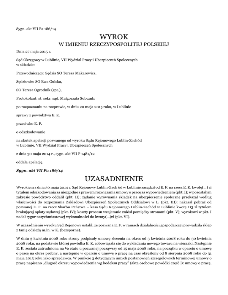 Sygn. akt VII Pa 186/14 WYROK W IMIENIU RZECZYPOSPOLITEJ POLSKIEJ Dnia 27 maja 2015 r. Sąd Okręgowy w Lublinie, VII Wydział Pracy i Ubezpieczeń Społecznych w składzie: Przewodniczący: Sędzia SO Teresa Makarewicz, Sędziowie: SO Ewa Gulska, SO Teresa Ogrodnik (spr.), Protokolant: st. sekr. sąd. Małgorzata Sobczuk; po rozpoznaniu na rozprawie, w dniu 20 maja 2015 roku, w Lublinie sprawy z powództwa E. K. przeciwko E. F. o odszkodowanie na skutek apelacji pozwanego od wyroku Sądu Rejonowego Lublin-Zachód w Lublinie, VII Wydział Pracy i Ubezpieczeń Społecznych z dnia 30 maja 2014 r., sygn. akt VII P 1481/12 oddala apelację. Sygn. akt VII Pa 186/14 UZASADNIENIE Wyrokiem z dnia 30 maja 2014 r. Sąd Rejonowy Lublin-Zach ód w Lublinie zasądził od E. F. na rzecz E. K. kwotę(...) zł tytułem odszkodowania za niezgodne z prawem rozwiązania umowy o pracę za wypowiedzeniem (pkt. I); w pozostałym zakresie powództwo oddalił (pkt. II); żądanie wyrównania składek na ubezpieczenie społeczne przekazał według właściwości do rozpoznania Zakładowi Ubezpieczeń Społecznych Oddziałowi w L. (pkt. III): nakazał pobrać od pozwanej E. F. na rzecz Skarbu Państwa – kasa Sądu Rejonowego Lublin-Zachód w Lublinie kwotę 113 zł tytułem brakującej opłaty sądowej (pkt. IV); koszty procesu wzajemnie zniósł pomiędzy stronami (pkt. V); wyrokowi w pkt. I nadał rygor natychmiastowej wykonalności do kwoty(...)zł (pkt. VI). W uzasadnieniu wyroku Sąd Rejonowy ustalił, że pozwana E. F. w ramach działalności gospodarczej prowadziła sklep z tanią odzieżą m.in. w K. (bezsporne). W dniu 3 kwietnia 2008 roku strony podpisały umowę zlecenia na okres od 3 kwietnia 2008 roku do 30 kwietnia 2008 roku, na podstawie której powódka E. K. zobowiązała się do wykładania nowego towaru na wieszaki. Następnie E. K. została zatrudniona na ½ etatu u pozwanej począwszy od 15 maja 2008 roku, na początku w oparciu o umowę o pracę na okres próbny, a następnie w oparciu o umowę o pracę na czas określony od 8 sierpnia 2008 roku do 31 maja 2015 roku jako sprzedawca. W punkcie 3 dotyczącym innych postanowień szczegółowych terminowej umowy o pracę napisano „długość okresu wypowiedzenia wg kodeksu pracy” (akta osobowe powódki część B: umowy o pracę, umowa zlecenia – karty nienumerowane). Ostatnio powódka otrzymywała wynagrodzenie w wysokości (...) zł brutto miesięcznie (zaświadczenie o zarobkach - k. 20, listy płac - k. 32 - 47). Sklep pozwanej był otwarty od poniedziałku do piątku w godzinach od 9 do 17, a w soboty od 9 do 14 (zeznania świadków I. W. - k. 89v - 90, J. M. - k. 90 - 90v, zeznania pozwanej - k. 129v - 130). Oprócz powódki w sklepie był zatrudniony na podstawie umowy o pracę na czas nieokreślony w pełnym wymiarze czasu pracy również J. M.. E. K. zwykle pracowała w sklepie od poniedziałku do piątku. Zdarzało się, że pracowała również w soboty. Taka sytuacja zwykle zachodziła wówczas, gdy powódka nie mogła przyjść do pracy „na tygodniu” albo musiała w czasie pracy załatwić prywatne sprawy. W soboty natomiast pracował w sklepie przeważnie J. M., czasami również pozwana. Powódka zasadniczo pracowała 4 godziny dziennie (zeznania świadków J. M. - k. 90 - 90v, A. R. - k. 129v, zeznania pozwanej - k. 129v - 130, listy obecności - 48 - 72v, wnioski urlopowe powódki - k. 73 - 81). W dniu 11 października 2012 roku pozwana wypowiedziała E. K. umowę o pracę z dnia 8 sierpnia 2008 roku z zachowaniem 2 tygodniowego okresu wypowiedzenia. W piśmie rozwiązującym stosunek pracy E. F. wskazał, iż przyczyną zwolnienia jest utrata zaufania. Nadto, pozwana zawarła pouczenie o terminie i sposobie odwołania się od decyzji pracodawcy. Stosunek pracy ustał z dniem 27 października 2012 roku (akta osobowe powódki część B: oświadczenie pracodawcy, świadectwo pracy – karty nienumerowane). Przytoczony wyżej stan faktyczny Sąd ustalił w oparciu o powołane dowody, które w zakresie, w jakim posłużyły do ustalenia stanu faktycznego, obdarzył wiarą. Na wiarę zasługują przede wszystkim dowody z dokumentów dołączonych do akt niniejszego postępowania i akt osobowych powódki, które nie budzą wątpliwości co do ich prawdziwości. Nie były też kwestionowane przez strony. Również i Sąd nie znalazł podstaw do odmówienia im waloru prawdziwości i autentyczności. Ponadto, stan faktyczny został ustalony w oparciu o zeznania świadków: I. W. (k. 89v - 90), J. M. (k. 90 - 90v) oraz A. R. (k. 129v). Sąd Rejonowy generalnie obdarzył wiarą w całości zeznania świadków na okoliczności związane z czasem i rozkładem pracy powódki w spornym okresie. Zdaniem Sądu zeznania te są jasne i rzeczowe, a także korespondują z pozostałym dowodami, które zostały uznane przez Sąd za wiarygodne. Oceniając zeznania pozwanej E. F. Sąd analizował wskazane przez nią okoliczności w świetle zasad logicznego rozumowania, doświadczenia życiowego, a przede wszystkim w kontekście zeznań przesłuchanych w sprawie świadków i złożonych na rozprawie dokumentów. Zeznania te zasadniczo nie budziły wątpliwości i zostały uznane za szczere i jednoznaczne. Na wiarę zasługują przede wszystkim zeznania pozwanej co do wymiaru i rozkładu czasu pracy powódki, bowiem w tym zakresie znalazły one obiektywne odzwierciedlenie w zgromadzonym materiale procesowym. Niemniej jednak co do prawnych konsekwencji zawartej w dniu 8 sierpnia 20008 roku wieloletniej umowy o pracę Sąd ma odmienne zapatrywania, o czym szerzej poniżej. Niniejsze powództwo jest zasadne jedynie w części. Na wstępie należy wskazać, że co do zasady umowa o pracę zawarta na czas określony nie podlega wypowiadaniu, chyba że jest zawarta na okres powyżej 6 miesięcy, zaś strony w jej treści dopuściły możliwość jej rozwiązania w tym trybie – art. 33 kp. Obowiązującym okresem wypowiedzenia jest w tym przypadk