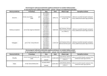 Harmonogram realizacji przedmiotów ogólnouczelnianych na studiach doktoranckich IV rok stacjonarnych studiów doktoranckich - semestr zimowy rok akademicki 2014/2015 Nazwa przedmiotu Ekonomia Prowadzący dr hab. Janusz Heller, UWM Data prof. Podstawy zarządzania prof. dr hab. Eugeniusz Niedzielski Pedagogika prof. dr hab. Henryk Mizerek 18.11.2014 r. 25.11.2014 r. 2.12.2014 r. 9.12.2014 r. 16.12.2014 r. 13.01.2015 r. 20.01.2015 r. 27.01.2015 r. 18.11.2014 r. 25.11.2014 r. 2.12.2014 r. 9.12.2014 r. 16.12.2014 r. 13.01.2015 r. 20.01.2015 r. 27.01.2015 r. 29.01.2015 r. 02.02.2015 r. 25.11.2014 r. 2.12.2014 r. 9.12.2014 r. 16.12.2014 r. 13.01.2015 r. 20.01.2015 r. 27.01.2015 r. 29.01.2015 r. 02.02.2015 r. Godz. Miejsce zajęć Dyscypliny naukowe 8.00-11.15 ul. R. Prawocheńskiego 19 sala nr 201 doktoranci wszystkich dyscyplin naukowych, którzy zadeklarowali wybór tego przedmiotu 8.00-10.30 Aula Teatralna Centrum Nauk Humanistycznych (ul. K.Obitza 1) doktoranci wszystkich dyscyplin naukowych, którzy zadeklarowali wybór tego przedmiotu 11.30-13.45 Aula Teatralna Centrum Nauk Humanistycznych* doktoranci wszystkich dyscyplin naukowych, którzy zadeklarowali wybór tego przedmiotu Harmonogram realizacji przedmiotów ogólnouczelnianych na studiach doktoranckich IV rok stacjonarnych studiów doktoranckich - semestr letni rok akademicki 2014/2015 Nazwa przedmiotu Prowadzący Data Filozofia dr hab. Krzysztof Kościuszko, prof. UWM od 24.02.2015 r. (wtorek) Etyka od 24.02.2015 r. dr hab. Dariusz Barbaszyński (wtorek) Godz. Miejsce zajęć Aula Teatralna Centrum 15.00-16.30 Nauk Humanistycznych (ul. K.Obitza 1) Aula Teatralna Centrum 16.45-18.15 Nauk Humanistycznych (ul. K.Obitza 1) Dyscypliny naukowe doktoranci wszystkich dyscyplin naukowych, którzy zadeklarowali wybór tego przedmiotu doktoranci wszystkich dyscyplin naukowych, którzy zadeklarowali wybór tego przedmiotu Harmonogram realizacji przedmiotu wydziałowego na studiach doktoranckich IV rok stacjonarnych studiów doktoranckich - semestr zimowy rok akademicki 2014/2015 Nazwa przedmiotu Data dr hab. inż. Paweł Wielgosz, prof. UWM 10.10.-14.11.2014 r. 21.11.2014 r. Systemy informacji przestrzennej dr inż. Artur Janowski 20.10.-24.11.2014 r. 01.12.2014r. 16.15-19.00 16.15-18.00 s.204/O1 (ul. Oczapowskiego 1) poniedziałek (system cotygodniowy) Metody pozycjonowania satelitarnego dr hab. Zofia Rzepecka, prof. UWM 28.10.-04.11.2014 r. 18.11.2014 r. 16.15-19.00 16.15-20.00 s. 13/O1 (ul. Oczapowskiego 1) wtorek (system cotygodniowy) Seminarium doktoranckie Godz. Miejsce zajęć Prowadzący 10.00-11.30 11.00-13.30 s. 7/O1 (ul. Oczapowskiego 1) piątek (system cotygodniowy)