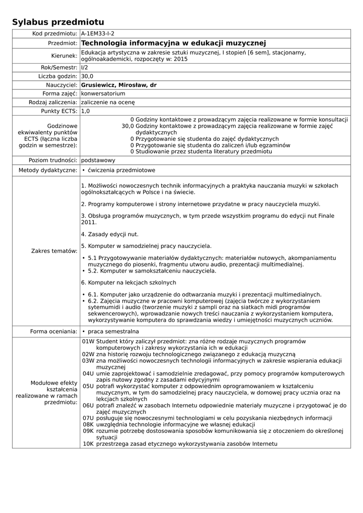 Sylabus przedmiotu Kod przedmiotu: A-1EM33-I-2 Przedmiot: Kierunek: Technologia informacyjna w edukacji muzycznej Edukacja artystyczna w zakresie sztuki muzycznej, I stopień [6 sem], stacjonarny, ogólnoakademicki, rozpoczęty w: 2015 Rok/Semestr: I/2 Liczba godzin: 30,0 Nauczyciel: Grusiewicz, Mirosław, dr Forma zajęć: konwersatorium Rodzaj zaliczenia: zaliczenie na ocenę Punkty ECTS: 1,0 0 Godziny kontaktowe z prowadzącym zajęcia realizowane w formie konsultacji 30,0 Godziny kontaktowe z prowadzącym zajęcia realizowane w formie zajęć dydaktycznych 0 Przygotowanie się studenta do zajęć dydaktycznych 0 Przygotowanie się studenta do zaliczeń i/lub egzaminów 0 Studiowanie przez studenta literatury przedmiotu Godzinowe ekwiwalenty punktów ECTS (łączna liczba godzin w semestrze): Poziom trudności: podstawowy Metody dydaktyczne: • ćwiczenia przedmiotowe 1. Możliwości nowoczesnych technik informacyjnych a praktyka nauczania muzyki w szkołach ogólnokształcących w Polsce i na świecie. 2. Programy komputerowe i strony internetowe przydatne w pracy nauczyciela muzyki. 3. Obsługa programów muzycznych, w tym przede wszystkim programu do edycji nut Finale 2011. 4. Zasady edycji nut. Zakres tematów: 5. Komputer w samodzielnej pracy nauczyciela. • 5.1 Przygotowywanie materiałów dydaktycznych: materiałów nutowych, akompaniamentu muzycznego do piosenki, fragmentu utworu audio, prezentacji multimedialnej. • 5.2. Komputer w samokształceniu nauczyciela. 6. Komputer na lekcjach szkolnych • 6.1. Komputer jako urządzenie do odtwarzania muzyki i prezentacji multimedialnych. • 6.2. Zajęcia muzyczne w pracowni komputerowej (zajęcia twórcze z wykorzystaniem sytemumidi i audio (tworzenie muzyki z sampli oraz na siatkach midi programów sekwencerowych), wprowadzanie nowych treści nauczania z wykorzystaniem komputera, wykorzystywanie komputera do sprawdzania wiedzy i umiejętności muzycznych uczniów. Forma oceniania: • praca semestralna Modułowe efekty kształcenia realizowane w ramach przedmiotu: 01W Student który zaliczył przedmiot: zna różne rodzaje muzycznych programów komputerowych i zakresy wykorzystania ich w edukacji 02W zna historię rozwoju technologicznego związanego z edukacją muzyczną 03W zna możliwości nowoczesnych technologii informacyjnych w zakresie wspierania edukacji muzycznej 04U umie zaprojektować i samodzielnie zredagować, przy pomocy programów komputerowych zapis nutowy zgodny z zasadami edycyjnymi 05U potrafi wykorzystać komputer z odpowiednim oprogramowaniem w kształceniu muzycznym, w tym do samodzielnej pracy nauczyciela, w domowej pracy ucznia oraz na lekcjach szkolnych 06U potrafi znaleźć w zasobach Internetu odpowiednie materiały muzyczne i przygotować je do zajęć muzycznych 07U posługuje się nowoczesnymi technologiami w celu pozyskania niezbędnych informacji 08K uwzględnia technologie informacyjne we własnej edukacji 09K rozumie potrzebę dostosowania sposobów komunikowania się z otoczeniem do określonej sytuacji 10K przestrzega zasad etycznego wykorzystywania zasobów Internetu 1. Kołodziej P.,Finale. Edytor nutowy nie tylko dla profesjonalistów , wydawnictwo Helion, 2004. 2. Grusiewicz M.,Komputerowe wspomaganie edukacji muzycznej w gimnazjum [w:]Bliżej muzyki. Gimnazjum. Poradnik,WSiP, Warszawa 2009. 3. Grusiewicz M.,Programy komputerowe w edukacji muzycznej,[w:] „Wychowanie Muzyczne w Literatura: Szkole” 2005 nr 1. 4. Siemieniecki B., Lewowicki T. (red.),Media w edukacji – szanse i zagrożenia, Wydawnictwo Adam Marszałek, 2008. 5. Wilkoszewska K., (red.)Piękno w sieci. Estetyka a nowe media,Kraków 1999. Zajęcia odbywają się w grupach, w pracowni komputerowej. Praca w dużej mierze odbywa się indywidualnie. Na zaliczenie studenci w programie Finale 2011 przygotowują do druku wybraną Dodatkowe informacje: piosenkę lub inny utwór wokalno-instrumentalny oraz przygotowują opis z uzasadnieniem wykorzystania w edukacji szkolnej kilku wybranych stron internetowych związanych z muzyką i kulturą muzyczną.