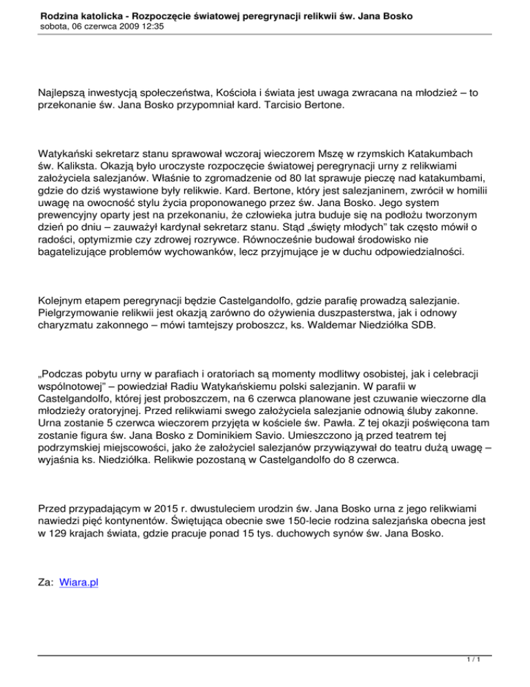 Rodzina katolicka - Rozpoczęcie światowej peregrynacji relikwii św. Jana Bosko sobota, 06 czerwca 2009 12:35 Najlepszą inwestycją społeczeństwa, Kościoła i świata jest uwaga zwracana na młodzież – to przekonanie św. Jana Bosko przypomniał kard. Tarcisio Bertone. Watykański sekretarz stanu sprawował wczoraj wieczorem Mszę w rzymskich Katakumbach św. Kaliksta. Okazją było uroczyste rozpoczęcie światowej peregrynacji urny z relikwiami założyciela salezjanów. Właśnie to zgromadzenie od 80 lat sprawuje pieczę nad katakumbami, gdzie do dziś wystawione były relikwie. Kard. Bertone, który jest salezjaninem, zwrócił w homilii uwagę na owocność stylu życia proponowanego przez św. Jana Bosko. Jego system prewencyjny oparty jest na przekonaniu, że człowieka jutra buduje się na podłożu tworzonym dzień po dniu – zauważył kardynał sekretarz stanu. Stąd „święty młodych” tak często mówił o radości, optymizmie czy zdrowej rozrywce. Równocześnie budował środowisko nie bagatelizujące problemów wychowanków, lecz przyjmujące je w duchu odpowiedzialności. Kolejnym etapem peregrynacji będzie Castelgandolfo, gdzie parafię prowadzą salezjanie. Pielgrzymowanie relikwii jest okazją zarówno do ożywienia duszpasterstwa, jak i odnowy charyzmatu zakonnego – mówi tamtejszy proboszcz, ks. Waldemar Niedziółka SDB. „Podczas pobytu urny w parafiach i oratoriach są momenty modlitwy osobistej, jak i celebracji wspólnotowej” – powiedział Radiu Watykańskiemu polski salezjanin. W parafii w Castelgandolfo, której jest proboszczem, na 6 czerwca planowane jest czuwanie wieczorne dla młodzieży oratoryjnej. Przed relikwiami swego założyciela salezjanie odnowią śluby zakonne. Urna zostanie 5 czerwca wieczorem przyjęta w kościele św. Pawła. Z tej okazji poświęcona tam zostanie figura św. Jana Bosko z Dominikiem Savio. Umieszczono ją przed teatrem tej podrzymskiej miejscowości, jako że założyciel salezjanów przywiązywał do teatru dużą uwagę – wyjaśnia ks. Niedziółka. Relikwie pozostaną w Castelgandolfo do 8 czerwca. Przed przypadającym w 2015 r. dwustuleciem urodzin św. Jana Bosko urna z jego relikwiami nawiedzi pięć kontynentów. Świętująca obecnie swe 150-lecie rodzina salezjańska obecna jest w 129 krajach świata, gdzie pracuje ponad 15 tys. duchowych synów św. Jana Bosko. Za: Wiara.pl 1/1