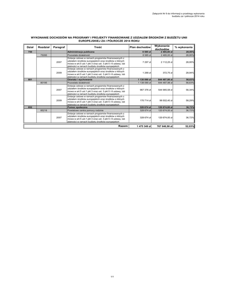 Załącznik Nr 9 do informacji o przebiegu wykonania budżetu za I półrocze 2014 roku WYKONANIE DOCHODÓW NA PROGRAMY I PROJEKTY FINANSOWANE Z UDZIAŁEM ŚRODKÓW Z BUDŻETU UNII EUROPEJSKIEJ ZA I PÓŁROCZE 2014 ROKU Dział Rozdział Paragraf 750 75095 2007 2009 801 80195 2007 2009 852 85218 2007 Treść Plan dochodów Administracja publiczna Pozostała działalność Dotacje celowe w ramach programów finansowanych z udziałem środków europejskich oraz środków o których mowa w art.5 ust.1 pkt 3 oraz ust. 3 pkt 5 i 6 ustawy, lub płatności w ramach budżetu środków europejskich Dotacje celowe w ramach programów finansowanych z udziałem środków europejskich oraz środków o których mowa w art.5 ust.1 pkt 3 oraz ust. 3 pkt 5 i 6 ustawy, lub płatności w ramach budżetu środków europejskich Oświata i wychowanie Pozostała działalność Dotacje celowe w ramach programów finansowanych z udziałem środków europejskich oraz środków o których mowa w art.5 ust.1 pkt 3 oraz ust. 3 pkt 5 i 6 ustawy, lub płatności w ramach budżetu środków europejskich Dotacje celowe w ramach programów finansowanych z udziałem środków europejskich oraz środków o których mowa w art.5 ust.1 pkt 3 oraz ust. 3 pkt 5 i 6 ustawy, lub płatności w ramach budżetu środków europejskich Pomoc społeczna Powiatowe centra pomocy rodzinie Dotacje celowe w ramach programów finansowanych z udziałem środków europejskich oraz środków o których mowa w art.5 ust.1 pkt 3 oraz ust. 3 pkt 5 i 6 ustawy, lub płatności w ramach budżetu środków europejskich Razem: 1/1 Wykonanie dochodów % wykonania 8 585 zł 8 585 zł 2 485,00 zł 2 485,00 zł 28,95% 28,95% 7 297 zł 2 112,25 zł 28,95% 1 288 zł 372,75 zł 28,94% 1 138 090 zł 1 138 090 zł 644 487,98 zł 644 487,98 zł 56,63% 56,63% 967 376 zł 544 985,58 zł 56,34% 170 714 zł 99 502,40 zł 58,29% 328 674 zł 328 674 zł 120 674,00 zł 120 674,00 zł 36,72% 36,72% 328 674 zł 120 674,00 zł 36,72% 1 475 349 zł 767 646,98 zł 52,03%