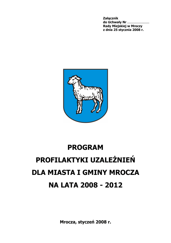 Załącznik do Uchwały Nr ....................... Rady Miejskiej w Mroczy z dnia 25 stycznia 2008 r. PROGRAM PROFILAKTYKI UZALEŻNIEŃ DLA MIASTA I GMINY MROCZA NA LATA 2008 - 2012 Mrocza, styczeń 2008 r. SPIS TREŚCI Wstęp. ………………………………………………………………………………………………………………………… 1 Rozdział 1: Zadania programu. ………………………………………………………………………………….. 2 Rozdział 2: Szerokopojęty aspekt problemu uzależnień. ………………………………………….. 3 2.1. Czym jest uzależnienie od środków odurzających? ………………………………… 3 2.2. Od inicjacji do uzależnienia. ……………………………………………………………………. 5 2.3. Alkohol w świecie Zachodu. ……………………………………………………………………. 8 2.4. Alkoholizm w Polsce. ………………………………………………………………………………. 13 2.5. Krótka historia narkomanii na świecie. …………………………………………………… 14 2.6. Zarys historyczny narkomanii w Polsce i polska charakterystyka problemu. ………………………………………………………………………. 15 2.6. Lata 90-te i początek XX w. - czyli cela dobra na wszystko. ………………….. 17 Rozdział 3: Podstawowe pojęcia związane z uzależnieniami. ………………………………….. 19 Rozdział 4: Środki psychoaktywne i ich klasyfikacja. ……………………………………………….. 22 Rozdział 5: Przyczyny uzależnień. …………………………………………………………………………….. 27 5.1. Determinanty powstawania uzależnień. ………………………………………………… 27 5.2. Szkoła a powstawanie nałogu narkomanii. ……………………………………………. 30 5.3. Dlaczego młodzież sięga po środki odurzające? ……………………………………. 32 5.4. Alkoholizm - krótka charakterystyka. …………………………………………………….. 35 5.5. Lekomania - krótka charakterystyka. …………………………………………………….. 36 5.6. Narkomania - krótka charakterystyka. …………………………………………………… 37 Rozdział 6: Biologiczne i społeczne skutki nałogów. ………………………………………………… 38 Rozdział 7: Profilaktyka i leczenie uzależnień. ……………………………………....................... 41 Rozdział 8: Ogólna ocena stanu zagrożenia. …………………………………………………………….. 47 Rozdział 9: Wieloletnie cele ogólne i szczegółowe oraz kierunki działań. ……………….. 53 Rozdział 10: Katalog używek. …………………………………………………………………………………… 62 Rozdział 11: Podsumowanie. …………………………………………………………………………………….. 65 Bibliografia. ………………………………………………………………………………………………………………… 68 Załącznik Nr 1: Program Profilaktyki i Rozwiązywania Problemów Alkoholowych dla Miasta i Gminy Mrocza na rok 2008. ……………………………………………….. 69 Załącznik Nr 2: Program Przeciwdziałania Narkomanii dla Miasta i Gminy Mrocza na rok 2008. ………………………………………………………………………………. 90 WSTĘP Podstawa prawna: 1) Ustawa z dnia 26 października 1982 r. o wychowaniu w trzeźwości i przeciwdziałaniu alkoholizmowi (Dz. U. z 2007 r. Nr 70 poz. 473) 2) Ustawa z dnia 29 lipca 2005 r. o przeciwdziałaniu narkomanii (Dz. U. z 2005 r. Nr 179 poz. 1485) 3) Rozporządzenie Rady Ministrów z dnia 10 sierpnia 2006 r. w sprawie Krajowego Programu Przeciwdziałania Narkomanii ma lata 2006 - 2010 (Dz. U. z 2006 r. Nr 143 poz. 1033) Uzależnienie, czyli toksykomania to nabyta silna potrzeba wykonywania jakiejś czynności lub zażywania jakiejś substancji (syntetycznych lub naturalnych, mających szkodliwy wpływ na organizm i psychikę jednostki). W praktyce zaś określenie to używane jest w kilku znaczeniach. Wyróżniamy m.in.: 1) Uzależnienie fizjologiczne (fizyczne) to nabyta silna potrzeba stałego zażywania jakiejś substancji odczuwana jako szereg dolegliwości fizycznych (np. bóle, biegunki, uczucie zimna, wymioty, drżenia mięśni, bezsenność). Zaprzestanie jej zażywania (odstawienie) prowadzi do wystąpienia zespołu objawów, które określa się jako zespół abstynencyjny. W leczeniu uzależnienia fizjologicznego stosowana jest detoksykacja, czyli odtrucie. Zaliczamy np.: nikotynizm, alkoholizm, narkomanie, lekomanie itp. 2) Uzależnienie psychiczne (psychologiczne) to nabyta silna potrzeba stałego wykonywania jakiejś czynności lub zażywania jakiejś substancji, czynione jest to w celu uzyskania efektu natury emocjonalnej – dla przyjemności (powtórzenie poprzednio doznanych pod jego wpływem pożądanych przeżyć) lub uzyskania odprężenia, ulżenia w cierpieniu, złagodzenia złego samopoczucia, której niespełnienie jednak nie prowadzi do poważnych fizjologicznych następstw. Zaliczamy np.: hazard i gry komputerowe, telewizja, Internet, jedzenie, słodycze, kupowanie, praca, nadmierna dbałość o tężyznę fizyczną. 3) Uzależnienie społeczne (socjologiczne) wiąże się z zażywaniem środków toksycznych pod wpływem panującej mody lub w grupie ludzi podobnych do siebie, w kręgach młodzieży z tzw. subkultur. Istotą zjawiska jest bardzo silne uzależnienie od grupy, co pociąga za sobą bezwzględne respektowanie panujących w niej zasad i obyczajów. Ponadto osoba uzależniona, w miarę pogłębiania się choroby rezygnuje z ważnych dla siebie wcześniej 