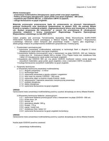 Załącznik nr 7a do SIWZ Oferta inwestycyjna: - prezentacja multimedialna (dwujęzyczna: język polski oraz język angielski), - foldery promocyjne (dwujęzyczne: język polski oraz język angielski) - 500 sztuk, - wypalanie płyt CD/DVD 500 szt., z nadrukiem CMYK na płytach, - usługa tłumaczenia na język angielski. Materiały promocyjne przeznaczone będą do umieszczenia na stronach internetowych, podczas konferencji oraz dystrybucji bezpośredniej na płytach DVD, dla potrzeb Miasta Kraśnik w związku z realizacją projektu „Zagospodarowanie terenu pod inwestycje w Kraśniku, obr. Budzyń propozycją dla inwestorów" w ramach Osi priorytetowej III „Atrakcyjność obszarów miejskich i tereny inwestycyjne” Regionalnego Programu Operacyjnego Województwa Lubelskiego na lata 2007-2013. Celem projektu jest promocja Tarnobrzeskiej Specjalnej Strefy Ekonomicznej EURO-PARK WISŁOSAN Podstrefa Kraśnik powstającej w Mieście Kraśnik, Miasta Kraśnik i Województwa Lubelskiego. Głównym celem kampanii jest prezentacja miasta i regionu jako dogodnego i atrakcyjnego miejsca do podejmowania działalności gospodarczej i inwestycyjnej. 1. Przedmiotem zamówienia jest: 1.1wykonanie prezentacji multimedialnej wykonanej w technologii flash o długości 5 minut (dwujęzyczna: język polski oraz język angielski). 1.2wykonanie folderów promocyjnych wraz z kieszeniami na płytę CD/DVD– 500 szt. folderów. Liczba stron 24. Gramatura okładki 300 g, środek 170 g. Papier kreda mat, dodatkowo folia i lakier UV (dwujęzyczne: język polski oraz język angielski). 1.3wypalanie płyt CD/DVD 500 szt. (na płycie CD/DVD możliwość wyboru wersji językowej wszystkich materiałów: język polski, język angielski), wraz z nadrukiem CMYK na płytach, 1.4usługa tłumaczenia wszystkich materiałów na język angielski. 2. Parametry techniczne: 2.1Parametry techniczne prezentacji multimedialnej: 2.1.1 długość prezentacji – 5 minut 2.1.2 technologia flash 2.1.3 wykonanie prezentacji w języku polskim i angielskim 2.1.4 ilość kopii na nośniku CD/DVD – 500 sztuk 2.1.5 wykonanie zdjęć na terenie miasta Kraśnik i okolic 2.1.6 opracowanie i napisanie zawartości merytorycznej prezentacji 2.1.7 podkład dźwiękowy 2.1.8 efekty dźwiękowe 2.1.9 wykonanie tłumaczenia na język angielski UWAGI: Opracowane treści prezentacji multimedialnej powinny uzyskać akceptację ze strony Miasta Kraśnik. 2.2Parametry techniczne folderów promocyjnych: 2.2.1 wykonanie folderów promocyjnych wraz z kieszeniami na płytę CD/DVD– 500 szt. 2.2.2 liczba stron :24 2.2.3 format: A4 2.2.4 gramatura okładki: 300 g, 2.2.5 środek: 170 g. 2.2.6 papier: kreda mat, 2.2.7 dodatkowo folia i lakier UV 2.2.8 wykonanie tłumaczenia na język angielski komentarzy UWAGI: Opracowane treści prezentacji multimedialnej powinny uzyskać akceptację ze strony Miasta Kraśnik. Każda płyta CD/DVD powinna zawierać: prezentację multimedialną. Załącznik nr 7a do SIWZ Każda płyta CD/DVD musi mieć możliwość wyboru wersji językowej (język polski, język angielski), powinna mieć auto startujące menu. Projekt nadruku na płytę, okładki płyty powinien być zaakceptowany przez Miasto Kraśnik. Wszystkie materiały będą zawierały logotypy zgodnie z wytycznymi Regionalnego Programu Operacyjnego Województwa Lubelskiego. 1. Ogólne ramy merytoryczne materiału promocyjnego będą obejmować: 1.1opis Województwa Lubelskiego; 1.2opis Miasta Kraśnik; 1.3opis terenów inwestycyjnych miasta; 1.4opis środowiska gospodarczego miasta; 1.5opis Infrastruktury około biznesowej miasta; 1.6opis walorów turystycznych, rekreacyjnych i kulturalnych miasta. 2. Część materiałów do publikacji zostanie udostępnione przez Zamawiającego. 3. W koszty materiałów promocyjnych należy wliczyć również przekazanie pełni autorskich praw majątkowych nieograniczonych czasowo ani terytorialnie. 4. Wykonawca zapewni podkład muzyczny (możliwość wyboru z co najmniej 3 propozycji). Wykonawca dostarczy Zamawiającemu oświadczenie o nabyciu praw do użycia wybranego przez Zamawiającemu fragmentu muzycznego do produkcji Materiału promocyjnego będącego przedmiotem niniejszego zamówienia. 5. Zamawiający zapewni udział lektora (w języku polskim), który wejdzie w rolę komentatora treści nagrania. III. Założenia dotyczące terminu realizacji 1. Scenariusze Materiału promocyjnego (prezentacja multimedialna, foldery promocyjne) zostaną uzgodnione z Zamawiającym i zaakceptowane przez obie strony w terminie 21 dni roboczych oddania zawarcia umowy. 2. Zamawiający ma prawo do zgłoszenia poprawek w terminie 4 dni roboczych od przedstawienia w/w scenariuszy a Wykonawca zobowiązuje się nanieść poprawki. 3. W terminie 14 dni kalendarzowych od akceptacji scenariusza Wykonawca zorganizuje kolaudację, podczas której przedstawi Zamawiającemu do akceptacji zmontowany Materiał promocyjny. 4. W terminie 4 dni roboczych od przedstawienia zmontowanego Materiału promocyjnego Zamawiającemu przysługuje prawo do poprawek a Wykonawca zobowiązuje się nanieść poprawki. 5. Poprawki Zamawiający zgłasza w formie pisemnej, faksem lub drogą elektroniczną do upoważnionej przez Wykonawcę osoby. 6. Zaakceptowany przez Zamawiającego Materiał promocyjny Wykonawca przekaże w terminie 7dni od akceptacji utrwalony na płycie DVD-Video (5 sztuk) oraz w postaci plików komputerowych do umieszczenia na stronach internetowych. Nośniki dostarczone Zamawiającemu muszą być oznaczone zgodnie z dokumentem wytyczne dotyczące oznaczenia projektów w ramach RPO WL na lata 2007-2013 oraz adresem strony internetowej gminy. IV. Ponadto Wykonawca: 1. W cenie usługi zapewni przekazanie praw autorskich i pokrewnych do Materiału promocyjnego na wszystkie pola eksploatacji, w szczególności: 1.1 utrwalania i zwielokrotniania jakąkolwiek techniką ( w tym drukiem, na kliszy fotograficznej, na taśmie magnetycznej, cyfrowo) w jakimkolwiek sys