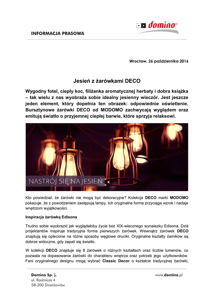 Wrocław, 26 października 2016 Jesień z żarówkami DECO Wygodny fotel, ciepły koc, filiżanka aromatycznej herbaty i dobra książka – tak wielu z nas wyobraża sobie idealny jesienny wieczór. Jest jeszcze jeden element, który dopełnia ten obrazek: odpowiednie oświetlenie. Bursztynowe żarówki DECO od MODOMO zachwycają wyglądem oraz emitują światło o przyjemnej ciepłej barwie, które sprzyja relaksowi. Kto powiedział, że żarówki nie mogą być dekoracyjne? Kolekcja DECO marki MODOMO pokazuje, że z powodzeniem zastępują lampy. Ich oryginalna forma przyciąga wzrok i nadaje wnętrzom wyjątkowości. Inspiracja żarówką Edisona Trudno sobie wyobrazić jak wyglądałoby życie bez XIX-wiecznego wynalazku Edisona. Dziś projektantów inspiruje tradycyjna forma pierwszych żarówek. Wewnątrz żarówek DECO znajdują się oplecione na różne sposoby węglowe druciki. Oryginalne kształty żarników są dobrze widoczne, gdy zapali się światło. W kolekcji DECO znajduje się 8 żarówek o różnych kształtach oraz liczbie lumenów, co pozwala na dopasowanie żarówki do charakteru wnętrza oraz potrzeb jego użytkowników. Fani oryginalnego designu mogą wybrać Classic Decor o kształcie tradycyjnej żarówki, okrągłą Illu Decor, długie Line Decor oraz Volt Decor, a także Cristal Decor, Amber Decor, Axo Decor i Arte Decor. Żarówki są przeznaczone do stosowania w popularnych gniazdach E27, a ich żywotność wynosi 2 lata (3000 h). W zależności od modelu oferują moc 220-240 V oraz 62-315 lumenów. W sam raz na jesień Przyciągają uwagę piękną bursztynową barwą, oryginalnymi formami kolb oraz żarników. MODOMO zadbało również o to, by żarówki DECO emitowały przyjemne ciepłobiałe światło o temperaturze barwowej wynoszącej 1800-2200 K. Zastosowane rozwiązanie sprzyja relaksowi i dobremu samopoczuciu w zaciszu domowym, sprawiając wrażenie przytulności, a równocześnie dobrze doświetlając wnętrza. Kolekcja stworzona przez markę firmy DOMINO to nie lada gratka dla sympatyków dobrego designu, stylu vintage oraz osób, dla których dom jest przytulnym miejscem, w jakim błogo spędzają czas. Żarówki DECO pozwalają podkreślić wystrój pomieszczeń oraz tworzą niczym niezmąconą, spokojną atmosferę. Znakomicie wyglądają solo i w zestawieniu ze szklanym lub metalowym kloszem. O firmie DOMINO: DOMINO to producent oraz ogólnopolski dystrybutor wysokiej jakości produktów wyposażenia wnętrz oraz kreator rozwiązań projektowych dla małych i dużych przestrzeni. Historia marki rozpoczęła się ponad 30 lat temu od projektowania i produkcji okuć drzwiowych oraz klamek, aby pod koniec ubiegłego wieku firma rozwinęła działalność, wprowadzając do swojej oferty coraz to nowe kategorie produktów dla domu. www.domino.pl O marce MODOMO: MODOMO jest marką DOMINO oferującą oświetlenie dla wymagających użytkowników. Żarówki LED oraz ozdobne cechują bardzo dobre parametry techniczne oraz atrakcyjna forma. DECO to kolekcja produktów vintage w stylu pierwszych żarówek Edisona, które wyróżnia oryginalny wygląd oraz ciepłe, przyjemne światło, jakie emitują. www.modomo.pl Dodatkowych informacji z przyjemnością udzieli Państwu: Edyta Zakrzewska Domino Sp. j. [email protected] +48 74 832 48 00 +48 885 557 355