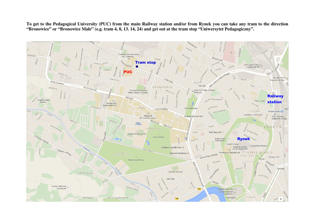 To get to the Pedagogical University (PUC) from the main Railway station and/or from Rynek you can take any tram to the direction “Bronowice” or “Bronowice Małe” (e.g. tram 4, 8, 13. 14, 24) and get out at the tram stop “Uniwersytet Pedagogiczny”. Tram stop PUC Railway station Rynek One can also walk from Rynek to PUC, via Kamelicka and Krolewska str. The distance is ~2.5km The hotels close to the Pedagogical University (PUC) - the colloquium venue: Tram stop PUC Ibis Budget Krakow Bronovice Novotel Krakow City West ACH Hostel Piast Hostel Bydgoska Hotel Polonez Hostel Nawojka The colloquium venue: lecture hall 110N and 102N, in the new building of PUC, the main entrance at Chmiela street Tram stop PUC - main building PUC - new building from hotel Novotel and Ibis, hostel ACH and Piast from hotel Polonez, hostel Bydgoska and Nawojka