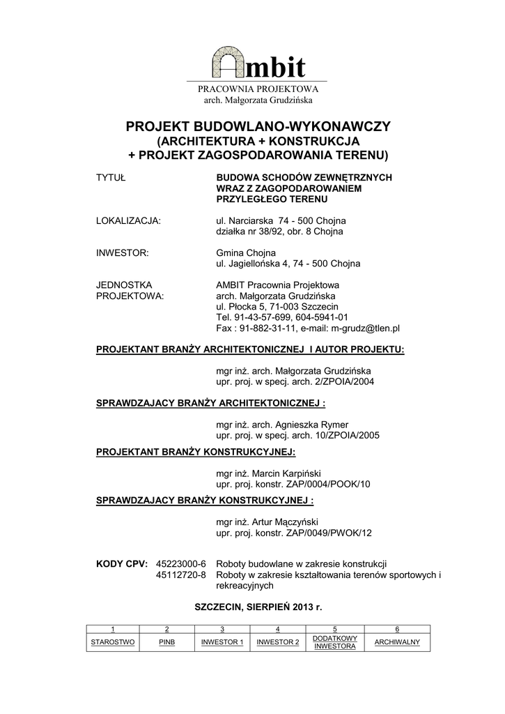 mbit PRACOWNIA PROJEKTOWA arch. Małgorzata Grudzińska PROJEKT BUDOWLANO-WYKONAWCZY (ARCHITEKTURA + KONSTRUKCJA + PROJEKT ZAGOSPODAROWANIA TERENU) TYTUŁ BUDOWA SCHODÓW ZEWNĘTRZNYCH WRAZ Z ZAGOPODAROWANIEM PRZYLEGŁEGO TERENU LOKALIZACJA: ul. Narciarska 74 - 500 Chojna działka nr 38/92, obr. 8 Chojna INWESTOR: Gmina Chojna ul. Jagiellońska 4, 74 - 500 Chojna JEDNOSTKA PROJEKTOWA: AMBIT Pracownia Projektowa arch. Małgorzata Grudzińska ul. Płocka 5, 71-003 Szczecin Tel. 91-43-57-699, 604-5941-01 Fax : 91-882-31-11, e-mail: [email protected] PROJEKTANT BRANŻY ARCHITEKTONICZNEJ I AUTOR PROJEKTU: mgr inż. arch. Małgorzata Grudzińska upr. proj. w specj. arch. 2/ZPOIA/2004 SPRAWDZAJACY BRANŻY ARCHITEKTONICZNEJ : mgr inż. arch. Agnieszka Rymer upr. proj. w specj. arch. 10/ZPOIA/2005 PROJEKTANT BRANŻY KONSTRUKCYJNEJ: mgr inż. Marcin Karpiński upr. proj. konstr. ZAP/0004/POOK/10 SPRAWDZAJACY BRANŻY KONSTRUKCYJNEJ : mgr inż. Artur Mączyński upr. proj. konstr. ZAP/0049/PWOK/12 KODY CPV: 45223000-6 45112720-8 Roboty budowlane w zakresie konstrukcji Roboty w zakresie kształtowania terenów sportowych i rekreacyjnych SZCZECIN, SIERPIEŃ 2013 r. 1 2 3 4 STAROSTWO PINB INWESTOR 1 INWESTOR 2 5 DODATKOWY INWESTORA 6 ARCHIWALNY ZAWARTOŚĆ OPRACOWANIA A. OPIS TECHNICZNY ZAWARTOŚĆ OPRACOWANIA ................................................................................................. 2 1. PRZEDMIOT PROJEKTU ................................................................................................... 4 2. PODSTAWA OPRACOWANIA ........................................................................................... 4 3. LOKALIZACJA INWESTYCJI. ............................................................................................. 5 4. WARUNKI GRUNTOWO-WODNE...................................................................................... 5 5. PROJEKT ZAGOSPODAROWANIA TERENU ................................................................... 6 6. ROZWIĄZANIA PROJEKTOWE ......................................................................................... 7 7. WARUNKI OCHRONY PRZECIWPOŻAROWEJ ............................................................. 15 8. CHARAKTERYSTYKA EKOLOGICZNA OBIEKTU .......................................................... 15 9. OCHRONA INTERESÓW OSÓB TRZECICH. ................................................................. 16 10. UWAGI KOŃCOWE. ......................................................................................................... 16 B. ZAŁĄCZNIKI 1. Oświadczenie projektanta i sprawdzającego branży architektonicznej i konstrukcyjnej o wykonaniu projektu zgodnie z obowiązującymi przepisami i zasadami wiedzy technicznej. 2. Kopia uprawnień projektanta branży architektonicznej 3. Zaświadczenie o przynależności projektanta branży architektonicznej do właściwej izby samorządu zawodowego 4. Kopia uprawnień sprawdzającego branży architektonicznej 5. Zaświadczenie o przynależności sprawdzającego branży architektonicznej do właściwej izby samorządu zawodowego 6. Kopia uprawnień projektanta branży konstrukcyjnej 7. Zaświadczenie o przynależności projektanta branży konstrukcyjnej do właściwej izby samorządu zawodowego 8. Kopia uprawnień sprawdzającego branży konstrukcyjnej 9. Zaświadczenie o przynależności sprawdzającego branży konstrukcyjnej do właściwej izby samorządu zawodowego 10. Decyzja wójta Gminy Banie o lokalizacji inwestycji celu publicznego nr GK.6733.2.2013 z dnia .24,07.2013 r. 11. Decyzja Burmistrza Gminy Chojna o środowiskowych uwarunkowaniach nr BPI.6220.1.2013 z dnia 01.07.2013 r. 12. Karta rejestracyjna wtórnika mapy zasadniczej. 13. Karta katalogowa oprawy solarnej. mbit PRACOWNIA PROJEKTOWA arch. Małgorzata Grudzińska 71-003 Szczecin, ul. Płocka 5, tel.: 91/435 76 99, 604-594-101, fax 91/882 13 11, e-mail: [email protected] 2 C. RYSUNKI NR RYS. Z-1 A+K-1 A+K-2 A+K-3 A+K-4 A+K-5 A+K-6 A+K-7 A+K-8 A+K-9 A+K-10 A-11 A-12 A-13 A-14 A-15 A-16 A-17 A-18 A-19 A-20 A-21 A-22 A-23 RYSUNEK PLAN SYTUACYJNY SCHODY ZEWNĘTRZNE NR 1, RZUT, PRZEKRÓJ A1-A1, PRZEKRÓJ B1-B1 SCHODY ZEWNĘTRZNE NR 1- SCHEMATY SCHODY ZEWNĘTRZNE NR 1- PRZEKRÓJ A1’-A1’ SCHODY ZEWNĘTRZNE NR 2, RZUT, PRZEKRÓJ A2-A2, PRZEKRÓJ B2-B2 SCHODY ZEWNĘTRZNE NR 2- SCHEMATY SCHODY ZEWNĘTRZNE NR 2- PRZEKRÓJ A2’-A2’ SCHODY ZEWNĘTRZNE NR 3, RZUT, PRZEKRÓJ A3-A3, PRZEKRÓJ B3-B3 SCHODY ZEWNĘTRZNE NR 3- SCHEMATY SCHODY ZEWNĘTRZNE NR 3- PRZEKRÓJ A3’-A3’ SCHODY ZEWNĘTRZNE NR 4, RZUT, PRZEKRÓJ A4-A4, DETAL NR 1 – DETAL MOCOWANIA BALUSTRADY DETAL NR 2 – DETAL MOCOWANIA WSPORNIKÓW STALOWYCH DO PŁYTY ŻELBETOWEJ DETAL NR 3 – DETAL MOCOWANIA BALUSTRADY DO PŁYTY ŻELBETOWEJ DETAL NR 4 – DETAL SPOCZNIKA DETAL NR 5 - DETAL MOCOWANA BALUSTRADY NA SPOCZNIKU DETAL NR 6 - KONSTRUKCJA PIERWSZEGO STOPNIA DETAL NR 7 – KONSTRUKCJA OSTATNIEGO STOPNIA- SCHODY NR 1 DETAL NR 7a – KONSTRUKCJA OSTATNIEGO STOPNIA-SCHODY NR 2 DETAL NR 8 – DETAL BALUSTARDY DETAL NR 8a – DETAL BALUSTARDY DETAL NR 8b – DETAL BALUSTARDY NA SPOCZNIKU DETAL NR 9 – KRAWĘŻNIK POMIĘDZY CHODNIKIEM A TERENEM ZIELONYM DETAL NR 10 – DETAL ŚCIEŻKI Z TŁUCZNIA mbit PRACOWNIA PROJEKTOWA arch. Małgorzata Grudzińska 71-003 Szczecin, ul. Płocka 5, tel.: 91/435 76 99, 604-594-101, fax 91/882 13 11, e-mail: [email protected] SKALA 1:500 1:50 1:50 1:50 1:50 1:50 1:50 1:50 1:50 1:50 1:15 1:5 1:5 1:5 1:5 1:5 1:5 1:5 1:5 1:10 1:10 1:10 1:10 1:10 3 1. PRZEDMIOT PROJEKTU Budowa schodów zewnętrznych wraz z zagospodarowaniem przyległego terenu, będące przedmiotem niniejszego opracowania, stanowią część (II Etap) zadania inwestycyjnego pt. „Budowa chodnika wraz ze schodami w wąwozie między budynkami mieszkalnymi na byłym lotnisku w Chojnie wraz z zagospodarowaniem terenu i infrastrukturą techniczną”, dla którego Wójt gminy Banie w dniu 24,07.2013 r. wydał decyzję o ustaleniu lokalizacji inwest