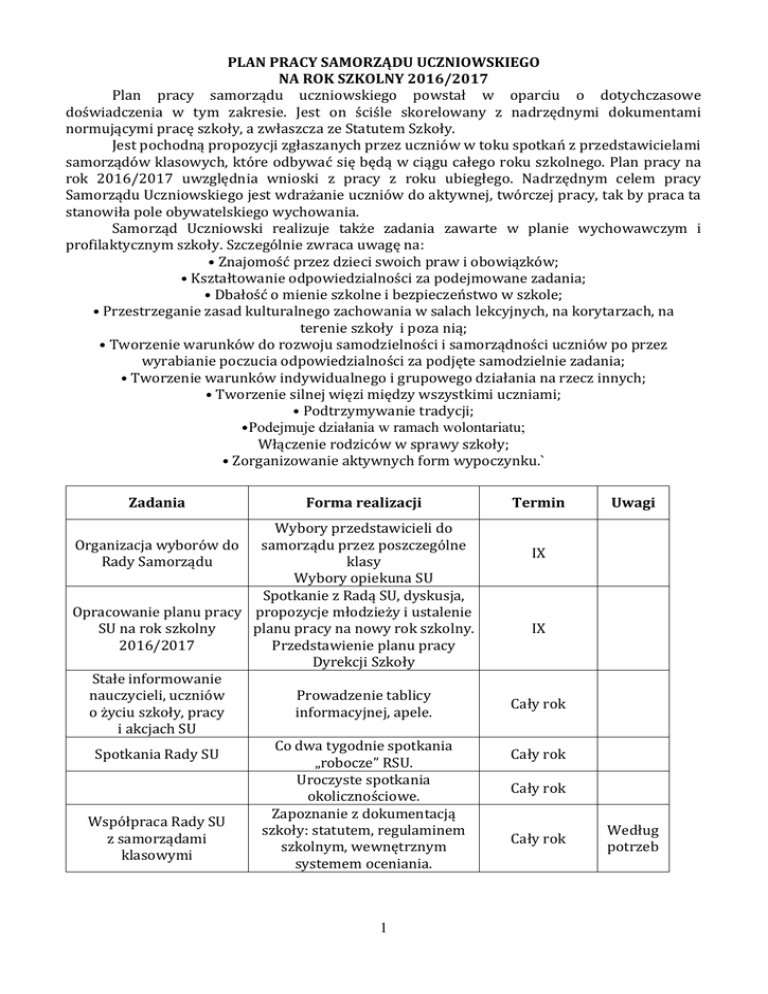 1 PLAN PRACY SAMORZĄDU UCZNIOWSKIEGO NA ROK