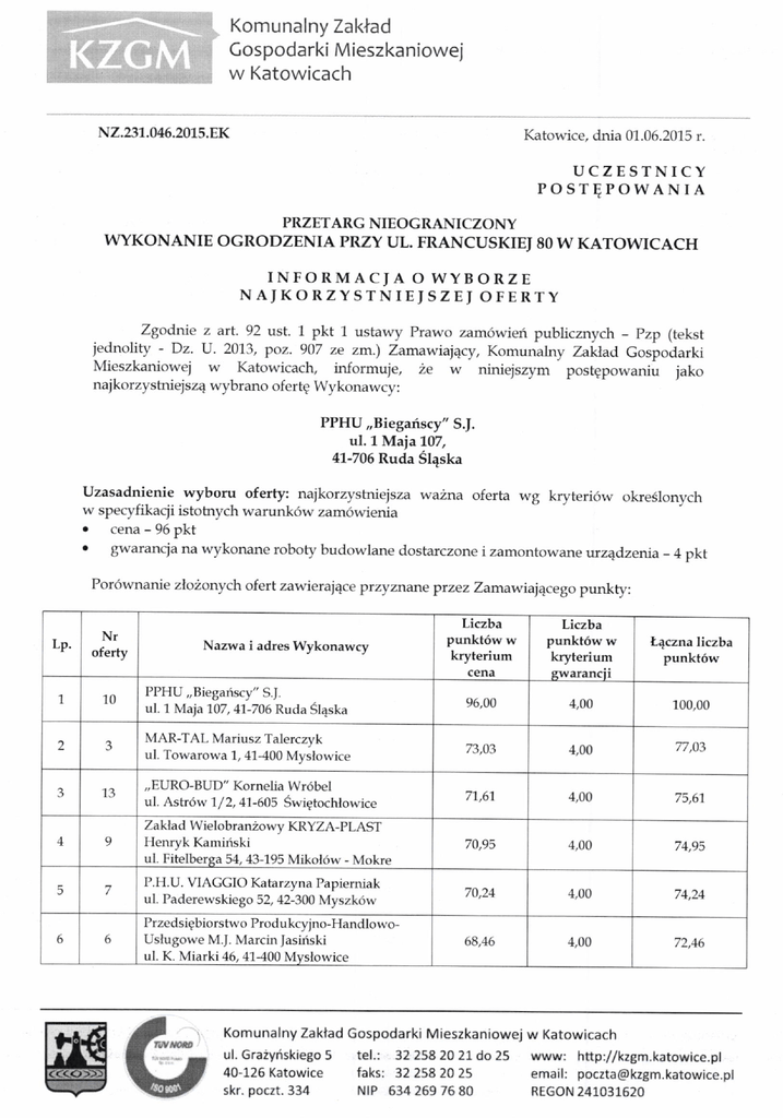 Komunalnv Zaklad Gospodarki Mieszkaniowej w Katowicach N2.231.045.2015.EK Katowice, dnia 01.06.2015 r. UCZESTNICY POST4POWANIA PRZETARG NIEOGRANICZONY WYKONANIE OGRODZENIA pRZy UL. FRANCUSKIEJ 80 W KATOWTCACH TNFORMACJA O WYBORZE NAJKORZYSTNIEISZEI OFERTY Zgoclnie z art. 92 ust. 1 pkt 1 ustawy prawo zam6wiei publicznvch - pzp (tekst jednolity - Dz. U. 2013, poz. 907 ze zm.) Zamawiaj4cy, Komunalny Zaklad Gospodarki Mieszkaniowej w Katowicach, informuje, 2e w niniejszym postgpowaniu jako najkorzystniejsz4 wybrano ofertg Wykonawcy: PPHU ,,Biegafiscy" S.J. ul. 1 Maia 107, 41-706 Ruda Sl4ska Uzasadnienie wyboru oferty: najkorzystniejsza wa2na oferta wg kryteri6w okre6lonych w specvfikacii istobrvch warunk6w zam6wienia o cena - 96 pkt o gwaranqa na wvkonane roboty budowlane dostarczone i zamontowane urzqdzenia - 4 pkt Por6wnanie zlo2onych ofert zawierajqce przyznane przez ZamawiajEcego punkty: Lp. "l 2 Liczba cena Liczba punkt6w w kryterium gwarancii 96,00 4,00 100,00 MAR-TAL Mariusz Talerczyk ul. Towarowa 1, 41-i100 Myslowice 73,03 +,00 77,03 ,,EURO-BUD" Kornelia Wr6bel ul. Astr6w 1/2, 41-605 Swietochlowice 7"1,61 4,00 75,67 Nr Nazwa i adres Wvkonawcv oferty 10 3 3 PPHU,,Biegariscy" S.j. ul. 1 Maja 107, ,11-706 Ruda Sl4ska punkt6w w kryterium Lqczna liczba punkt6w 4 9 Zaklad Wielobran2owy KRYZA-PLAST Henryk Kamiriski ul. Fitelberga 5,1, 43-195 Mikol6w - Mokre 70,95 ,1,00 5 7 P.H.U. VIAGGIO Katarzyna Papierniak ul. Paclerewskiego 52, 12-300 Myszk6u 70,21 ,1,00 71,24 6 6 Przedsigbiorstwo Procl ukcyjno-HandlowoUslugowe M.J. Marcirr Jasiiski ul. K. Miarki 46, 41-400 Myslowice 68,46 4,00 72,16 riv t 06 Komunalny Zaklad Gospodarki Mieszkaniowej ul. Graiyriskiego 5 tel.: 32 258 20 21 do 25 40-125 Katowice faks: 32 258 20 25 skr. poczt. 334 NrP 634 269 76 80 w Katowicach www: http://kzgm.katowice.pl email: [email protected] REGON 241031620 Komunalnv Zaktad Gospodarki Mieszkaniowej w Katowicach 7 8 Przedsigbiorstwo Produkcji Handlu i Uslug BEDAMEX Dariusz Karitoch 65,81 4,00 70,8"1 63,64 3,00 67,64 PHR HARE Sp. z o.o., ul. Sobieskiego 11lE6, ,10-082 Katowice 62,89 4,00 66,89 l,ukasz Orszulik Zbytk6w, ul. Brzozowa 9, 43-2,16 Strumiefi 66,05 0,00 66,05 P.P.U. Hebex s.c. Ireneusz i Anna Noculak ul. Jankowskiego 1,41-710 Ruda Sl4ska 53,9 4,00 57,4 55,08 0,00 55,08 ul. Halembska 113,41-706 Ruda SIaska 9 11 P.H.U.,,KUMBUD" Zbigniew Abramowicz ul. Wyzwolenia 8C/9, 41-103 Siemianowice Slaskie 10 I 8 "t2 12 11 5 WIKOS Cezary Osuch Bujny, ul. Piotrkowska 50, 97 47'1. W ola Kr zvsztoporska 13 2 P.P.H.U URBUD ul. Gliwicka 230, 42603 Tamowskie G6ry Zamawiaj4cy informuje, 2e umowa dolycz4ca reallzacji przedmiotowego zam6wienia moze zostac podpisana ni podstawie art. 94 ust. 1 pkt 2 ustawy Pzp w terminie nie kr6tszym nii 5 dni od postePowanie -omet to przeslania zawiadomienia o wyborze najkorzystniejszej oferty, poniewai jest prowadzone w trybie przetargu nieograniczonego, o warto6ci mniejszej ni2 kwoty okre6lone w przepisach wydanych na podstawie art. 11 ust. 8 ustawy Pzp. O terminie podpisania umowy wybrany Wykonawca zostanie powiadomiony odrgbnym pismerr. ovnffin *," n,il ''1"*^' Otrzylnuj+ - Wszyscy uczeshicy posepowania -NZ-a/a Komunalny Zaklad Gospodarki Mieszkaniowej w Katowicach ul. craiynskiego 5 tel.: 322582021 do25 www: htp://kzgm.katowice.pl fak: 32 258 20 25 email: [email protected] 40-126 Katowice REGON 241031620 skr. poczt. 334 NrP 534 259 76 80