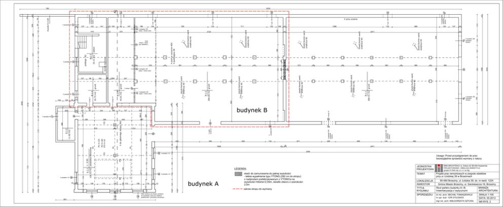 167 41 52 380 38 170 otwór/komin went srednica 40 h parapetu 250 120 podwojne 60 luksfery 579 B 1.1 369.41 m2 grunt 210 bez progu 195 42 304 41 443 161 22 200 20 120 60 h parapetu 250 podwojne luksfery 120 60 h parapetu 250 podwojne luksfery h parapetu 250 podwojne luksfery h nadpr brutto 22 120 60 133 h parapetu155 156 671 656 134 682 200 2471 132 42 976 154 300 otwór istniej¹cy do zmiany wymiarów do wysokoœci 3,0m przy rozbiórce podokiennika i zachowaniu szerokoœci 360 360 Uwaga: Przed przystąpieniem do prac bezwzględnie sprawdzić wymiary z natury. budynek A 42 13 142 42 42 118 385 1579 38 1495 383 360 38 134 380 304 360 133 1839 1195 38 200 h progu 10 195 264 42 42 21 226 380 338 38 200 205 otwór/komin went srednica 40 282 otwór/komin went srednica 40 otwór/komin went srednica 40 373 42 otwór/komin went srednica 40 388 200 45 300 380 638 156 156 487,5 156 h parapetu 250 120 podwojne 60 luksfery 134 578 otwór/komin went srednica 40 42 145 145 278 173 42 4394 P3 154 300 h parapetu 112 137 310 134 42 h parapetu 250 podwojne 120 60 luksfery h par. 155 680 2471 otwór/komin went srednica 40 165 42 154 154 154 300 h parapetu 112 132 otwór/komin went srednica 40 392 1388 LEGENDA: A 1167 42 budynek B 304 90 90 644 P1 P1 155 133 156 133 156 h par. 155 45 45 45 45 219 284 226 200 440 226 512 P2 P1 h=23 P2 h=40 P3 h=14 176 100 287 1057 154 300 154 300 384 P3 154 35 42 42 142 156 45 87 322 h do głównego stropu 562 P2 A 1.1 +- 0.00 263 107 243 94 123 42 42 94 42 126.53 m2 posadzka betonowa P1 758 11.82 m2 A 1.2 469 432 1198 154 h parapetu 112 300 13 71 290 510 722 154 99 244 269,5 87 132 2122 99 197 127 711 otwór/komin went srednica 40 h pom w szczycie 400 h podciagow 26 111 115 45 84 98 198 117 h parapetu 245 145 szyba + drewn rama 156 100 190 97 h parapetu 64 112 87 204 42 92 252 133 118 98 h progu 5 45.91 m2 B 1.3 grunt 41 45 247 100 97 316 517 381 161 2799 h progu 14 B 1.4 16.73 m2 55 h progu 5 104 13 45 43 104 104 43 79 99 90 h parapetu 90 202 376 117 145 h parapetu 245 szyba + drewn rama 22 184 238 42 12 33 grunt 98 komin dymowy 32.11 m2 B 1.5 podloga -82 351 127 408 18 128 122 h parapetu 90 202 101 beton 176 132 537 1246 43 726 12 117 h parapetu 245 145 szyba + drewn rama 2555 109 134 552 373 21 186 117 145 h parapetu 245 szyba + drewn rama 45 12 h przy scianie 553 147 h par. 155 133 156 h par. 155 82 B 1.2 410 42 87 196 21 144 309.69 m2 grunt 141 otwór/komin went srednica 40 132 116 137 h progu 5 h parapetu 250 podwojne 120 60 luksfery 79 87 42 28 116 murek h=120 42 27 239 87 h parapetu -30 60 133 156 5535 A 790 JEDNOSTKA PROJEKTOWA otwór do zamurowania do pełnej wysokości - lekkie wypełnienie typu YTONG (282 cm do stropu) z nadprożem prefabrykowanym z YTONG'a na wysokości Hdolne=2,05m, światło otworu o szerokości 2,0m TEMAT zakres stropu do wymiany TYTUŁ RYSUNKU LOKALIZACJA INWESTOR SPORZĄDZILI MIM ARCHITEKCI ul. Dobra 32 95-054 Ksawerów PROJEKTOWANIE I OBSŁUGA INWESTYCJI grupa X-Visio sp z o. o. w org. Projekt prac remontowych w zespole obiektów przy ul. Łódzkiej 39 w Brzezinach 95-060 Brzeziny, ul. Łódzka 39, dz. nr ewid. 1224 Gmina Miasto Brzeziny, ul. Sienkiewicza 16, Brzeziny BRANŻA Rzut parteru budynku A i B. ARCHITEKTURA Inwentaryzacja z wytycznymi dr inż. arch. MICHAŁ TOMASZEWICZ nr upr. bud. 12/R-37/ŁOIA/03 SKALA 1:100 DATA: 05.2013 mgr inż. arch. MAŁGORZATA SZTUKA NR RYS. 2