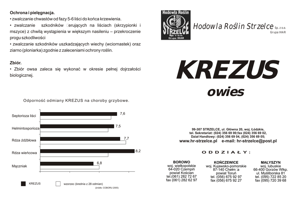 Ochrona i pielęgnacja. • zwalczanie chwastów od fazy 5-6 liści do końca krzewienia. • zwalczanie szkodników żerujących na liściach (skrzypionki i mszyce) z chwilą wystąpienia w większym nasileniu – przekroczenie progu szkodliwości • zwalczanie szkodników uszkadzających wiechy (wciornastek) oraz ziarno (ploniarka) zgodnie z zaleceniami ochrony roślin. Zbiór. • Zbiór owsa zaleca się wykonać w okresie pełnej dojrzałości biologicznej. Hodowla Roślin Strzelce KREZUS owies Odporność odmiany KREZUS na choroby grzybowe. 7,6 Septorioza liści 7,5 Helmintosporioza www.hr-strzelce.pl 8,2 Rdza wieńcowa 6,8 KREZUS 99-307 STRZELCE, ul. Główna 20, woj. Łódzkie, tel. Sekretariat: (024) 356 69 00;fax (024) 356 69 02, Dział Handlowy: (024) 356 69 04, (024) 356 69 05; 7,7 Rdza źdźbłowa Mączniak Sp. z o.o. Grupa IHAR wzorzec (średnia z 28 odmian) (źródło: COBORU 2005) e-mail: [email protected] O D D Z I A Ł Y : BOROWO woj. wielkopolskie 64-020 Czempiń powiat Kościan tel.(061) 282 72 67 fax (061) 282 62 97 KOŃCZEWICE woj. Kujawsko-pomorskie 87-140 Chełmża powiat Toruń tel. (056) 675 92 97 fax (056) 675 92 27 MAŁYSZYN woj. lubuskie 66-400 Gorzów Wlkp. ul. Myśliborska 81 tel. (095) 722 85 20 fax (095) 720 39 68 Owies KREZUS Zarejestrowane w 2005 r. Charakterystyka odmiany: • bardzo dobre plonowanie na terenie całego kraju 103 % wzorca ( 68,2 dt/ha ) w latach 2003-2005 • odmiana średnio-wczesna • rośliny średnio-wysokie o bardzo dużej odporności na wyleganie • duża odporność na rdzę wieńcową i helmintosporiozę • odmiana żółtoziarnista • ziarno o dużej masie 1000 ziaren ( +2,5 g powyżej wzorca) • duża zawartość tłuszczu • średnia gęstość w stanie zsypnym • wysoka tolerancja na niskie pH gleby Zalecenia agrotechniczne: Wymagania glebowe. • Owies jest gatunkiem o mniejszych, w porównaniu z innymi zbożami, wymaganiach glebowych. • Udaje się prawie na wszystkich glebach, które dobrze utrzymują wodę, lecz nie są podmokłe. • Wrażliwość owsa na odczyn gleby jest niewielka. Jednak wysokie plony, a szczególnie wyższą efektywność nawożenia mineralnego, można uzyskać tylko na glebach o pH powyżej 5,5. Zatem gleby silnie zakwaszone należy wapnować. Przedplon • Najlepszymi przedplonami dla owsa są okopowe na oborniku oraz strączkowe. Jednak w praktyce najczęściej uprawiany jest po zbożach. Przy wyborze stanowiska należy jednak pamiętać o dużych wymaganiach wodnych owsa. Nawożenie. • Zależnie od zawartości przyswajalnych składników pokarmowych w glebie dawki fosforu mogą wynosić 40 – 50 kg P2O5 / ha, a potasu 60 – 100 kg K2O / ha. • Nawożenie azotowe zależne jest od przedplonu, zasobności gleby i przewidywanego plonu. Szczególnie na glebach lżejszych, uboższych w składniki pokarmowe owies silnie reaguje na nawożenie azotem. Niedobór tego składnika w glebie odbija się ujemnie na wysokości i jakości plonu. • Pozytywnie reaguje na nawożenie azotem w dawce od 50 do 100 kg/ha zależnie od potrzeb nawozowych, przy czym zastosowanie powyżej 50 kg N/ha wymaga zazwyczaj podziału na trzy części (ok. 1/3 dawki przedsiewnie, 1/3 dawki pogłównie w fazie strzelania w źdźbło i 1/3 w fazie wyrzucania wiech – co zwiększa zawartość białka w ziarnie). Siew • Owies jest zbożem reagującym dużym spadkiem plonu na opóźnienie siewu. Stąd też należy go wysiewać możliwie jak najwcześniej. Wówczas rośliny lepiej wykorzystują zapasy wody zimowej oraz silniej ukorzeniają się, co umożliwia im intensywniejszy wzrost w razie wystąpienia suszy w późniejszym okresie. Ponadto przy wczesnym siewie rośliny są mniej atakowane przez ploniarkę. Ilość wysiewu 4 - 5,5 mln ziaren/ha, co odpowiada wagowo ok.180-220 kg/ha.