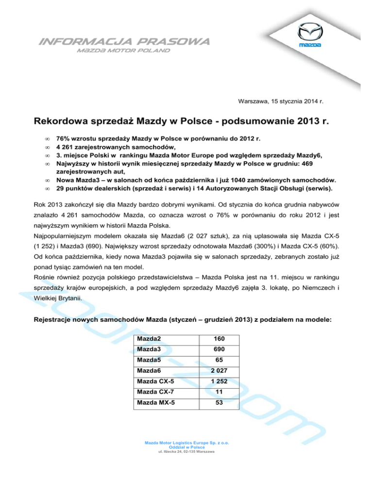 Warszawa, 15 stycznia 2014 r. Rekordowa sprzedaż Mazdy w Polsce - podsumowanie 2013 r. • • • • • • 76% wzrostu sprzedaży Mazdy w Polsce w porównaniu do 2012 r. 4 261 zarejestrowanych samochodów, 3. miejsce Polski w rankingu Mazda Motor Europe pod względem sprzedaży Mazdy6, Najwyższy w historii wynik miesięcznej sprzedaży Mazdy w Polsce w grudniu: 469 zarejestrowanych aut, Nowa Mazda3 – w salonach od końca października i już 1040 zamówionych samochodów. 29 punktów dealerskich (sprzedaż i serwis) i 14 Autoryzowanych Stacji Obsługi (serwis). Rok 2013 zakończył się dla Mazdy bardzo dobrymi wynikami. Od stycznia do końca grudnia nabywców znalazło 4 261 samochodów Mazda, co oznacza wzrost o 76% w porównaniu do roku 2012 i jest najwyższym wynikiem w historii Mazda Polska. Najpopularniejszym modelem okazała się Mazda6 (2 027 sztuk), za nią uplasowała się Mazda CX-5 (1 252) i Mazda3 (690). Największy wzrost sprzedaży odnotowała Mazda6 (300%) i Mazda CX-5 (60%). Od końca października, kiedy nowa Mazda3 pojawiła się w salonach sprzedaży, zebranych zostało już ponad tysiąc zamówień na ten model. Rośnie również pozycja polskiego przedstawicielstwa – Mazda Polska jest na 11. miejscu w rankingu sprzedaży krajów europejskich, a pod względem sprzedaży Mazdy6 zajęła 3. lokatę, po Niemczech i Wielkiej Brytanii. Rejestracje nowych samochodów Mazda (styczeń – grudzień 2013) z podziałem na modele: Mazda2 160 Mazda3 690 Mazda5 65 Mazda6 2 027 Mazda CX-5 1 252 Mazda CX-7 11 Mazda MX-5 53 Mazda Motor Logistics Europe Sp. z o.o. Oddział w Polsce ul. Iłżecka 24, 02-135 Warszawa Rok 2013 okazał się dla Mazdy rekordowy pod wieloma względami – najwyższa sprzedaż polskiego przedstawicielstwa i sukces najnowszych modeli – Mazdy CX-5, Mazdy6 i Mazdy3, które śmiało konkurują z markami premium i wygrywają testy porównawcze. Cieszy nas ogromnie rosnąca znajomość marki i zainteresowanie również ze strony klientów instytucjonalnych. Mazda od zawsze przełamuje konwencje i stara się działać w innowacyjny sposób na każdym etapie - od projektowania, przez produkcję, sprzedaż aż po działania marketingowe i sieć dealerską. Ta strategia jak widać przynosi efekty i zdobywa uznanie klientów również w Polsce – podkreśla Łukasz Paździor, dyrektor zarządzający Mazda Motor Poland. ### Kontakt: Magdalena Węglewska tel. 606 600 260 e-mail: [email protected] strona prasowa: www.mazda-press.pl Mazda Motor Logistics Europe Sp. z o.o. Oddział w Polsce ul. Iłżecka 24, 02-135 Warszawa