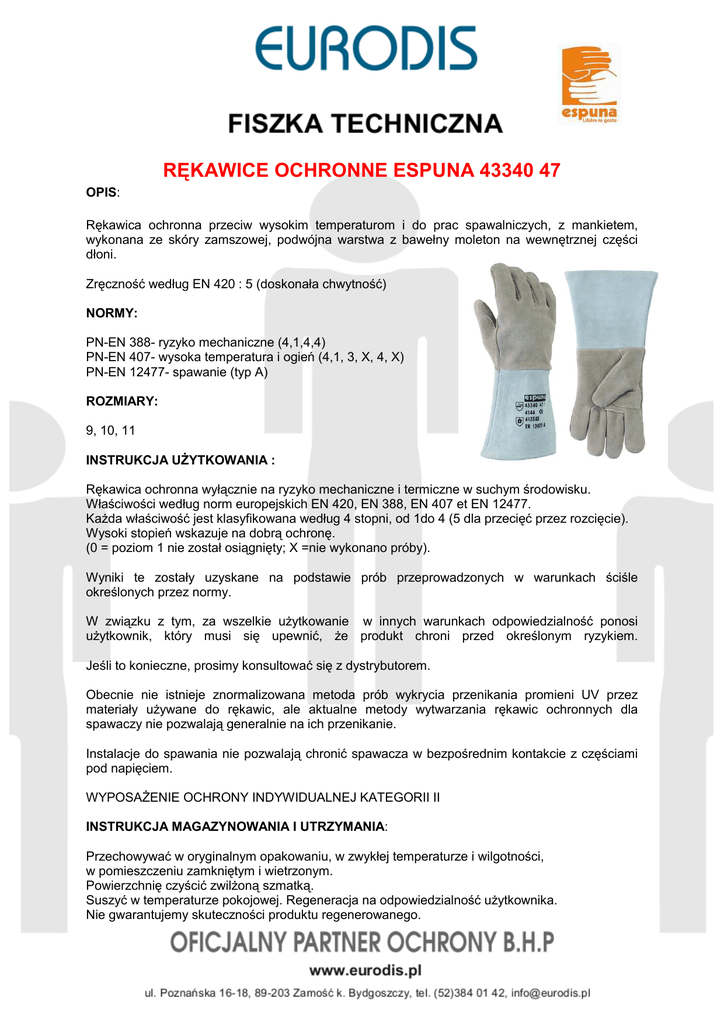RĘKAWICE OCHRONNE ESPUNA 43340 47 OPIS: Rękawica ochronna przeciw wysokim temperaturom i do prac spawalniczych, z mankietem, wykonana ze skóry zamszowej, podwójna warstwa z bawełny moleton na wewnętrznej części dłoni. Zręczność według EN 420 : 5 (doskonała chwytność) NORMY: PN-EN 388- ryzyko mechaniczne (4,1,4,4) PN-EN 407- wysoka temperatura i ogień (4,1, 3, X, 4, X) PN-EN 12477- spawanie (typ A) ROZMIARY: 9, 10, 11 INSTRUKCJA UŻYTKOWANIA : Rękawica ochronna wyłącznie na ryzyko mechaniczne i termiczne w suchym środowisku. Właściwości według norm europejskich EN 420, EN 388, EN 407 et EN 12477. Każda właściwość jest klasyfikowana według 4 stopni, od 1do 4 (5 dla przecięć przez rozcięcie). Wysoki stopień wskazuje na dobrą ochronę. (0 = poziom 1 nie został osiągnięty; X =nie wykonano próby). Wyniki te zostały uzyskane na podstawie prób przeprowadzonych w warunkach ściśle określonych przez normy. W związku z tym, za wszelkie użytkowanie w innych warunkach odpowiedzialność ponosi użytkownik, który musi się upewnić, że produkt chroni przed określonym ryzykiem. Jeśli to konieczne, prosimy konsultować się z dystrybutorem. Obecnie nie istnieje znormalizowana metoda prób wykrycia przenikania promieni UV przez materiały używane do rękawic, ale aktualne metody wytwarzania rękawic ochronnych dla spawaczy nie pozwalają generalnie na ich przenikanie. Instalacje do spawania nie pozwalają chronić spawacza w bezpośrednim kontakcie z częściami pod napięciem. WYPOSAŻENIE OCHRONY INDYWIDUALNEJ KATEGORII II INSTRUKCJA MAGAZYNOWANIA I UTRZYMANIA: Przechowywać w oryginalnym opakowaniu, w zwykłej temperaturze i wilgotności, w pomieszczeniu zamkniętym i wietrzonym. Powierzchnię czyścić zwilżoną szmatką. Suszyć w temperaturze pokojowej. Regeneracja na odpowiedzialność użytkownika. Nie gwarantujemy skuteczności produktu regenerowanego.