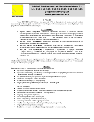96-500 Sochaczew, ul. Kozubowskiego 31 tel. 606-115-049, 604-95-2005, 606-340-663 [email protected] www.projektant.biz O FIRMIE Firma "PROJEKTANT" istnieje na rynku od 1993 r. Zajmujemy się m.in. przygotowaniem dokumentacji technicznej dla przedsięwzięć budowlanych, wykonaniem projektów technologicznych oraz projektowaniem konstrukcji mechanicznych. NASZ ZESPÓŁ mgr inż. Janusz Szczepaniak - właściciel - uprawnienia budowlane do kierowania robotami budowlanymi bez ograniczeń w specjalności konstrukcyjno-budowlanej oraz do projektowania w specjalności architektonicznej oraz konstrukcyjno-budowlanej. Uprawnienia do zajmowania się eksploatacją urządzeń i sieci grup: 1, 2, 3 na stanowisku dozoru w zakresie obsługi, konserwacji, remontów, montażu, kontrolno-pomiarowym, mgr inż. Maria Czarkowska - uprawnienia budowlane do projektowania bez ograniczeń w specjalności konstrukcyjno-budowlanej, mgr inż. Bartosz Szczepaniak - uprawnienia budowlane do projektowania i kierowania robotami budowlanymi bez ograniczeń w specjalności konstrukcyjno-budowlanej, mgr inż. Paweł Szczepaniak - projektowanie i eksploatacja w zakresie mechanika i budowa maszyn. Uprawnienia do zajmowania się eksploatacją urządzeń i sieci grup: 1, 2, 3 na stanowisku dozoru w zakresie obsługi, konserwacji, remontów, montażu, kontrolnopomiarowym, Współpracujemy także z projektantami w innych specjalnościach oraz z ekspertami Wojskowej Akademii Technicznej. Kilku pracowników firmy posiada poświadczenia bezpieczeństwa upoważniające do dostępu do informacji niejawnych. OFERTA Świadczymy usługi na każdym etapie procesu budowlanego tzn.: wykonanie kompletnego projektu budowlanego, wykonanie dokumentacji projektowej - kosztorysy inwestorskie, specyfikacje techniczne wykonania i odbioru robót, projekty wykonawcze, przygotowanie inwestycji - pomoc w uzyskaniu decyzji administracyjnych, kierowanie budową oraz nadzór inwestorski, świadectwa charakterystyki energetycznej, projekty konstrukcji żelbetowych, stalowych i drewnianych. Ponadto oferujemy: kontrole okresowe obiektów budowlanych, ekspertyzy budowlane - badania młotkiem Schmidta, badania stopnia zawilgocenia, opinie techniczne z zakresu mechaniki i budowy maszyn, programy funkcjonalno-użytkowe, inwentaryzacje budowlane i instalacyjne, pomoc w legalizacji samowoli budowlanych, kosztorysy zamienne, ofertowe, powykonawcze, projekty technologiczne dla zakładów produkcyjnych, usługowych, projekty konstrukcji mechanicznych, doradztwo z obszaru prawa budowlanego i przepisów wykonawczych, 96-500 Sochaczew, ul. Kozubowskiego 31 tel. 606-115-049, 604-95-2005, 606-340-663 [email protected] www.projektant.biz ZAPRASZAMY DO WSPÓŁPRACY Pracujemy na licencjonowanym oprogramowaniu firm: Norma PRO - przedmiary robót, kosztorysy AutoCAD LT PL - dokumentacja rysunkowa ArCADia - INTELLICAD 7 Premium PL - dokumentacja rysunkowa R3D3-Rama 3D 14 - obliczenia statyczne EuroŻelbet dla R3D3 - projektowanie konstrukcji żelbetowych EuroStal dla R3D3 - projektowanie konstrukcji stalowych EuroDrewno dla R3D3 - projektowanie konstrukcji drewnianych KONSTRUKTOR 6.4:- zbieranie obciążeń, fundamenty bezpośrednie, ściany oporowe żelbetowe, konstrukcje murowe ArCADia - TERMO 4 - świadectwa charakterystyki energetycznej PlaTo 4 - żelbetowe układy płytowe ArCADia – ARCHITEKTURA 6.2 - projekty architektoniczne z wizualizacjami 3D GRAITEC ADVANCE STEEL 2014 - modelowanie 3D konstrukcji stalowych, dokumentacja warsztatowa SolidWORKS 2015 - modelowanie 3D konstrukcji mechanicznych, dokumentacja wykonawcza części PROJEKTUJEMY WEDŁUG NAJNOWSZYCH POLSKICH NORM PN-EN (EUROKODY) !!! WYKONUJEMY PROJEKTY WARSZTATOWE WRAZ Z DETALOWANIEM WSZELKICH KONSTRUKCJI STALOWYCH (hale, obiekty przemysłowe) !!!