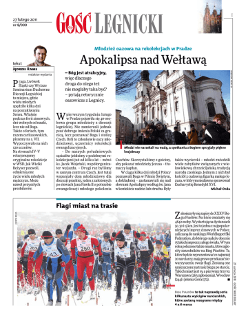 I 27 lutego 2011 nr 8/000 Młodzież oazowa na rekolekcjach w Pradze redaktor wydania P raga, Lwówek Śląski czy Wyższe Seminarium Duchowne Diecezji Legnickiej to miejsca, gdzie wielu młodych spędziło kilka dni na poszukiwaniu Sensu. Właśnie podczas ferii zimowych, dni wolnych od nauki, lecz nie od Boga. Także o feriach, tym razem caritasowskich, piszemy na s. VII. Wypoczywało na nich 120 uczniów. Na stronach IV–V relacjonujemy oryginalne rekolekcje w WSD. Jak Wielki Reżyser pozwoli, odmienią one życie wielu młodych mężczyzn. Może nawet przyszłych prezbiterów. Apokalipsa nad Wełtawą – Bóg jest atrakcyjny, więc dlaczego droga do niego też nie mogłaby taka być? – pytają retorycznie oazowicze z Legnicy. ks. Jacek Wojeński tekst Jędrzej Rams W pierwszym tygodniu lutego w Pradze pojawiła się 40-osobowa grupa młodzieży z diecezji legnickiej. Nie zamierzali jednak psuć dobrego imienia Polski za granicą, lecz poznawać Boga i stolicę Czech. Byli to członkowie oazy młodzieżowej, uczestnicy rekolekcji ewangelizacyjnych. – Do naszych południowych sąsiadów jeździmy z podobnymi rekolekcjami już od kilku lat – mówi ks. Jacek Wojeński, współorganizator wyjazdu. – Drugi raz byliśmy w samym centrum Czech. Jest tutaj wspaniały dom młodzieżowy dla diecezji praskiej, jeden z założonych po słowach Jana Pawła II o potrzebie ewangelizacji młodego pokolenia Młodzi nie narzekali na nudę, a spotkaniu z Bogiem sprzyjały piękne krajobrazy Czechów. Skorzystaliśmy z gościny, aby pokazać młodzieży Jezusa – tłumaczy kapłan. W ciągu kilku dni młodzi Polacy poznawali Boga w Piśmie Świętym, a dokładniej – zastanawiali się nad słowami Apokalipsy według św. Jana w kontekście nadziei lub strachu. Były Jędrzej Rams Flagi miast na trasie także wycieczki – młodzi zwiedzili wiele zabytków związanych z wielowiekową chrześcijańską tradycją narodu czeskiego. Jednym z nich był kościół z cudowną figurką małego Jezusa, w którym niedawno sprawował Eucharystię Benedykt XVI. Michał Orda Z Bieg Piastów to tak naprawdę seria kilkunastu wyścigów narciarskich, które zostaną rozegrane między 4 a 6 marca 27 lutego 2011 Gość Niedzielny akończyły się zapisy do XXXV Biegu Piastów. Na liście znalazły się 4842 osoby. Wystartują na dystansach 50, 30 i 15 km. Jest to jedna z najpopularniejszych imprez zimowych w Polsce, zaliczaną do rankingu Worldloppet Ski Federation, do którego należy obecnie 15 takich imprez z całego świata. W tym roku policzono także miasta, które zgłosiły zawodników na Bieg Piastów. Te, które będzie reprezentować co najmniej 20 narciarzy, mają prawo przekazać stowarzyszeniu swoje flagi. Zostaną one umieszczone na trasie biegu po starcie. Takich miast jest 19, a pierwsze trzy to: Warszawa (263 zgłoszenia), Wrocław (244) i Jelenia Góra (172). • II gość legnicki Roman Tomczak Piłkarze na start! Wśród najlepszych w ubiegłorocznej edycji było kilka drużyn z Dolnego Śląska (na zdj. w pomarańczowo-zielonych strojach) ponad 40 tys. piłkarek i piłkarzy, wśród nich młodzież z Gryfowa Śl., Lubina czy Ścinawy. Od lutego przyjmowane są zgłoszenia drużyn 10-latków i młodszych dzieci chcących przeżyć wielką piłkarską przygodę. Drużyny może zgłaszać trener lub nauczyciel. – Zespół może liczyć od 6 do maksymalnie 12 zawodników – dziewcząt lub chłopców. Każdy trener może zgłosić dowolną liczbę drużyn, dzięki czemu w rozgrywkach mogą wziąć udział wszystkie dzieci, które pasjonują się piłką nożną. Najłatwiej jest pobrać formularz zgłoszeniowy ze strony: www.zpodworkanastadion.pl – wyjaśnia Agnieszka Olejkowska, rzecznik turnieju. Pierwsze mecze rozpoczną się w połowie kwietnia. toro Orka prawie gotowa Lubań. Wierni parafii pw. Świętej Trójcy zorganizowali Jubileuszowy Bal Karnawałowy. W tym roku przypada 150. rocznica konsekracji świątyni parafialnej. Inicjatorem i organizatorem spotkania było Katolickie Stowarzyszenie Młodzieży wraz ze swoim opiekunem ks. Andrzejem Łuczyńskim. W balu wzięli udział m.in. ks. Jan Lombarski oraz burmistrz Lubania Arkadiusz Słowiński z żoną. Jak zapewniają uczestnicy balu, pomimo srogiego mrozu, atmosfera na sali od samego początku była bardzo gorąca. – Chęć spotkań i wspólnej zabawy jest w stanie Bolesławiec. Trwa budowa Regionalnego Centrum Rekreacyjnego – Krytej Pływalni Sportowo-Rekreacyjnej „Orka”. W połowie marca zaplanowano napełnianie wodą niecek basenowych, a następnie rozruch technologiczny oraz próby wszystkich urządzeń. Budowa rozpoczęła się w czerwcu 2009 r., realizowana jest w systemie „zaprojektuj i wybuduj”. Całkowita wartość projektu wynosi ponad 21 mln zł, z czego prawie 6 mln zł to dofinansowanie z Regionalnego Programu Operacyjnego Województwa Dolnośląskiego na lata 2007–13. Pozostałe pieniądze pochodzą z budżetu miasta. Funkcje pływalni są tak zaprojektowane, aby z kompleksu mogli korzystać zarówno użytkownicy indywidualni, jak i grupy zorganizowane. W obiekcie zaplanowano m.in. basen sportowy oraz rekreacyjny, karuzelę wodną, wodospad i zjeżdżalnię rodzinną. – Naszym pod stawow y m założeniem jest stworzenie obiektu o charakterze miejskim, który będzie łączył w sobie funkcje sportowe i rekreacyjne – mówi prezydent Bolesławca Piotr Roman. Obecnie trwają roboty wykończeniowe. Na kwiecień i maj zaplanowano odbiory i uzyskanie pozwolenia na użytkowanie obiektu. Wtedy też zaczną się prace budowlane przezwyciężyć niesprzyjające warunki – mówili. Po oficjalnej części zabawa nabrała prawdziwego, karnawałowego tempa. Bawiono się w kółku, wężyku i w parach. Zaskoczeniem dla uczestników był specjalny występ artysty „Andzina”, który brawurowo wykonał dwa wielkie przeboje – „Siedem dziewcząt z Albatrosa” oraz „Przeżyj to sam”. Inną atrakcją balu b