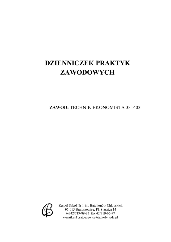 DZIENNICZEK PRAKTYK ZAWODOWYCH ZAWÓD: TECHNIK EKONOMISTA 331403 Zespól Szkół Nr 1 im. Batalionów Chłopskich 95-015 Bratoszewice, Pl. Staszica 14 tel.42/719-89-83 fax 42/719-66-77 e-mail:[email protected] 2 I. DANE OSOBOWE DOTYCZĄCE PRAKTYKANTA Nazwisko i imię ucznia ……………………………………………………………………. Klasa :……………………………………………....………….……………………………. Specjalizacja ………………………………………………………………………………... Rok szkolny ………………………………………………………………………………… adres………………………………………………………………………………………….. nr telefonu……………………………….., email: …………………………………………… Miejsce odbywania praktyki…………………………………………………………………… opiekun praktyk ………………………………………………………………………………… nr telefonu ………………………………..., email: ………………………………………...… termin odbywania praktyki…………………………………………………………………….. termin oddania dzienniczka praktyk……………………………………………………………. (tydzień po zakończeniu praktyk) 3 II. ZAŚWIADCZENIE O ODBYCIU PRAKTYKI dnia ………………………………… ……………………………………………. (nazwa i adres zakładu) Zaświadcza się, że ucz. ……………………………………………………………… kl………………………… Odbył/ła praktykę zawodową w ilości 80 godzin w terminie od………………………………………do…………………………………. Program praktyk został: - zrealizowany w całości*/ - nie zrealizowano punktu nr ………………..*/ W czasie praktyk z powierzonych obowiązków uczeń/uczennica wywiązywał/ła się: celująco, bardzo dobrze, dobrze, dostatecznie, dopuszczająco, niedostatecznie */. …………………………………………. Pieczęć i podpis ----------------------------------------------*/ właściwe podkreślić III. OCENA UCZNIA PO ODBYCIU PRAKTYK ZAWODOWYCH 1. Ocena opiekuna: ………………………………………………………………….. 2. Ocena przez szkołę: ocena za dzienniczek: ……………………………………………………... ocena za odpowiedź: ………………………………………………………. PRAKTYKĘ ZALICZONO NA OCENĘ: …………………………………………………….............................................................. DATA: …………………………………………………………………………......……... PODPISY KOMISJI: PRZEWODNOCZĄCY:………………………………………………………… CZŁONKOWIE:………………………………………………………………… …………………………………………………………………………. 4 IV. ZASADY PROWADZENIA DZIENNICZKA PRAKTYK l. Każdy praktykant zobowiązany jest do prowadzenia dzienniczka praktyk zawodowych. 2. Planowanie, prowadzenie i kontrolowanie prac w jednostce, jest szczególnie ważne w procesie kształcenia zawodowego, dlatego praktykant powinien interesować się i zajmować tymi wszystkimi pracami. 3. Praktykant musi umieć objaśnić co zapisał w dzienniczku. 4. Tygodniowe sprawozdania zapisane w dzienniczku praktyk zawodowych uczeń przedstawia opiekunowi do zatwierdzenia. 5. Dzienniczek podlega ocenie. Prawidłowe jego prowadzenie jest warunkiem zaliczenia praktyk i dopuszczenia do egzaminu z przygotowania zawodowego. 6. Dzienniczek należy prowadzić na bieżąco. Wgląd do dzienniczka praktyk zawodowych mają: przyjmujący na praktykę - opiekun oraz przedstawiciele szkoły 5 Program Praktyki zawodowej dla klasy II Technikum Ekonomicznego Nr programu 1/TE/12-13 Czas trwania 2 tygodnie (80 godzin) 1. Funkcjonowanie jednostki organizacyjnej Uczeń potrafi: określić zadania statutowe jednostki organizacyjnej, rozpoznać formę organizacyjno-prawną jednostki organizacyjnej, odczytać powiązania organizacyjne ze schematu struktury organizacyjnej. 2. Bezpieczeństwo i higiena pracy, ochrona przeciwpożarowa i zasady ochrony środowiska. Uczeń potrafi: określić zadania pracodawcy w zakresie ochrony zdrowia pracowników, zastosować obowiązujące regulaminy i przepisy bezpieczeństwa i higieny pracy oraz ochrony przeciwpożarowej. 3. Elementy kultury zawodowej Uczeń potrafi: dostosować wygląd zewnętrzny do sytuacji zawodowej, zastosować normy i reguły obyczajowe w kontaktach międzyludzkich, kształtować prawidłowe relacje z pracownikami, kontrahentami i innymi osobami współpracującymi z przedsiębiorstwem, 4. Zaopatrzenie oraz zbyt Uczeń potrafi: rozróżnić dokumenty sporządzane w fazie zaopatrzenia, sporządzać dokumenty występujące w praktyce gospodarczej w fazie zaopatrzenia, rozróżnić dokumenty sporządzane w fazie zbytu, sporządzać dokumenty występujące w praktyce gospodarczej fazy zbytu, rozróżnić dokumenty potwierdzające zdarzenia gospodarcze związane ze środkami pieniężnymi, sporządzać dokumenty związane ze środkami pieniężnymi. 5. Rozliczenie podatkowe Uczeń potrafi: zidentyfikować przepisy prawa w zakresie różnych podatków, rozróżniać rodzaje podatków, zaliczać podatki odprowadzane przez jednostkę organizacyjną, do właściwej grupy podatków według klasyfikacji podatków w polskim systemie podatkowym, zaliczać podatki odprowadzane przez jednostkę organizacyjną do podatków obciążających koszty działalności jednostki i zmniejszających wynik brutto jednostki, identyfikować podatki obciążające koszty działalności jednostk