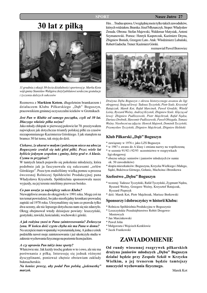 SPORT 30 lat z pi³k¹ Nasze Jutro 27 Hm Trudna sprawa. Uwzglêdniê mo¿e tylko takich zawodników, których widzia³em. Bramka: Józef M³ynarczyk. Stoper: W³adys³aw ¯muda. Obrona: Stefan Majewski, Waldemar Matysiak, Antoni Szymanowski. Pomoc: Henryk Kasperczak, Kazimierz Deyna, Zbigniew Boniek, Grzegorz Lato. Atak: W³odzimierz Lubañski, Robert Gadocha. Trener: Kazimierz Górski. rozmawia³ Pawe³ Borowiec 11 grudnia z okazji 30-lecia dzia³alnoci sportowej p. Marka Kota wójt gminy Stanis³aw Waligóra z³o¿y³ jubilatowi serdeczne gratulacje i ¿yczenia dalszych sukcesów Rozmowa z Markiem Kotem, d³ugoletnim bramkarzem i dzia³aczem Klubu Pi³karskiego D¹b Boguszyn, pracownikiem gminnej oczyszczalni cieków w Grotnikach Jest Pan w Klubie od samego pocz¹tku, czyli od 30 lat. Dlaczego w³anie pi³ka no¿na? Jako m³ody ch³opak w pierwszej po³owie lat 70. prze¿ywa³em najwiêksze jak dotychczas triumfy polskiej pi³ki za czasów niezapomnianego Kazimierza Górskiego. I jak stan¹³em na bramce 30 lat temu, tak stojê do dzi. Ciekawe, ¿e akurat w ma³ym i po³o¿onym nieco na uboczu Boguszynie zrodzi³ siê taki g³ód pi³ki. Przez wiele lat bylicie jedynym zespo³em z gminy, który gra³ w A klasie. Czemu to przypisaæ? W tamtych latach pojawi³o siê pokolenie m³odzie¿y, która podobnie jak ja fascynowa³a siê sukcesami or³ów Górskiego. Poza tym znalelimy wielk¹ pomoc u prezesa ówczesnej Rolniczej Spó³dzielni Produkcyjnej pana W³adys³awa Krysztofa. Spó³dzielnia sponsorowa³a nasze wyjazdy, na jej terenie mielimy pierwsze boisko. Co pan uwa¿a za najwiêkszy sukces Klubu? Niew¹tpliwie awans do okrêgówki w 1991 roku. Mogê co na ten temat powiedzieæ, bo jako nieoficjalny kronikarz prowadzê zapiski od 1978 roku. Utrzymalimy siê tam co prawda tylko dwa sezony, ale nic lepszego dotychczas nam siê nie zdarzy³o. Okrêg obejmowa³ wtedy dzisiejsze powiaty: leszczyñski, gostyñski, rawicki, kociañski, wschowski i górski. A jak rodzina znosi te Pana zainteresowania? Zw³aszcza ¿ona. W koñcu doæ czêsto chyba nie ma Pana w domu? Na szczêcie mam wspania³¹ i wyrozumia³¹ ¿onê. A jedna z córek podzieli³a nawet moje zainteresowania i ju¿ ukoñczy³a studia w zakresie wychowania fizycznego na poziomie licencjackim. A czy uprawia Pan tak¿e inne sporty? W³aciwie nie. Jak ka¿dy trochê gra³em w to i owo, ale nie ma porównania z pi³k¹. Interesujê siê jednak ró¿nymi dyscyplinami, poniewa¿ chêtnie obstawiam zak³ady bukmacherskie. Na koniec proszê, aby poda³ Pan polsk¹ jedenastkê marzeñ. Dru¿yna Dêbu Boguszyn z okresu historycznego awansu do ligi okrêgowej. Stoj¹ od lewej: Tadeusz Tyczyñski, Piotr Szulc, Krzysztof Ratajczak, Marek Kot, Rafa³ Marcinek, Pawe³ Grodzki, Witold Leny, Ryszard Wony, Andrzej Krystek, Zbigniew Szulc. Klêcz¹ od lewej: Zbigniew Pudliszewski, Piotr Majchrzak, Rafa³ Nêdza, Dariusz Drobnik, S³awomir Pudliszewski, Pawe³ Obiega³a, Tomasz Wony. Nieobecni na zdjêciu: Henryk Majorek, Dominik Tyczyñski, Przemys³aw Tyczyñski, Zbigniew Majchrzak, Zbigniew Heliñski Klub Pi³karski D¹b Boguszyn * zawi¹zany w 1976 r. jako LZS Boguszyn * w 1987 r. awans do A klasy i zmiana nazwy na wspó³czesn¹ * w sezonie 91/92 i 92/93 uczestnictwo w rozgrywkach ligi okrêgowej * obecne sekcje: seniorów i juniorów m³odszych (w sumie ok. 50 zawodników) * skupia mieszkañców: Boguszyna, Krzycka Wielkiego i Ma³ego, S¹dzi, Bukówca Górnego, Go³anic, Machcina i Bronikowa Szefostwo Dêbu Boguszyn * wczoraj: Tadeusz Tyczyñski, Rafa³ Tyczyñski, Zygmunt Nêdza, Ryszard Wony, Grzegorz Wony, Krzysztof Ratajczak, Ryszard Pieprzyk * dzi: Marek Kot, Piotr Majchrzak, Mariusz Borkowski Sponsorzy i dobroczyñcy w historii Klubu: * Rolnicza Spó³dzielnia Produkcyjna w Boguszynie * Leszczyñskie Przedsiêbiorstwo Robót DrogowoMostowych * Jan Marcinkowski * Pawe³ John * Ma³gorzata i Wojciech Kenklowie * Jacek Frankowski ZAWIADOMIENIE Od rundy wiosennej rozgrywek pi³karskich dru¿yna juniorów m³odszych Dêbu Boguszyn dzia³aæ bêdzie przy Zespole Szkó³ w Krzycku Wielkim, a jej trenerem bêdzie tamtejszy nauczyciel wychowania fizycznego. Marek Kot