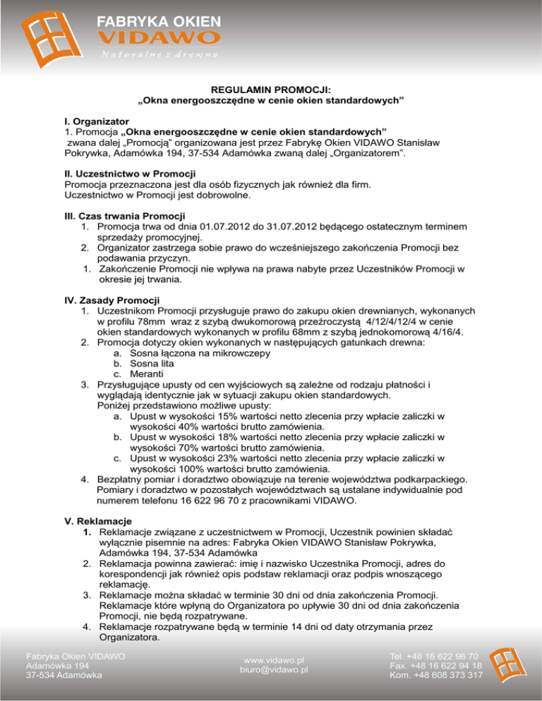 REGULAMIN PROMOCJI: „Okna energooszczędne w cenie okien standardowych” I. Organizator 1. Promocja „Okna energooszczędne w cenie okien standardowych” zwana dalej „Promocją” organizowana jest przez Fabrykę Okien VIDAWO Stanisław Pokrywka, Adamówka 194, 37-534 Adamówka zwaną dalej „Organizatorem”. II. Uczestnictwo w Promocji Promocja przeznaczona jest dla osób fizycznych jak również dla firm. Uczestnictwo w Promocji jest dobrowolne. III. Czas trwania Promocji 1. Promocja trwa od dnia 01.07.2012 do 31.07.2012 będącego ostatecznym terminem sprzedaży promocyjnej. 2. Organizator zastrzega sobie prawo do wcześniejszego zakończenia Promocji bez podawania przyczyn. 1. Zakończenie Promocji nie wpływa na prawa nabyte przez Uczestników Promocji w okresie jej trwania. IV. Zasady Promocji 1. Uczestnikom Promocji przysługuje prawo do zakupu okien drewnianych, wykonanych w profilu 78mm wraz z szybą dwukomorową przeźroczystą 4/12/4/12/4 w cenie okien standardowych wykonanych w profilu 68mm z szybą jednokomorową 4/16/4. 2. Promocja dotyczy okien wykonanych w następujących gatunkach drewna: a. Sosna łączona na mikrowczepy b. Sosna lita c. Meranti 3. Przysługujące upusty od cen wyjściowych są zależne od rodzaju płatności i wyglądają identycznie jak w sytuacji zakupu okien standardowych. Poniżej przedstawiono możliwe upusty: a. Upust w wysokości 15% wartości netto zlecenia przy wpłacie zaliczki w wysokości 40% wartości brutto zamówienia. b. Upust w wysokości 18% wartości netto zlecenia przy wpłacie zaliczki w wysokości 70% wartości brutto zamówienia. c. Upust w wysokości 23% wartości netto zlecenia przy wpłacie zaliczki w wysokości 100% wartości brutto zamówienia. 4. Bezpłatny pomiar i doradztwo obowiązuje na terenie województwa podkarpackiego. Pomiary i doradztwo w pozostałych województwach są ustalane indywidualnie pod numerem telefonu 16 622 96 70 z pracownikami VIDAWO. V. Reklamacje 1. Reklamacje związane z uczestnictwem w Promocji, Uczestnik powinien składać wyłącznie pisemnie na adres: Fabryka Okien VIDAWO Stanisław Pokrywka, Adamówka 194, 37-534 Adamówka 2. Reklamacja powinna zawierać: imię i nazwisko Uczestnika Promocji, adres do korespondencji jak również opis podstaw reklamacji oraz podpis wnoszącego reklamację. 3. Reklamacje można składać w terminie 30 dni od dnia zakończenia Promocji. Reklamacje które wpłyną do Organizatora po upływie 30 dni od dnia zakończenia Promocji, nie będą rozpatrywane. 4. Reklamacje rozpatrywane będą w terminie 14 dni od daty otrzymania przez Organizatora. VI. Postanowienia końcowe 1. Organizator zastrzega sobie prawo dokonywania zmian w niniejszym Regulaminie. 2. Zmienione warunki Regulaminu zostaną udostępnione na stronie internetowej www.vidawo.pl na 5 dni przed wejściem w życie zmienionego Regulaminu. 3. Zmiana warunków Regulaminu pozostanie bez wpływu na uprawnienia nabyte przed wejściem w życie takich zmian. 4. Treść niniejszego Regulaminu jest dostępna: a. W siedzibie Fabryki Okien VIDAWO Stanisław Pokrywka, Adamówka 194, 37-534 Adamówka b. na stronie www.vidawo.pl 5. Niniejszy Regulamin jest jedynym dokumentem określającym szczegółowe zasady Promocji.