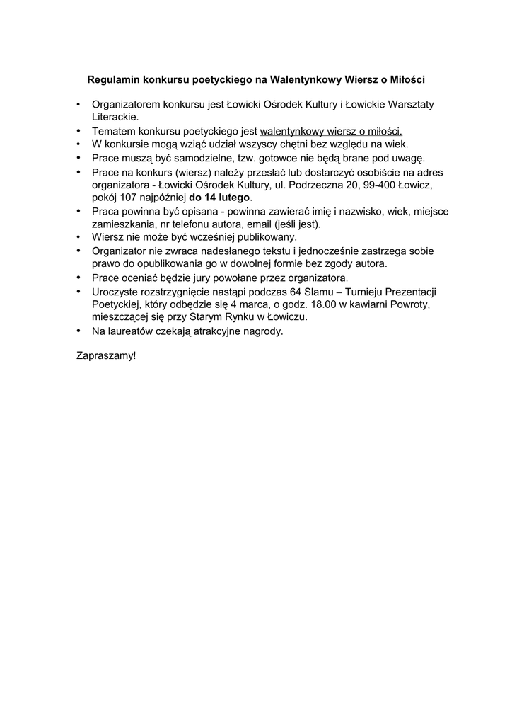 Regulamin konkursu poetyckiego na Walentynkowy Wiersz o Miłości • • • • • • • • • • • Organizatorem konkursu jest Łowicki Ośrodek Kultury i Łowickie Warsztaty Literackie. Tematem konkursu poetyckiego jest walentynkowy wiersz o miłości. W konkursie mogą wziąć udział wszyscy chętni bez względu na wiek. Prace muszą być samodzielne, tzw. gotowce nie będą brane pod uwagę. Prace na konkurs (wiersz) należy przesłać lub dostarczyć osobiście na adres organizatora - Łowicki Ośrodek Kultury, ul. Podrzeczna 20, 99-400 Łowicz, pokój 107 najpóźniej do 14 lutego. Praca powinna być opisana - powinna zawierać imię i nazwisko, wiek, miejsce zamieszkania, nr telefonu autora, email (jeśli jest). Wiersz nie może być wcześniej publikowany. Organizator nie zwraca nadesłanego tekstu i jednocześnie zastrzega sobie prawo do opublikowania go w dowolnej formie bez zgody autora. Prace oceniać będzie jury powołane przez organizatora. Uroczyste rozstrzygnięcie nastąpi podczas 64 Slamu – Turnieju Prezentacji Poetyckiej, który odbędzie się 4 marca, o godz. 18.00 w kawiarni Powroty, mieszczącej się przy Starym Rynku w Łowiczu. Na laureatów czekają atrakcyjne nagrody. Zapraszamy!