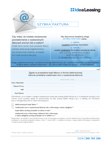 S Z Y B K A FA KT U R A Czy wiesz, ˝e mo˝esz otrzymywaç powiadomienie o wystawionych fakturach sms’em lub e-mailem? Dzi´ki temu numer oraz wysokoÊç faktury poznasz zaraz po jej wygenerowaniu, bez koniecznoÊci czekania, a˝ dojdzie do Ciebie pocztà tradycyjnà. Aby aktywowaç bezp∏atnà us∏ug´ SZYBKA FAKTURA nale˝y: 1. KROK wype∏niç poni˝szy formularz 2. KROK wys∏aç podpisany formularz pocztà na adres: Idea Leasing Spó∏ka Akcyjna sp. k. Dzia∏ Obs∏ugi Klienta ul. Strzegomska 42b, 53-611 Wroc∏aw Us∏uga wygenerowania kopii i przes∏ania jej drogà elektronicznà, jak i wys∏ania wiadomoÊci sms jest bezp∏atna. Orygina∏ faktury zostanie dostarczony – tak, jak to mia∏o miejsce do tej pory – pocztà tradycyjnà. Zgoda na przesy∏anie kopii faktury w formie elektronicznej lub/oraz przes∏ania wiadomoÊci sms o wystawionej fakturze ✁ miejscowoÊç / data . . . . . . . . . . . . . . . . . . . . . . . . . . . . . . . . . . . . . . Imi´ i Nazwisko ................................................................ Nazwa Firmy ................................................................ NIP ................................................................ Kod Klienta ................................................................ OÊwiadczam, ˝e w zwiàzku z us∏ugami Êwiadczonymi przez Idea Leasing Spó∏ka Akcyjna sp. k. na podstawie zawartej (-ych) umowy (-ów) wyra˝am zgod´ na otrzymywanie od Idea Leasing Spó∏ka Akcyjna sp. k. z siedzibà we Wroc∏awiu przy ul. Strzegomskiej 42b w celach informacyjnych: elektronicznych kopii faktur * wiadomoÊci sms o wystawionej fakturze lub z informacjà o stanie zaleg∏oÊci * kopie faktur prosz´ przesy∏aç na adres e-mail * . . . . . . . . . . . . . . . . . . . . . . . . . . . . . . . . . . . . . . . . . . . . . . . . . . . . . . . . . . . . . . . wiadomoÊç sms z informacjà o fakturze lub z informacjà o stanie zaleg∏oÊci prosz´ przesy∏aç na nr telefon nr * . . . . . . . . . . . . . . . . . . . . . . . . . . . . . . . . . . . . . . . . . . . . . . . . . . . . . . . . . Potwierdzam, ˝e zosta∏em (-am) poinformowany (-na), i˝ kopia faktury przesy∏ana w formie elektronicznej nie jest fakturà elektronicznà (e-fakturà) w rozumieniu przepisów Ustawy z dnia 11 marca 2004 r o podatku od towaru i us∏ug a jedynie informacjà o wystawieniu i wys∏aniu pocztà orygina∏u faktury. ................................................ *Prosz´ wybraç i wype∏niç w∏aÊciwe w w w. v b l e a s i n g . p l podpis i pieczàtka firmowa (podpis w∏aÊciciela lub osoby uprawnionej zgodnie z KRS)