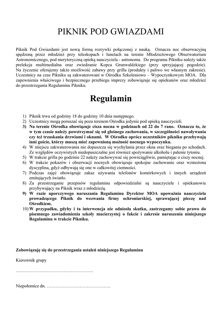 PIKNIK POD GWIAZDAMI Piknik Pod Gwiazdami jest nową formą rozrywki połączonej z nauką. Oznacza noc obserwacyjną spędzoną przez młodzież przy teleskopach i lunetach na terenie Młodzieżowego Obserwatorium Astronomicznego, pod merytoryczną opieką nauczyciela - astronoma. Do programu Pikniku należy także prelekcja multimedialna oraz zwiedzanie Kopca Grunwaldzkiego (przy sprzyjającej pogodzie). Na życzenie oferujemy także możliwość zabawy przy grillu (produkty i paliwo we własnym zakresie). Uczestnicy na czas Pikniku są zakwaterowani w Ośrodku Szkoleniowo – Wypoczynkowym MOA. Dla zapewnienia właściwego i bezpiecznego przebiegu imprezy zobowiązuje się opiekunów oraz młodzież do przestrzegania Regulaminu Pikniku. Regulamin 1) Piknik trwa od godziny 18 do godziny 10 dnia następnego. 2) Uczestnicy mogą poruszać się poza terenem Ośrodka jedynie pod opieką nauczycieli. 3) Na terenie Ośrodka obowiązuje cisza nocna w godzinach od 22 do 7 rano. Oznacza to, że w tym czasie należy powstrzymać się od głośnego zachowania, w szczególności nawoływania czy też trzaskania drzwiami i oknami. W Ośrodku oprócz uczestników pikniku przebywają inni goście, którzy muszą mieć zapewnioną możność nocnego wypoczynku. 4) W miejscu zakwaterowania nie dopuszcza się wychylania przez okna oraz biegania po schodach. Ze względów oczywistych niedopuszczalne jest również spożywanie alkoholu i palenie tytoniu. 5) W trakcie grilla po godzinie 22 należy zachowywać się powściągliwie, pamiętając o ciszy nocnej. 6) W trakcie pokazów i obserwacji nocnych obowiązuje spokojne zachowanie oraz wzmożona dyscyplina, gdyż odbywają się one w całkowitej ciemności. 7) Podczas zajęć obowiązuje zakaz używania telefonów komórkowych i innych urządzeń emitujących światło. 8) Za przestrzeganie przepisów regulaminu odpowiedzialni są nauczyciele i opiekunowie przybywający na Piknik wraz z młodzieżą. 9) W razie uporczywego naruszania Regulaminu Dyrektor MOA upoważnia nauczyciela prowadzącego Piknik do wezwania firmy ochroniarskiej, sprawującej pieczę nad Ośrodkiem. 10) W przypadku, gdyby i ta interwencja nie odniosła skutku, zastrzegamy sobie prawo do pisemnego zawiadomienia szkoły macierzystej o fakcie i zakresie naruszenia niniejszego Regulaminu w trakcie Pikniku. Zobowiązuję się do przestrzegania ustaleń niniejszego Regulaminu Kierownik grupy ……………………………………………. Niepołomice dn. …………………………………….