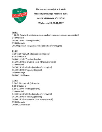 Harmonogramzajęćwtrakcie ObozuSportowegorocznika2001 MLKSJÓZEFOVIAJÓZEFÓW Wałbrzych20-26.02.2017 20.02 ~12:00Przyjazdpociągiemdoośrodkaizakwaterowaniewpokojach 14:00obiad 16:30-18:00Trening(boisko) 19:00kolacja 20:30spotkanieorganizacyjne(salakonferencyjna) 21.02 7:00-7:30rozruch(decyzjanamiejscu) 8:00śniadanie 10:00-11:30ITrening(boisko) 11:30-12:00rolowanie(salafitness/siłownia) 13:00Obiad 14:30-15:30taktyka(salakonferencyjna) 16:30-18:00IITrening(boisko) 19:00kolacja 20.00-21.00basen 22.02 7:00-7:30rozruch(siłownia) 8:00śniadanie 9.30-11:00ITrening(boisko) 13:00Obiad 14:30-15:30taktyka(salakonferencyjna) 16:30-18:00IITrening(boisko) 18:00-18:30rolowanie(salakinezyterapii) 19:00kolacja 20.00-21.00basen 23.02 7:00-7:30rozruch(decyzjanamiejscu) 8:00śniadanie 10:00-11:30ITrening(boisko) 11:30-12:00rolowanie(salafitness/siłownia) 13:00Obiad 14:30-15:30basen 15:00-18:00–gryizabawyintegracyjne,spacerpookolicy 19:00kolacja 20.00-21.00taktyka(salakonferencyjna) 24.02 6:45-7:15rozruch(decyzjanamiejscu) 7:30śniadanie 8:30-9:30ITrening(siłownia) 10:00-11:30ITrening(boisko) 13:00Obiad 14:30-15:30taktyka(salakonferencyjna) 16:30-18:00IITrening(boisko) 19:00kolacja 20.00-21.00basen 25.02 7:00-7:30rozruch(decyzjanamiejscu) 8:00śniadanie 9:30-10:30ITrening(siłownia) 10:30-11:30ITrening(boisko) 11:30-12:30rolowanie(siłownia/salafitness) 13:00Obiad 15:00-16:30IITrening(boisko) 17:30-18:30taktyka(salakonferencyjna) 19:00kolacja 20.00-21:30basen 26.02 7:00-7:30rozruch(decyzjanamiejscu) 8:00śniadanie 10.00-11:30ITrening(boisko) 13:00Obiad ~14powrótpociągiemdoWarszawy