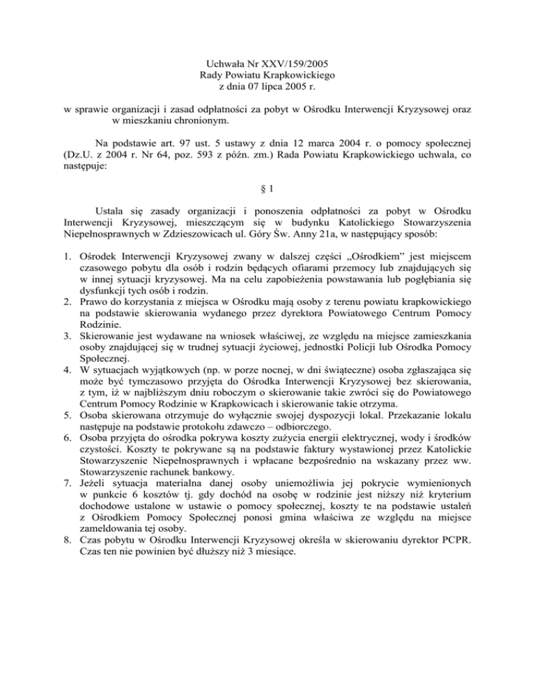 Uchwała Nr XXV/159/2005 Rady Powiatu Krapkowickiego z dnia 07 lipca 2005 r. w sprawie organizacji i zasad odpłatności za pobyt w Ośrodku Interwencji Kryzysowej oraz w mieszkaniu chronionym. Na podstawie art. 97 ust. 5 ustawy z dnia 12 marca 2004 r. o pomocy społecznej (Dz.U. z 2004 r. Nr 64, poz. 593 z późn. zm.) Rada Powiatu Krapkowickiego uchwala, co następuje: §1 Ustala się zasady organizacji i ponoszenia odpłatności za pobyt w Ośrodku Interwencji Kryzysowej, mieszczącym się w budynku Katolickiego Stowarzyszenia Niepełnosprawnych w Zdzieszowicach ul. Góry Św. Anny 21a, w następujący sposób: 1. Ośrodek Interwencji Kryzysowej zwany w dalszej części „Ośrodkiem” jest miejscem czasowego pobytu dla osób i rodzin będących ofiarami przemocy lub znajdujących się w innej sytuacji kryzysowej. Ma na celu zapobieżenia powstawania lub pogłębiania się dysfunkcji tych osób i rodzin. 2. Prawo do korzystania z miejsca w Ośrodku mają osoby z terenu powiatu krapkowickiego na podstawie skierowania wydanego przez dyrektora Powiatowego Centrum Pomocy Rodzinie. 3. Skierowanie jest wydawane na wniosek właściwej, ze względu na miejsce zamieszkania osoby znajdującej się w trudnej sytuacji życiowej, jednostki Policji lub Ośrodka Pomocy Społecznej. 4. W sytuacjach wyjątkowych (np. w porze nocnej, w dni świąteczne) osoba zgłaszająca się może być tymczasowo przyjęta do Ośrodka Interwencji Kryzysowej bez skierowania, z tym, iż w najbliższym dniu roboczym o skierowanie takie zwróci się do Powiatowego Centrum Pomocy Rodzinie w Krapkowicach i skierowanie takie otrzyma. 5. Osoba skierowana otrzymuje do wyłącznie swojej dyspozycji lokal. Przekazanie lokalu następuje na podstawie protokołu zdawczo – odbiorczego. 6. Osoba przyjęta do ośrodka pokrywa koszty zużycia energii elektrycznej, wody i środków czystości. Koszty te pokrywane są na podstawie faktury wystawionej przez Katolickie Stowarzyszenie Niepełnosprawnych i wpłacane bezpośrednio na wskazany przez ww. Stowarzyszenie rachunek bankowy. 7. Jeżeli sytuacja materialna danej osoby uniemożliwia jej pokrycie wymienionych w punkcie 6 kosztów tj. gdy dochód na osobę w rodzinie jest niższy niż kryterium dochodowe ustalone w ustawie o pomocy społecznej, koszty te na podstawie ustaleń z Ośrodkiem Pomocy Społecznej ponosi gmina właściwa ze względu na miejsce zameldowania tej osoby. 8. Czas pobytu w Ośrodku Interwencji Kryzysowej określa w skierowaniu dyrektor PCPR. Czas ten nie powinien być dłuższy niż 3 miesiące. §2 Ustala się zasady organizacji i ponoszenia odpłatności za pobyt w mieszkaniu chronionym, mieszczącym się w budynku Katolickiego Stowarzyszenie Niepełnosprawnych w Zdzieszowicach ul. Góry Św. Anny 21a, w następujący sposób: 1. Prawo do korzystania z miejsca w mieszkaniach chronionych mają usamodzielniający się wychowankowie placówek opiekuńczo – wychowawczych i rodzin zastępczych, którzy złożyli wniosek o przydział mieszkania we właściwym Urzędzie Miasta i Gminy. 2. Decyzję o przyznaniu miejsca w mieszkaniu chronionym wydaje dyrektor Powiatowego Centrum Pomocy Rodzinie na podstawie wywiadu środowiskowego, po uwzględnieniu i podpisaniu indywidualnego programu usamodzielnienia. 3. Czas pobytu w mieszkaniu chronionym określa w formie decyzji dyrektor Powiatowego Centrum Pomocy Rodzinie. Czas ten nie powinien być dłuższy niż 2 lata. 4. Osoby zamieszkujące w mieszkaniu chronionym ponoszą odpłatność za pobyt w zależności od posiadanego dochodu zgodnie z kryterium dochodowym ustalonym w ustawie o pomocy społecznej: a) dochód do 100% kryterium – pobyt bezpłatny, b) 101%-150% kryterium – odpłatność w wysokości 10% dochodu miesięcznie, c) 151%-200% kryterium – odpłatność w wysokości 15% dochodu miesięcznie, d) 201%-250% kryterium – odpłatność w wysokości 20% dochodu miesięcznie, e) powyżej 250% kryterium – odpłatność w wysokości 30% dochodu miesięcznie. 5. Za zużycie mediów tj. energii elektrycznej i wody opłaty będą rozliczane na podstawie zainstalowanych podliczników i uiszczane bezpośrednio na wskazany przez Katolickie Stowarzyszenie Niepełnosprawnych rachunek bankowy. §3 Wykonanie uchwały powierza się Staroście Powiatu Krapkowickiego. §4 Uchwała podlega ogłoszeniu na tablicy ogłoszeń Starostwa w Krapkowicach oraz w Dzienniku Urzędowym Województwa Opolskiego. Powiatowego §5 Uchwała wchodzi w życie po upływie 14 dni od dnia ogłoszenia w Dzienniku Urzędowym Województwa Opolskiego. Przewodniczący Rady Powiatu Krapkowickiego Krystian Komander